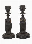 A matched pair of Irish bog oak candlesticks, carved in the form of owls standing on circular bases, displaying characteristic deep patination and fine feather detailing. 19th century.