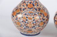 A decorative pair of Japanese porcelain bottle vases, each with tall slender neck and globular body, hand-painted in the traditional Imari palette of cobalt blue, iron red, and gilt with dense floral and foliate motifs.