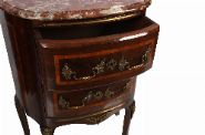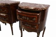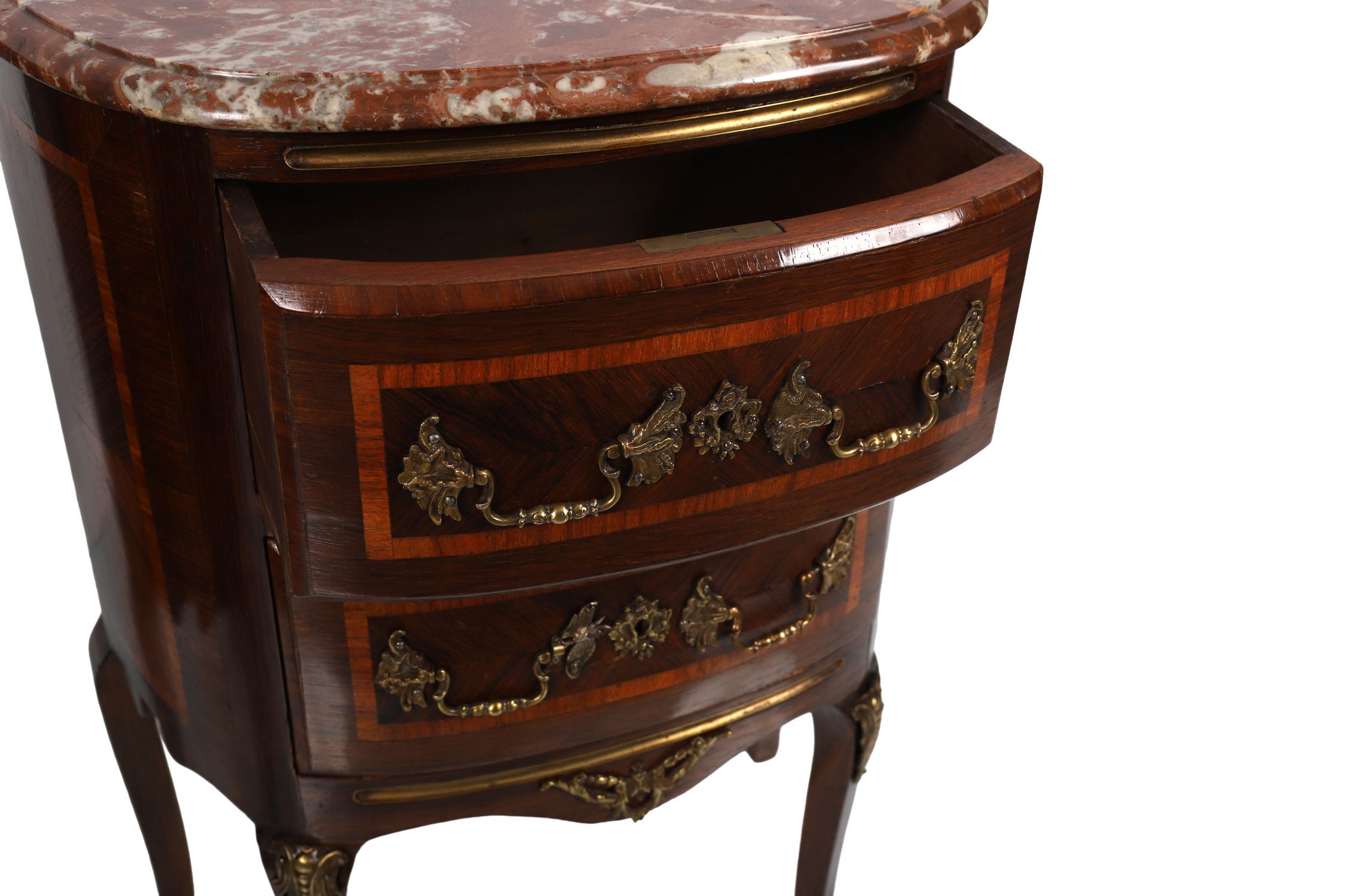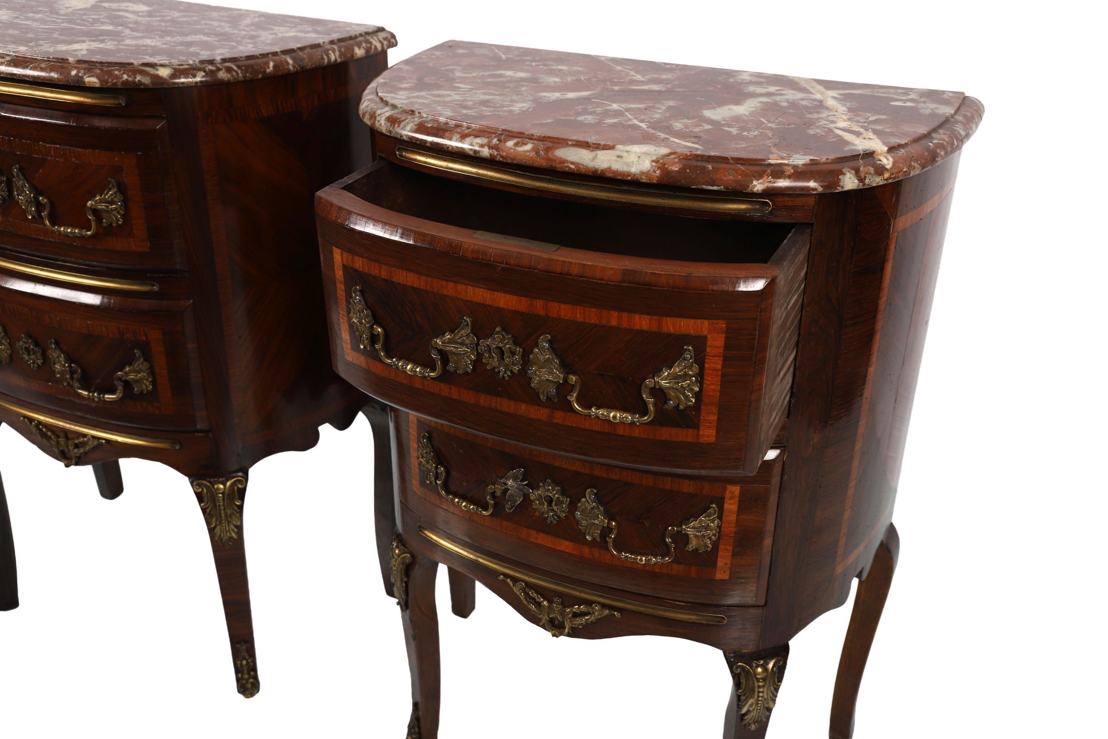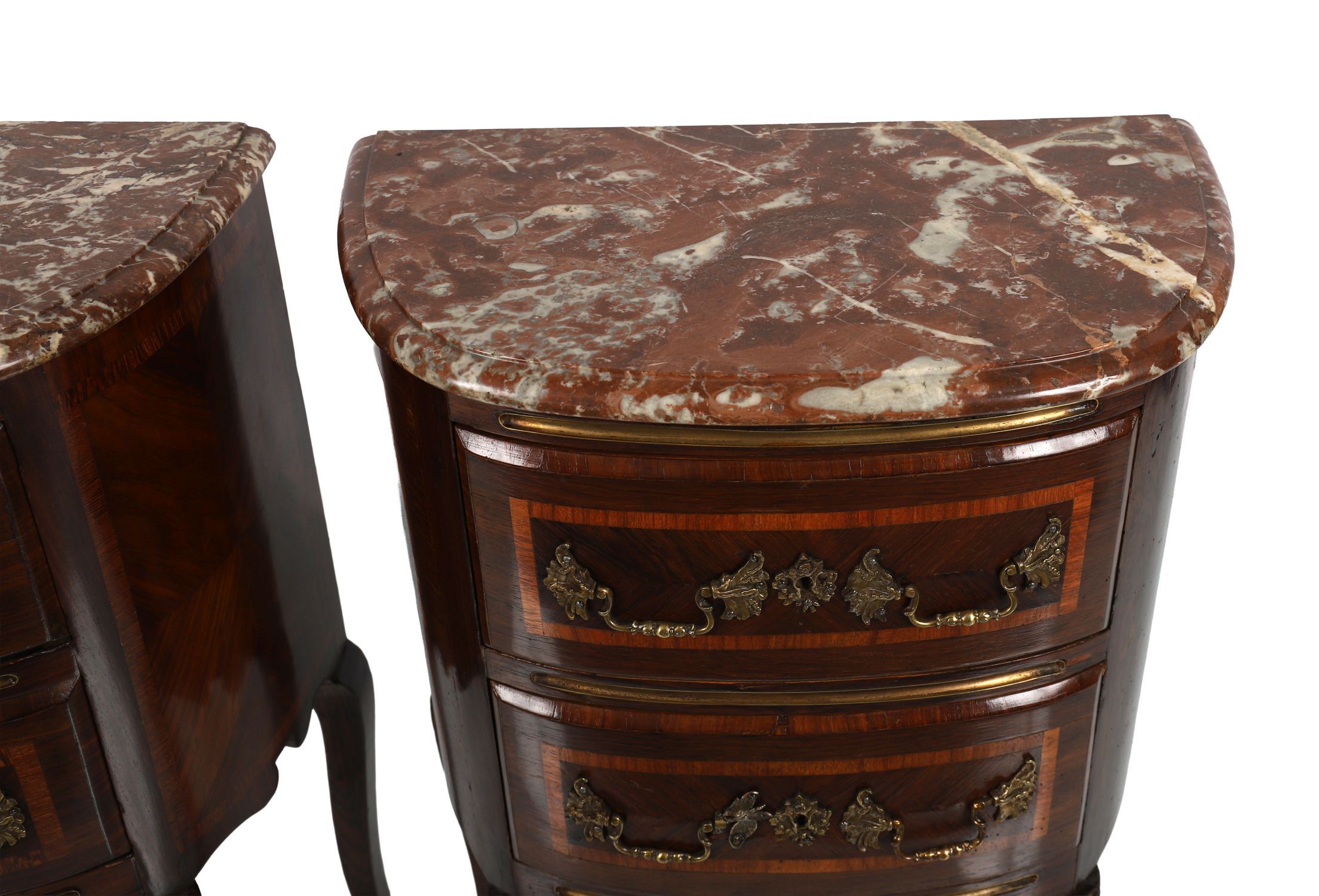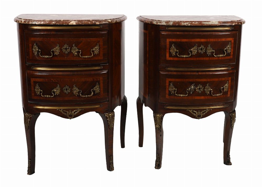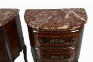 A pair of French kingwood and marquetry bombe commodes, each with shaped marble top, ormolu mounts, and floral marquetry to the fronts, fitted with two drawers.