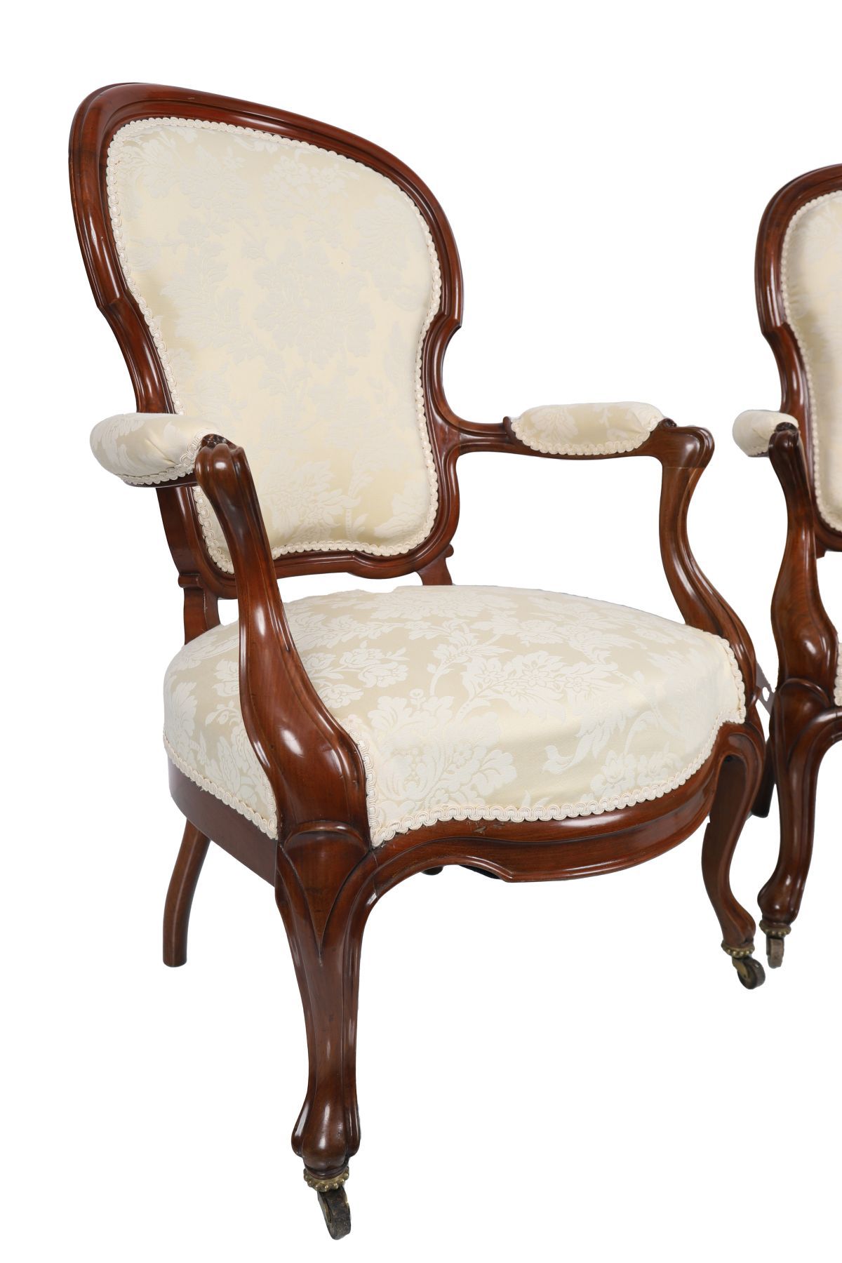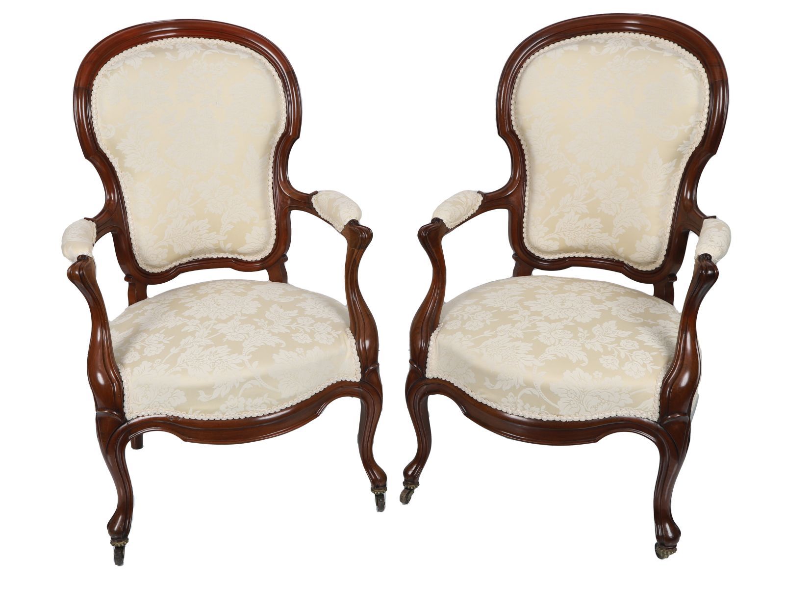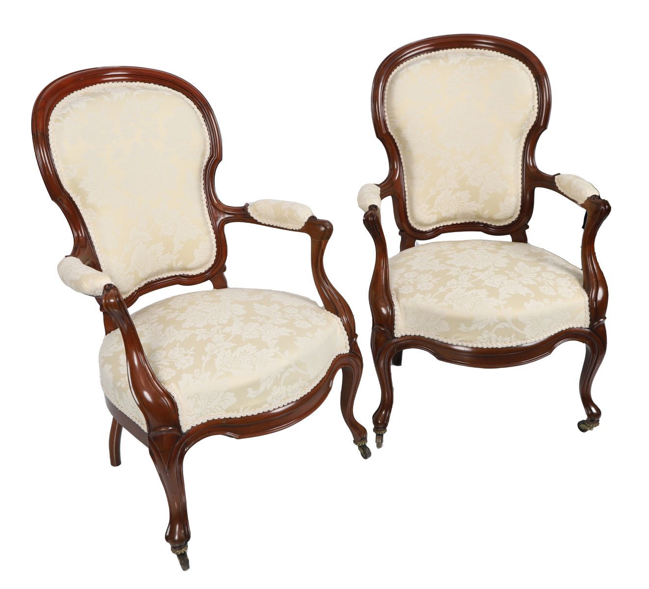 Each chair features a serpentine-fronted seat between scroll-fronted arms, raised on cabriole legs terminating on castors.