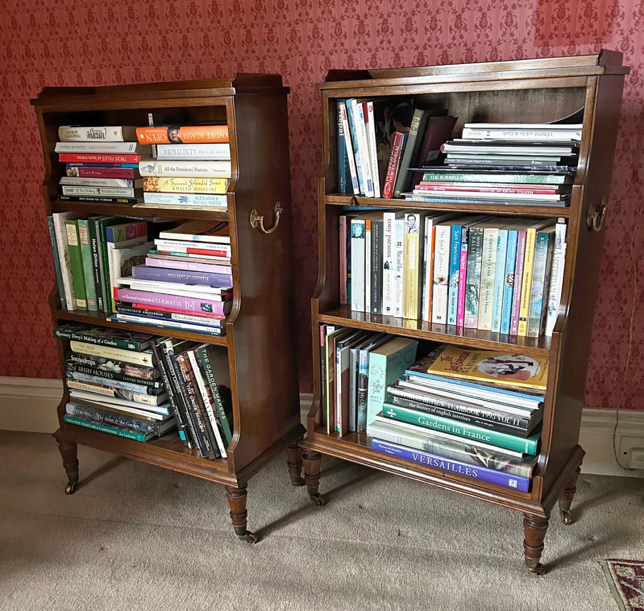 A matched pair of 19th-century mahogany open bookshelves, each with stepped waterfall sides, adjustable shelves, furnished with brass carrying handles, raised on turned legs.