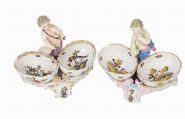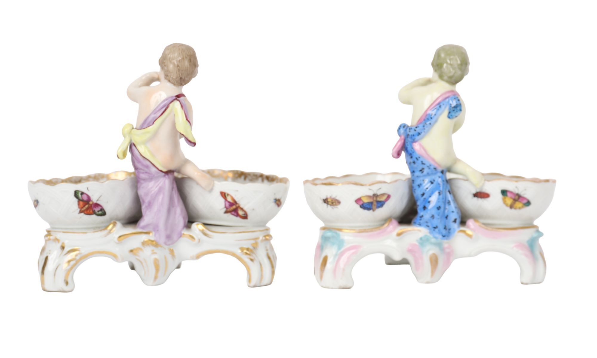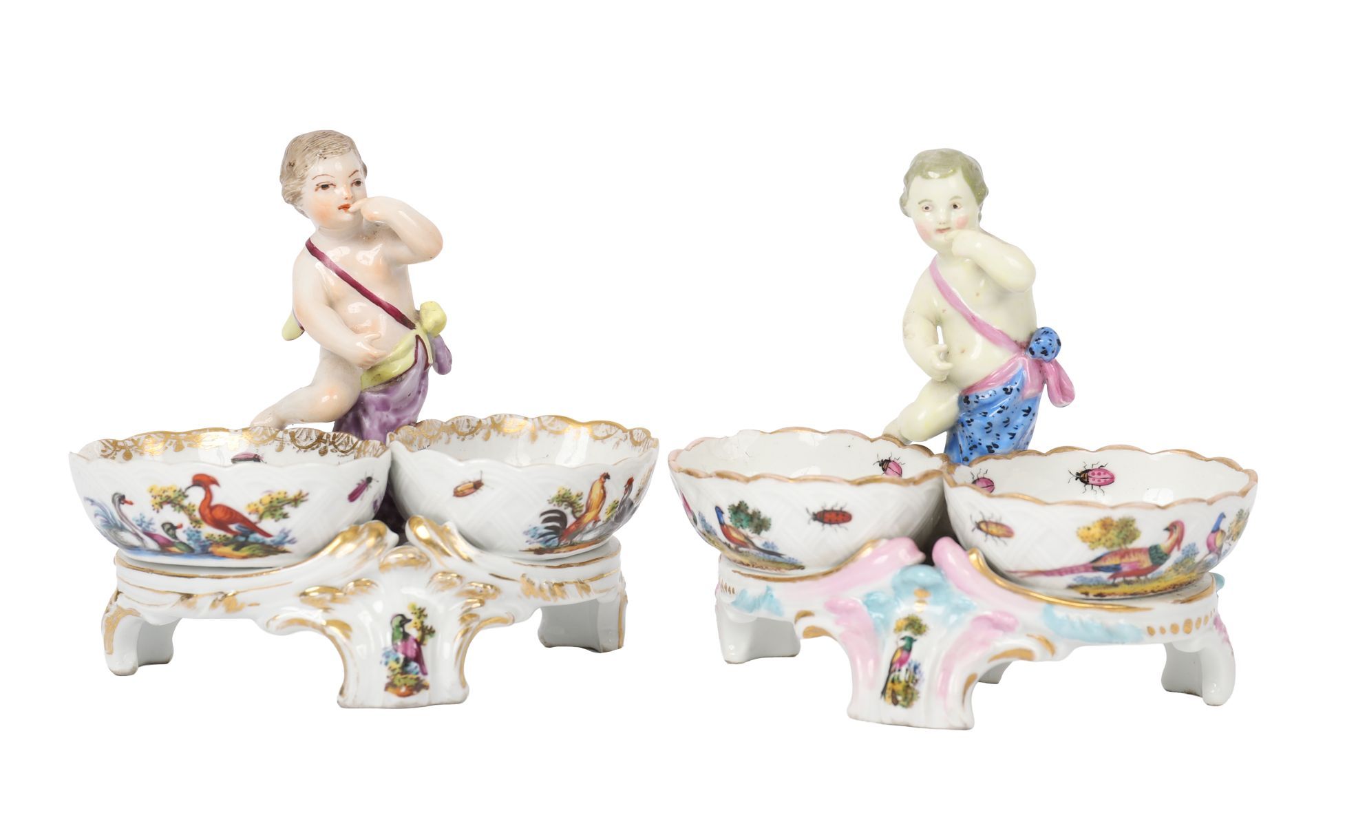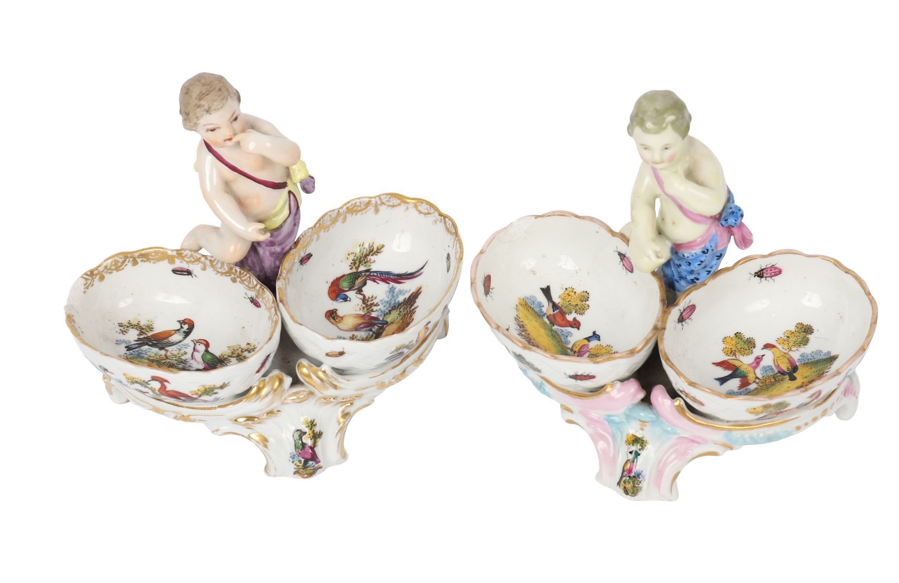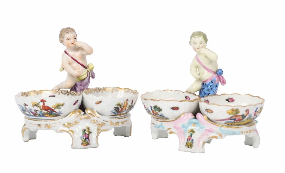 A pair of porcelain double salts, each modelled with a putto figure supporting twin gilt-edged bowls painted with birds and landscapes. Continental, 19th century, in the Meissen style.