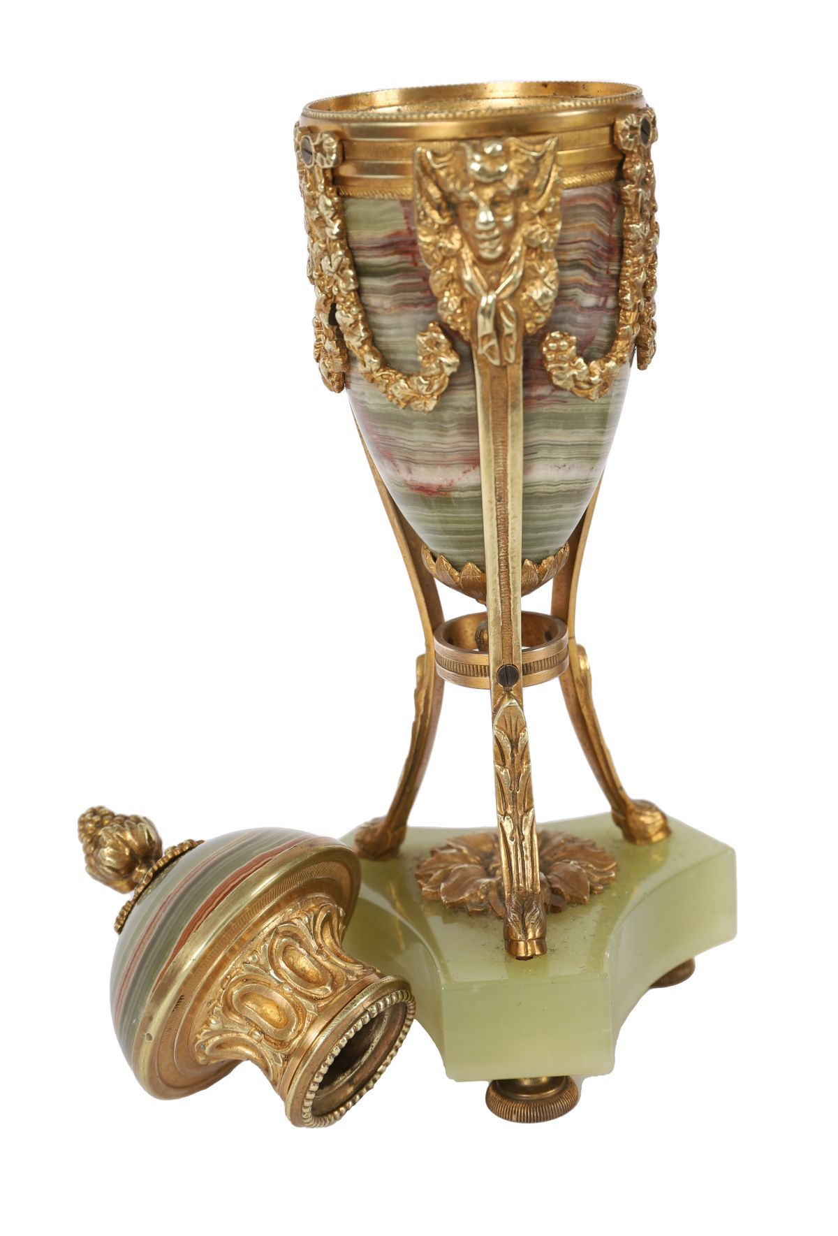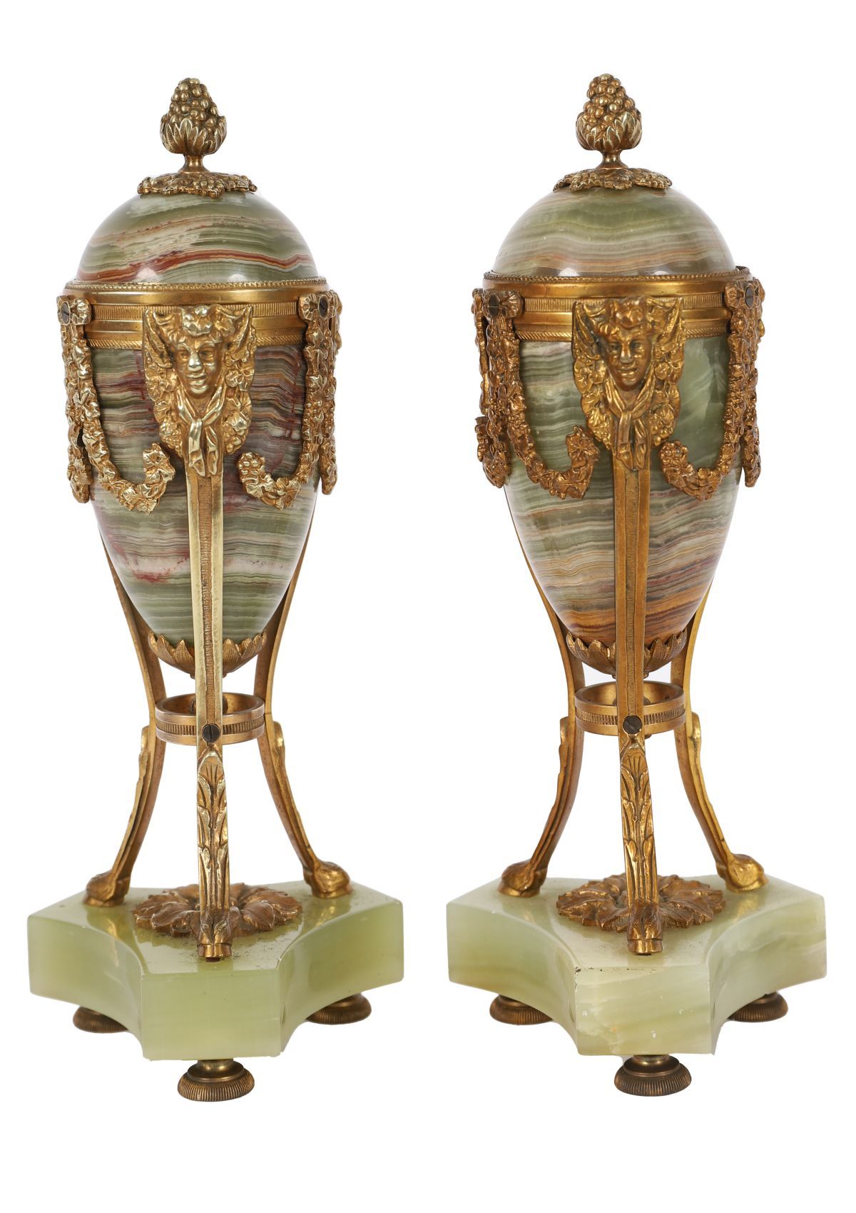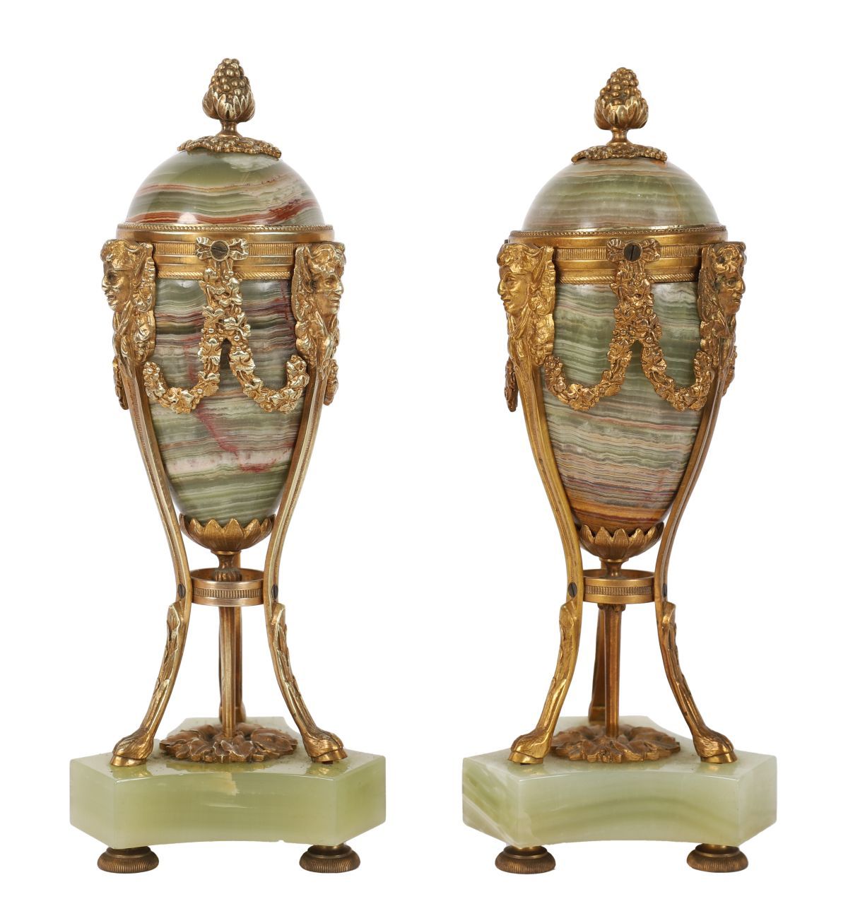 A pair of 19th-century ormolu and alabaster candlesticks, each with a classical urn-form stem mounted with mask and swag decoration, raised on a square alabaster base fitted with ormolu feet. Continental, 19th century.