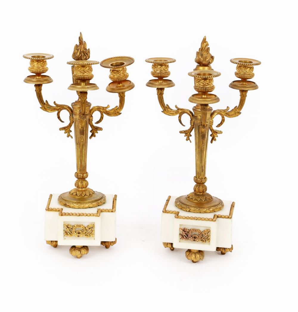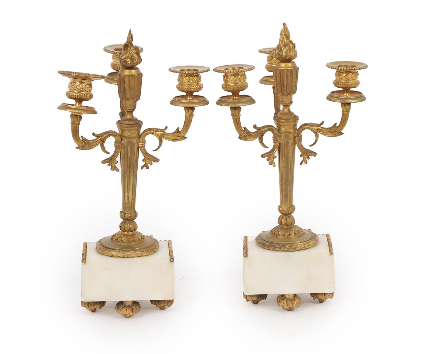 each with scrolling branches and classical detailing, raised on stepped marble bases with gilt mounts.