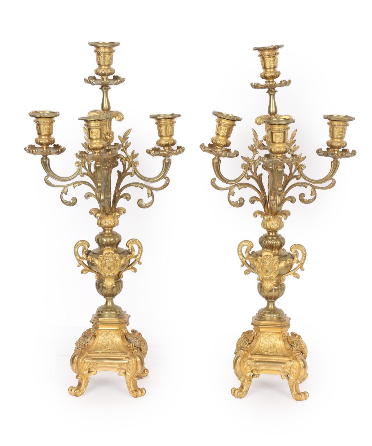 A pair of 19th-century ormolu five-light candelabras, each with scrolling acanthus branches issuing from a central stem, raised on shaped bases with applied foliate ornament.