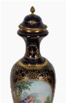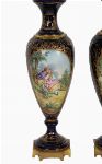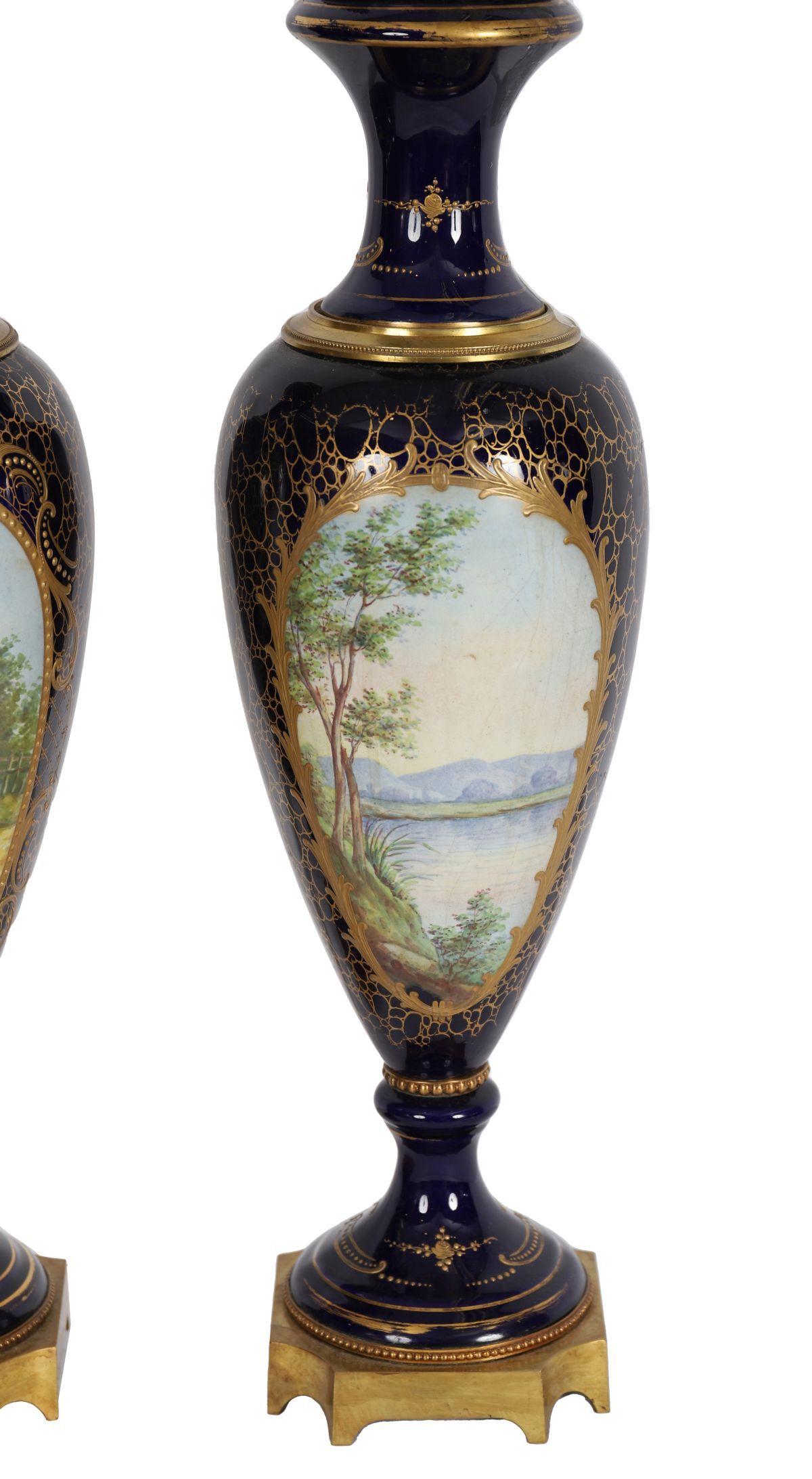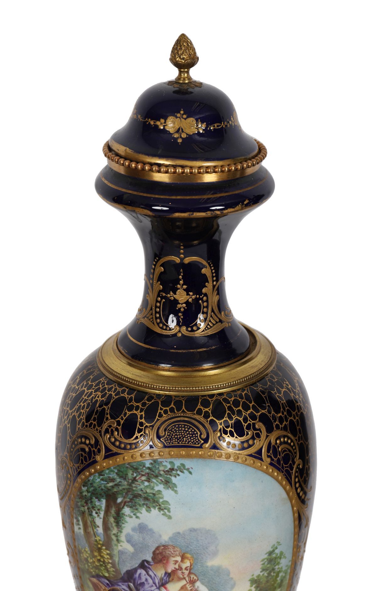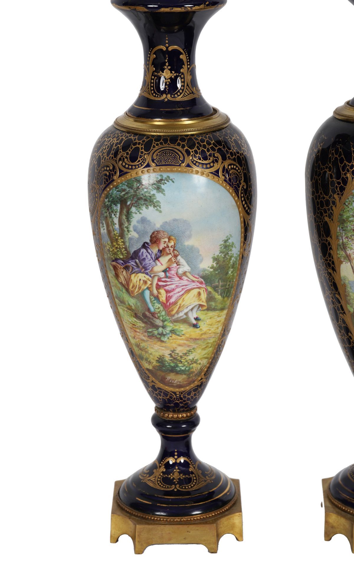 A pair of 19th-century Sèvres porcelain urns, each painted with romantic figural scenes within shaped cartouches on a deep blue ground, enriched with gilt decoration and mounted with finely cast ormolu, raised on square bases. French, 19th century.