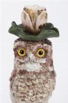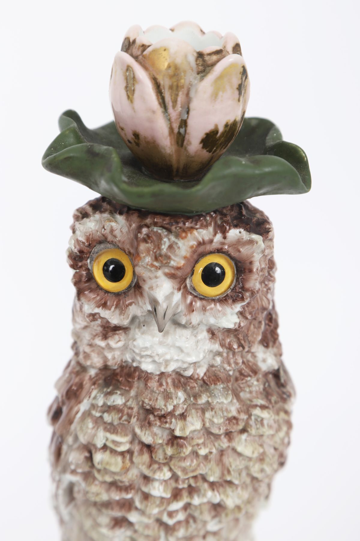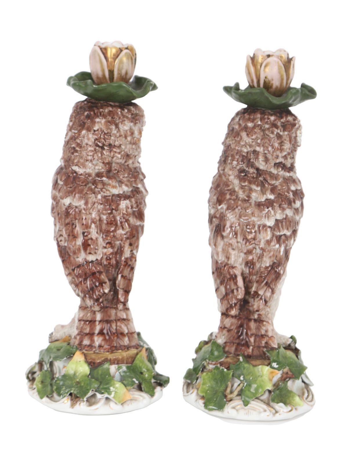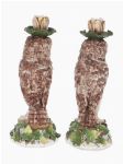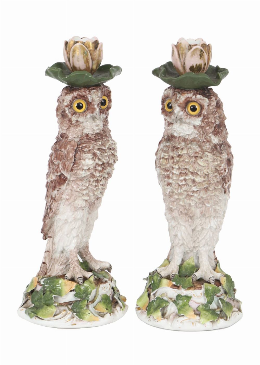 A pair of naturalistically modelled porcelain candlesticks in the form of owls perched on leafy bases, each surmounted by a foliate candle nozzle. Continental, 19th century.