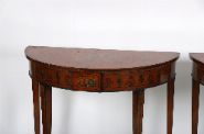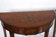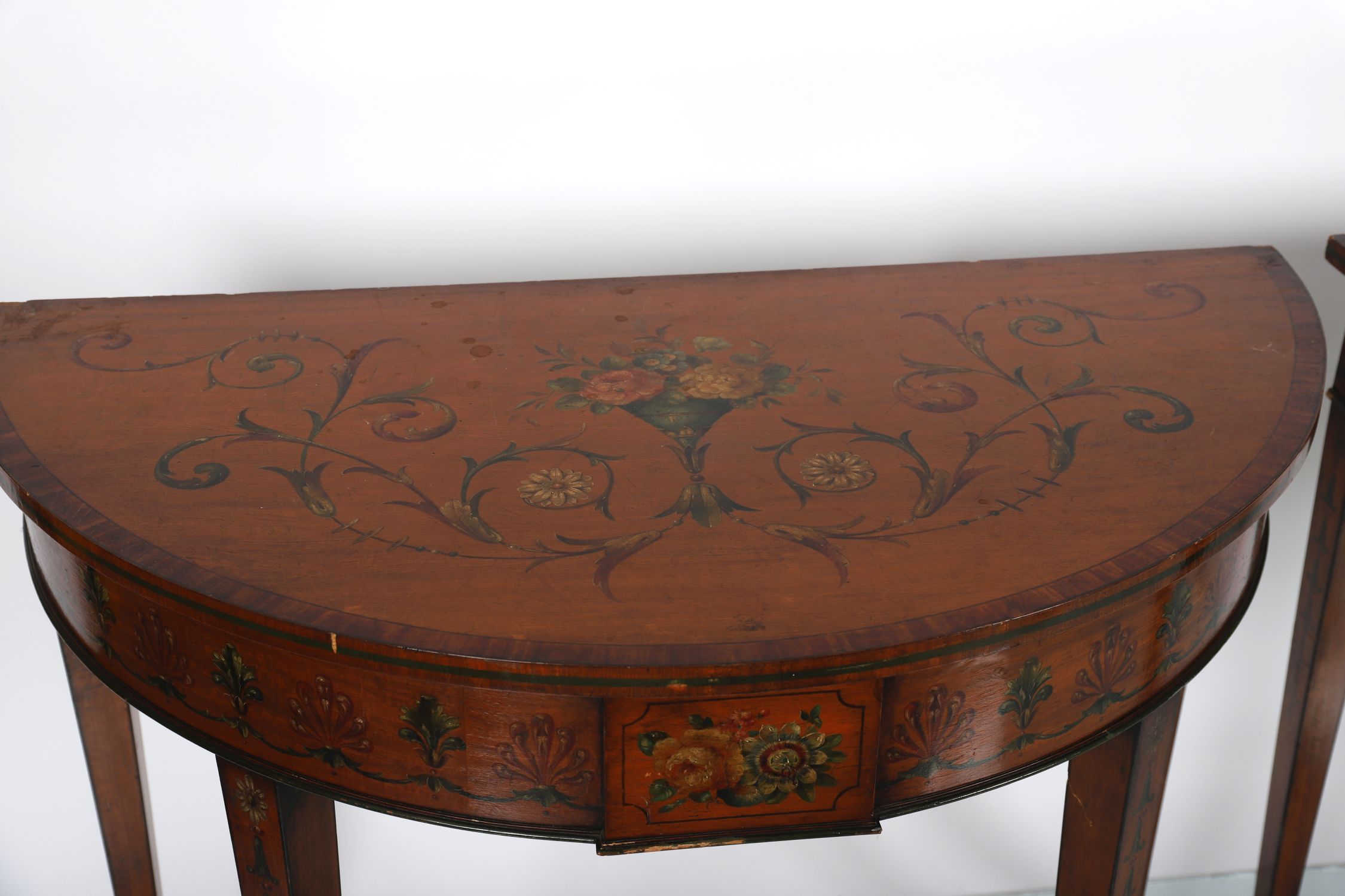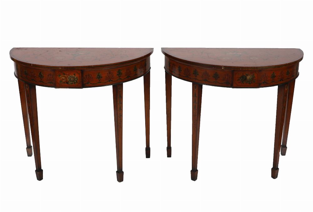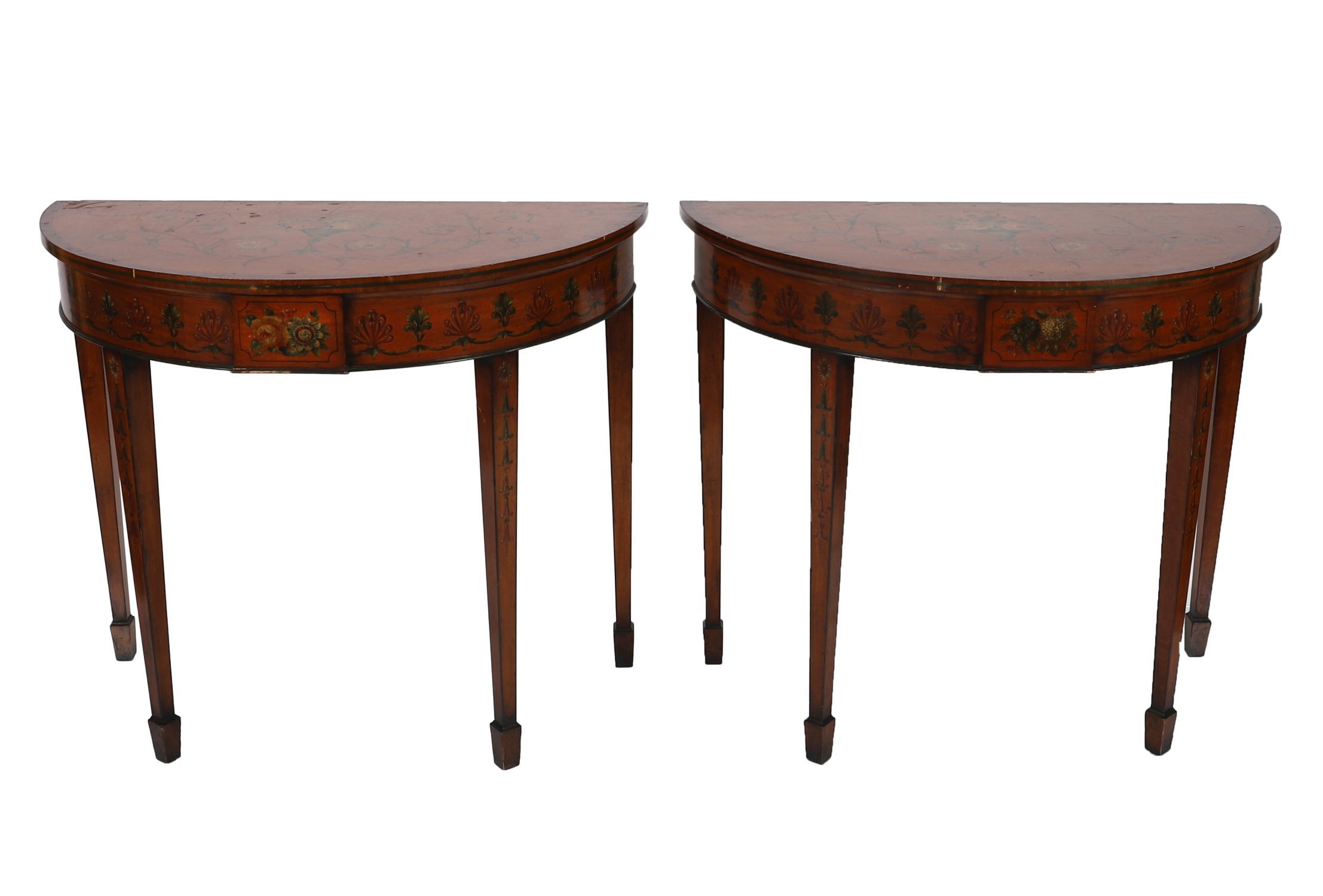 Lot 223 PAIR OF 19TH-CENTURY SATINWOOD AND PAINTED DEMI-LUNE CONSOLE TABLES