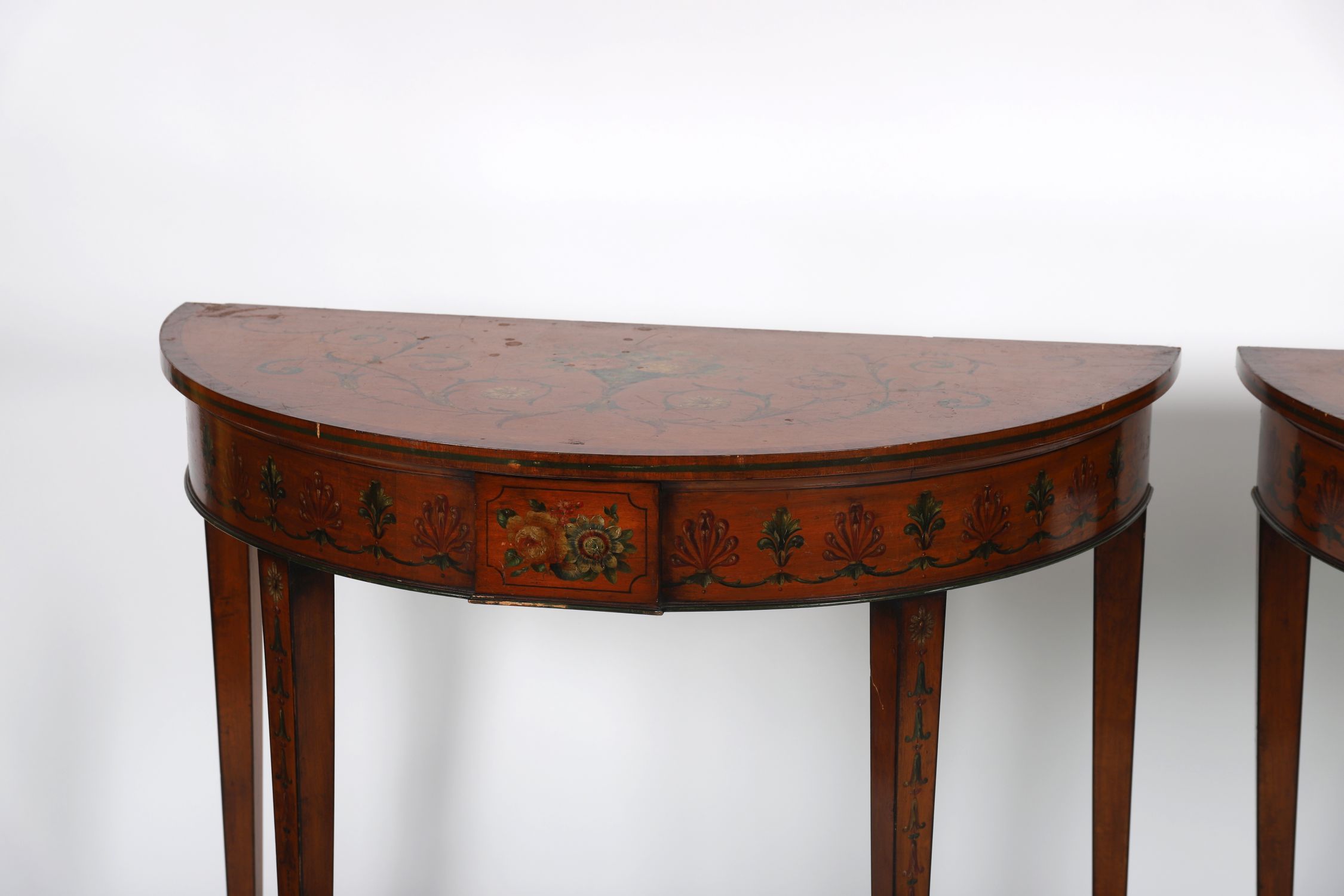A decorative pair of 19th-century satinwood demilune console tables, each with hand-painted neoclassical decoration to the frieze featuring alternating anthemion and bellflower motifs in red and green against a golden ground. Raised on square tapering legs with painted detailing, the tables are of elegant proportion and refined craftsmanship, The satinwood displays a warm tone and fine grain.