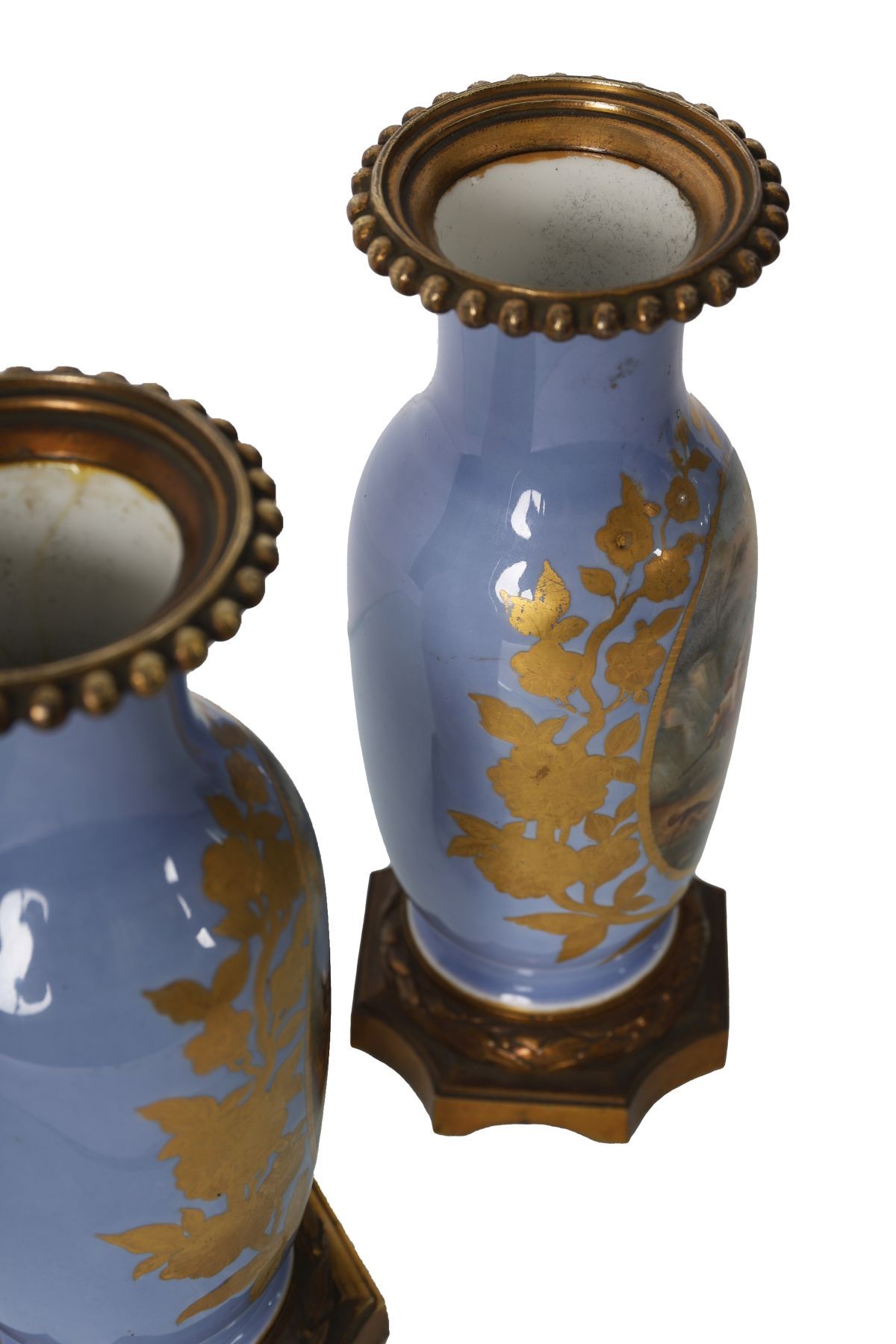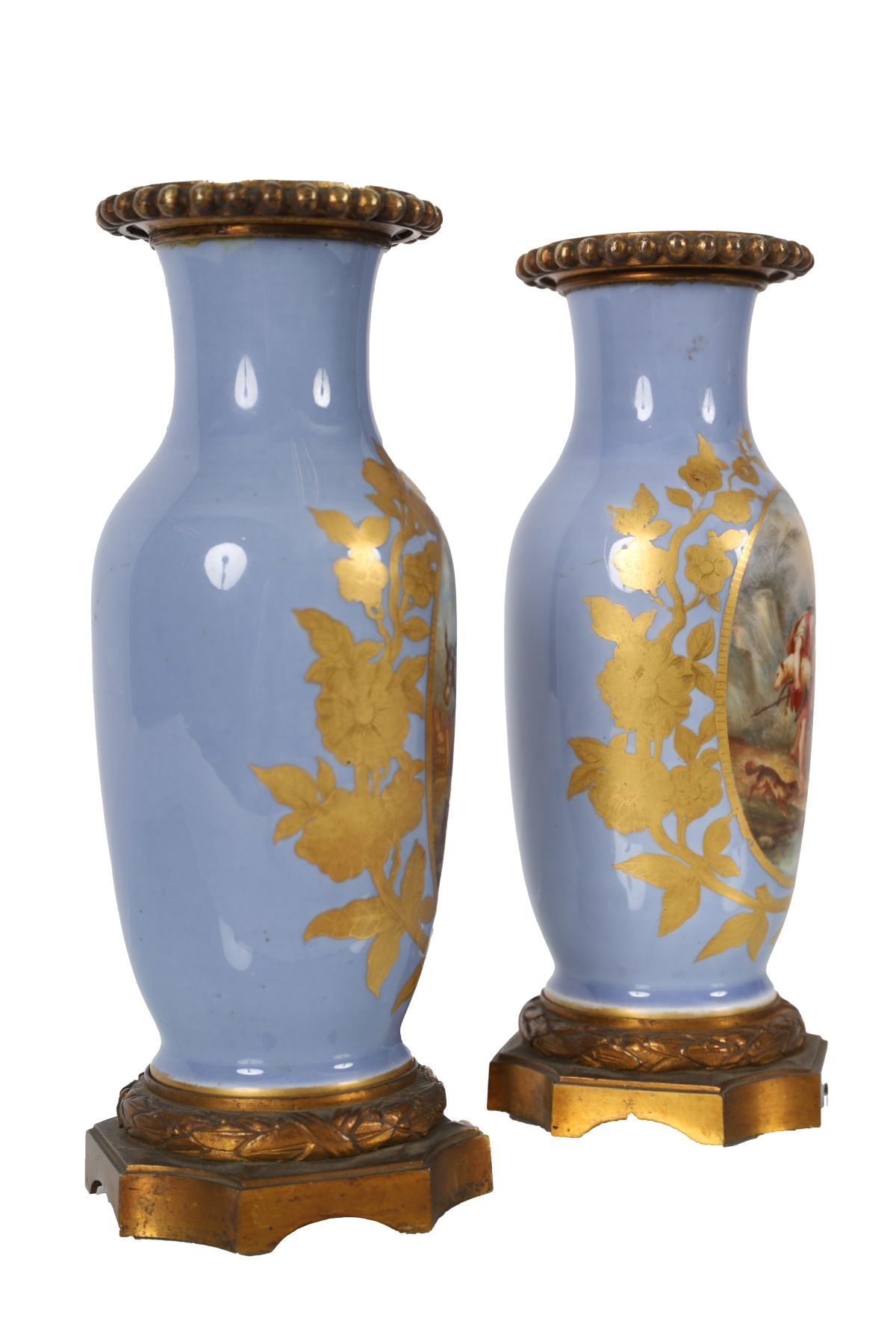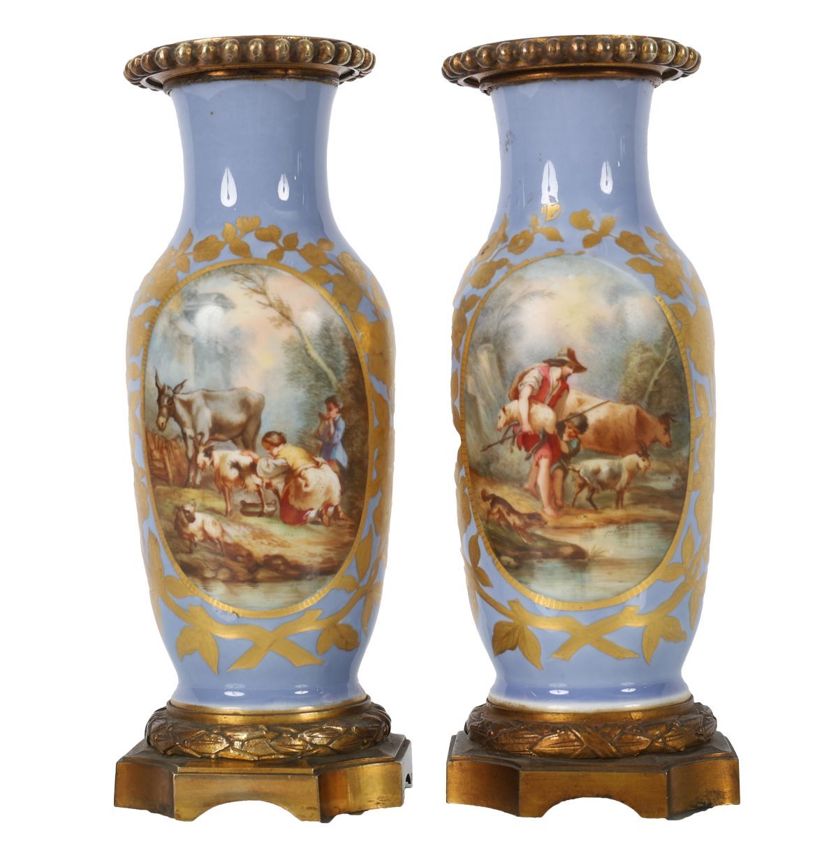 Each vase finely hand-painted with pastoral scenes depicting figures and livestock within gilt foliate borders on a celeste blue ground. Mounted with ornate ormolu bases and rims.