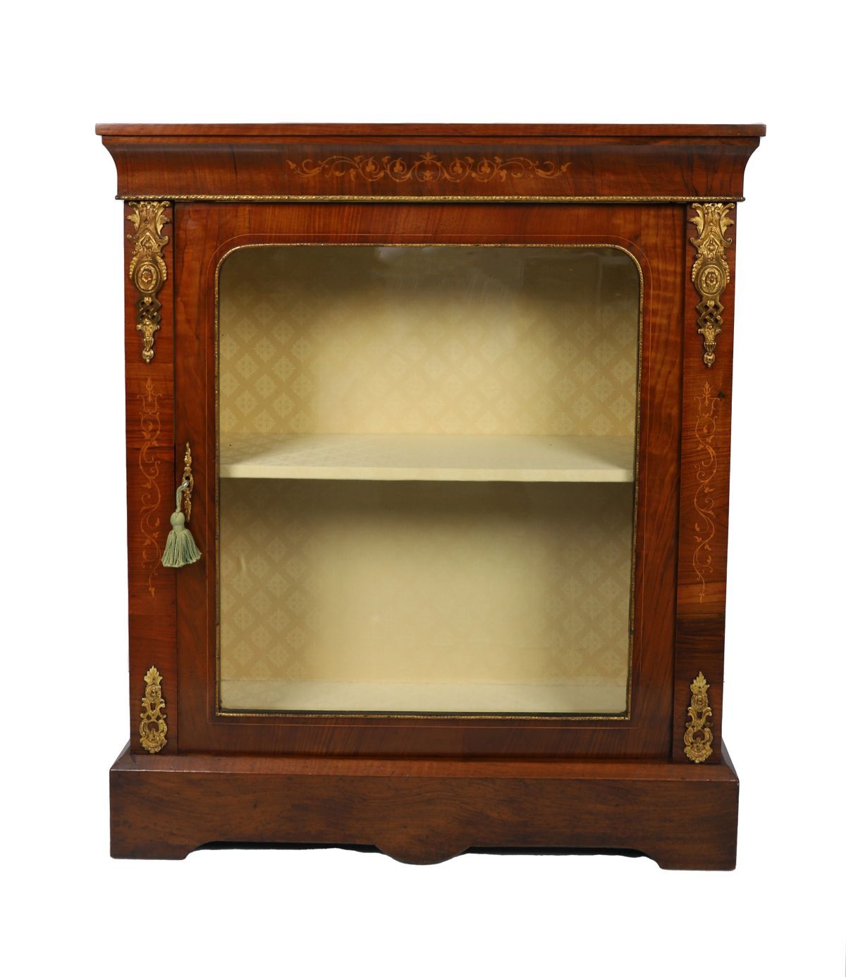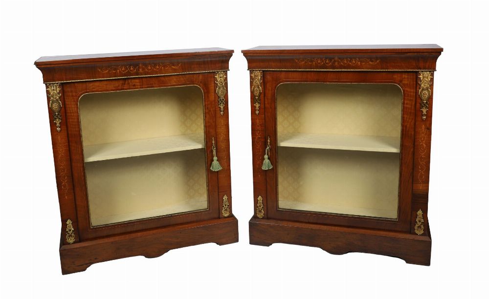 A matching pair of walnut and marquetry credenzas, each with glazed central door, ormolu mounts, and satinwood inlay, the interiors lined with cream fabric.