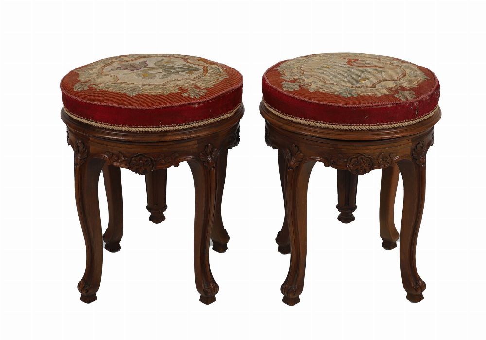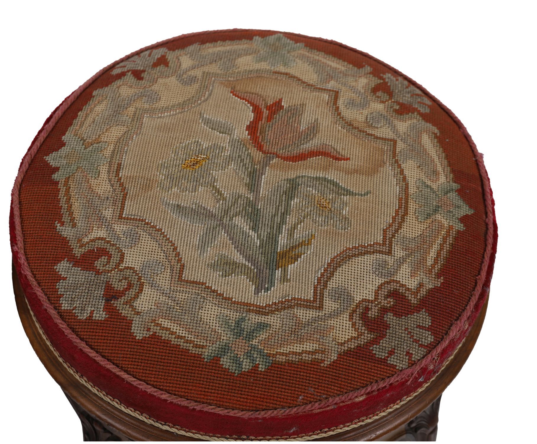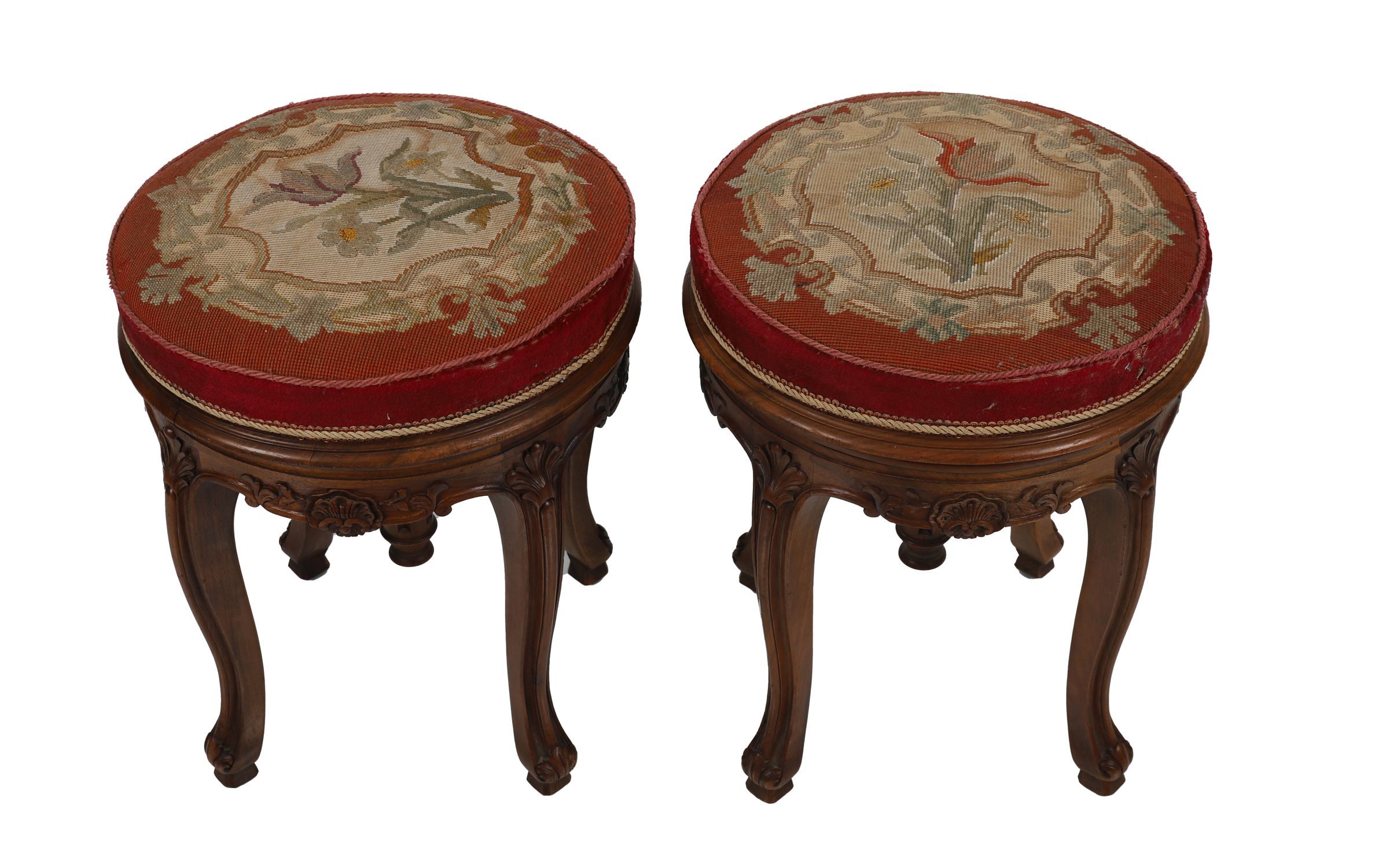 A pair of walnut piano stools, each with circular upholstered seat in floral needlework, rising on cabriole supports carved with scrollwork, united by turned stretchers.