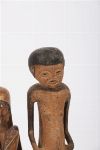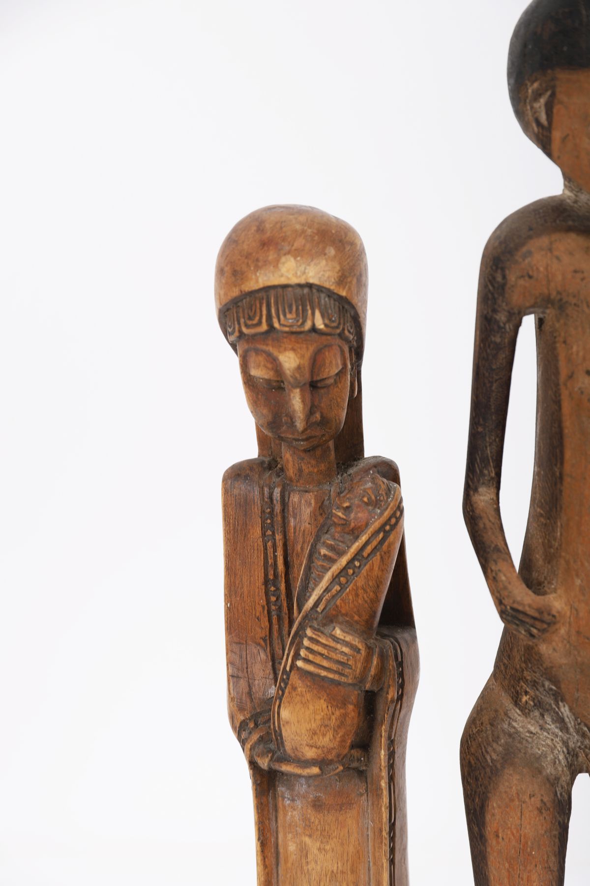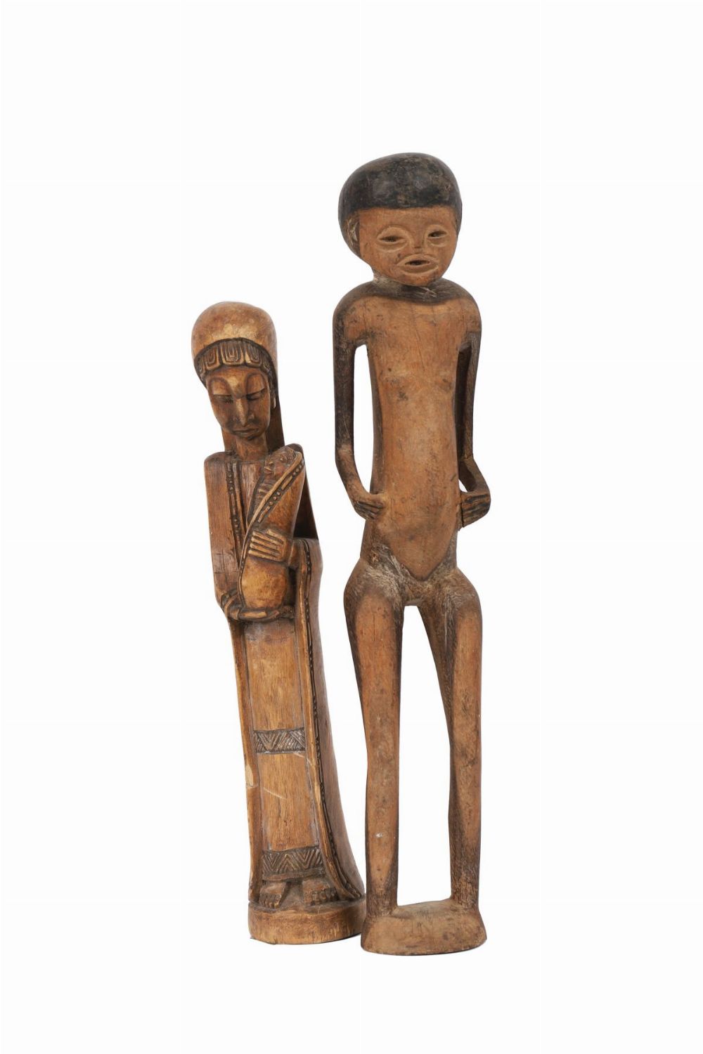 A pair of hand-carved African tribal figures, each stylised in form with distinct facial features and geometric surface decoration. One figure of elongated proportions with minimalist carving, the other more compact with incised detailing to the robe and headdress. Both exhibiting natural patination from age and handling.