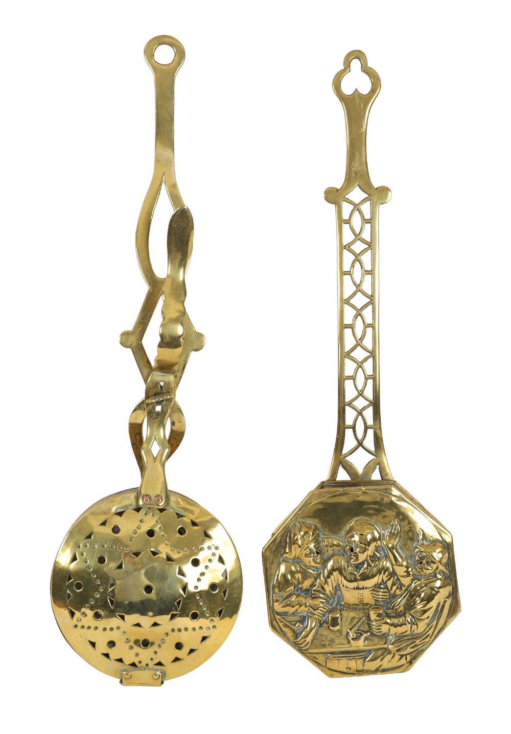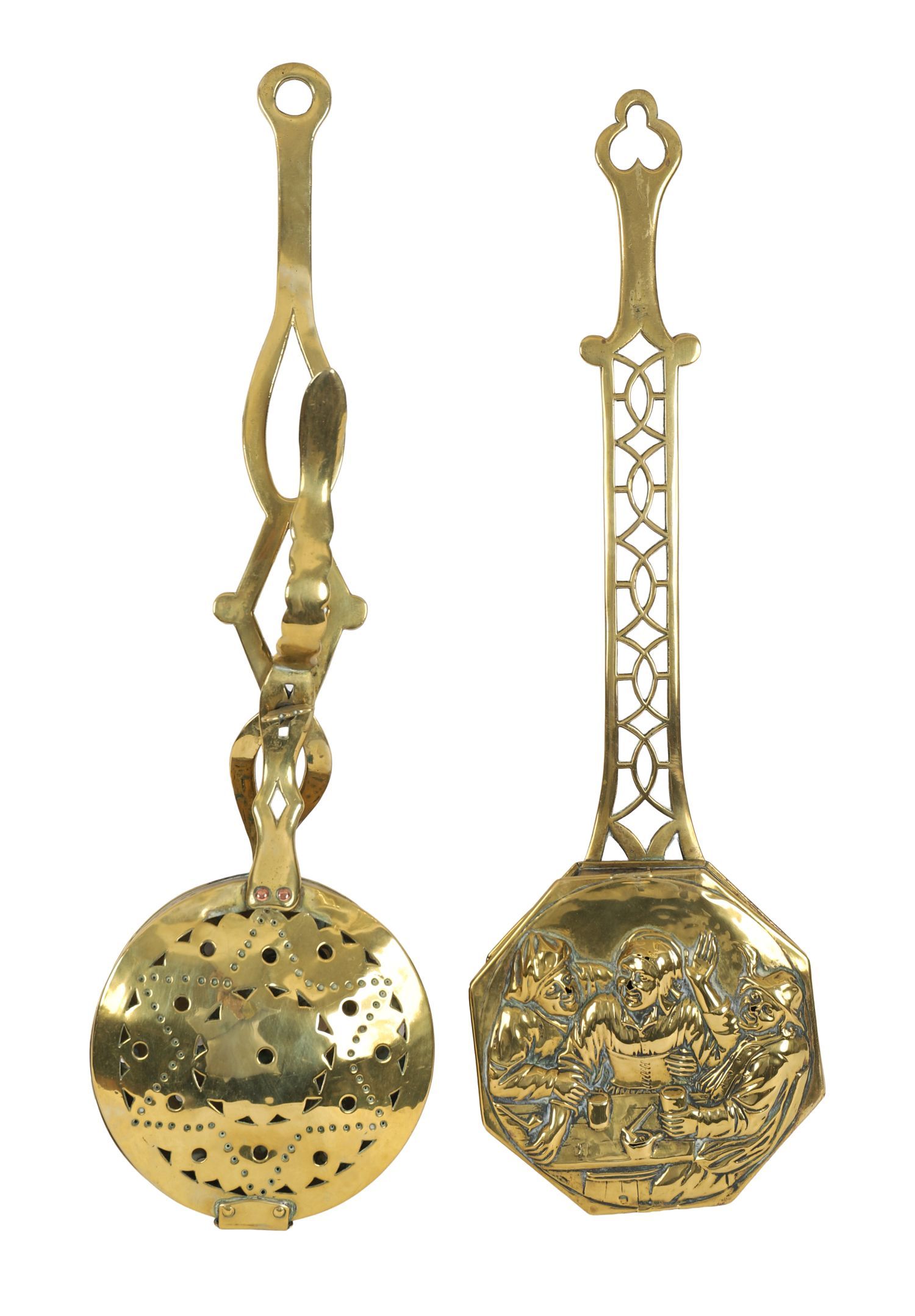 A pair of antique brass chestnut roasters, each with pierced pan and decorative cover, one octagonal with repoussé figural scene, the other circular with punched star design. Fitted with long handles.