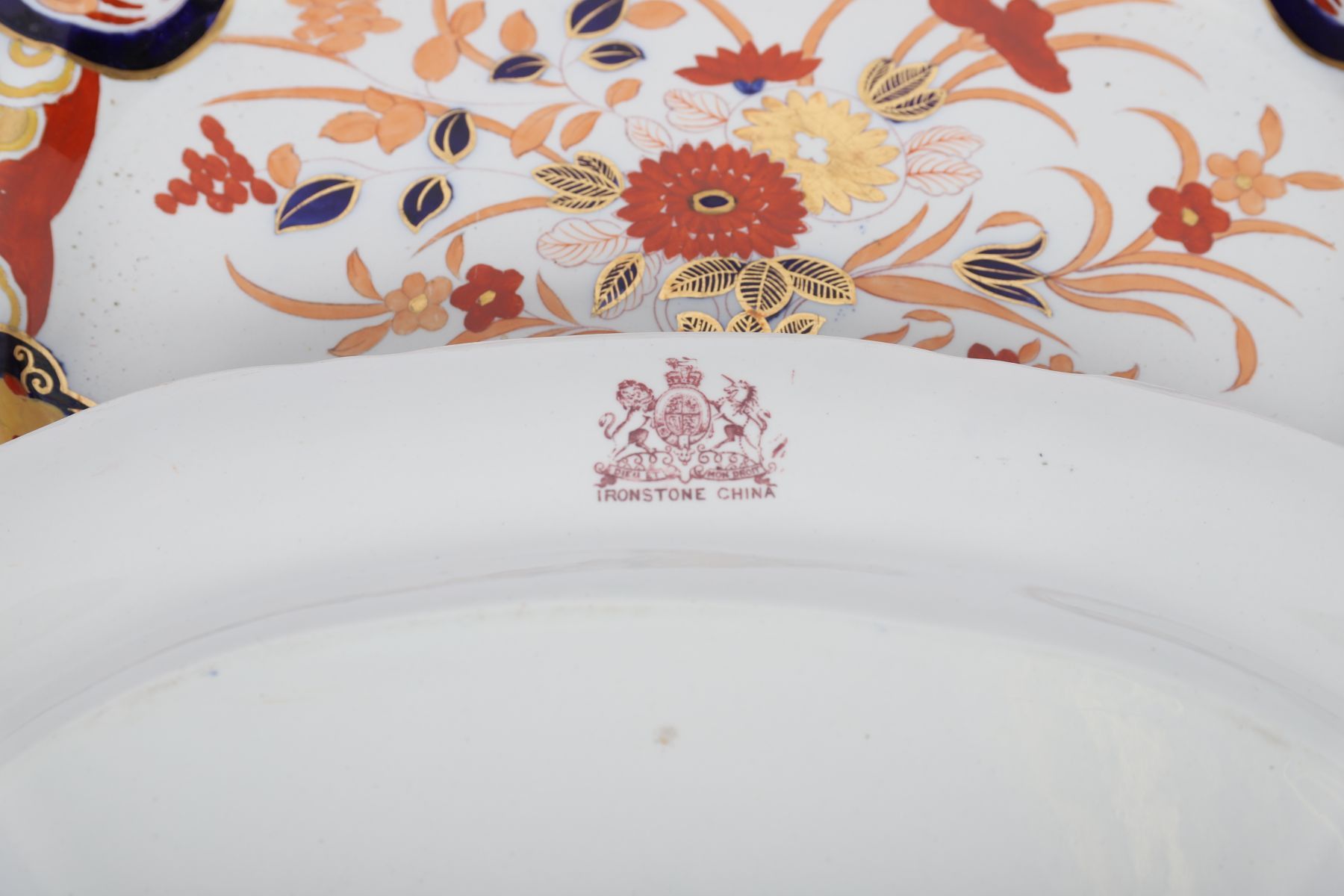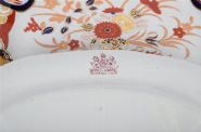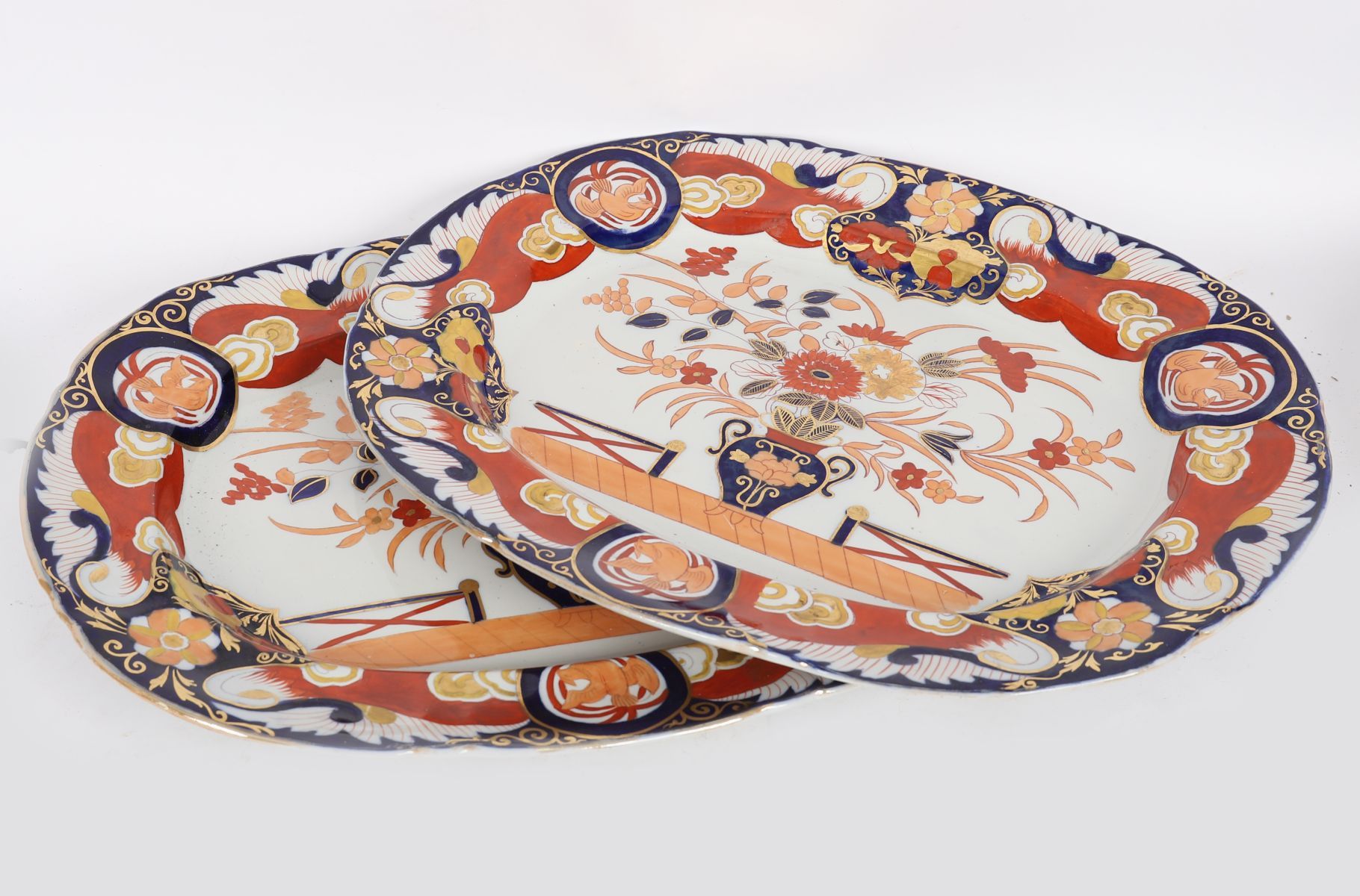 in the richly coloured Imari palette of cobalt blue, iron red and burnished gilt. Each platter painted with a central urn overflowing with stylised chrysanthemums and peonies, framed by radiating borders of scrolling foliage, diaper patterns and reserves of phoenix and floral sprays. The bold use of gilding heightens the dramatic contrast, making these dishes fine examples of English interpretations of Japanese Imari ware.