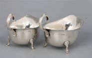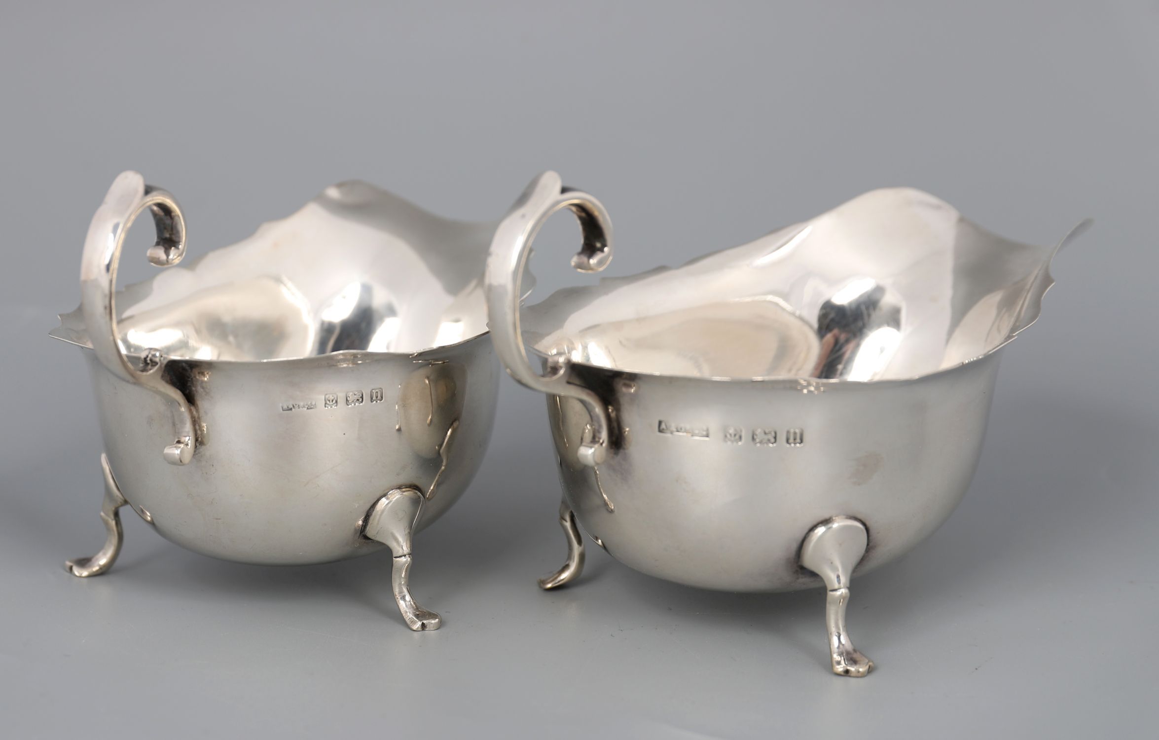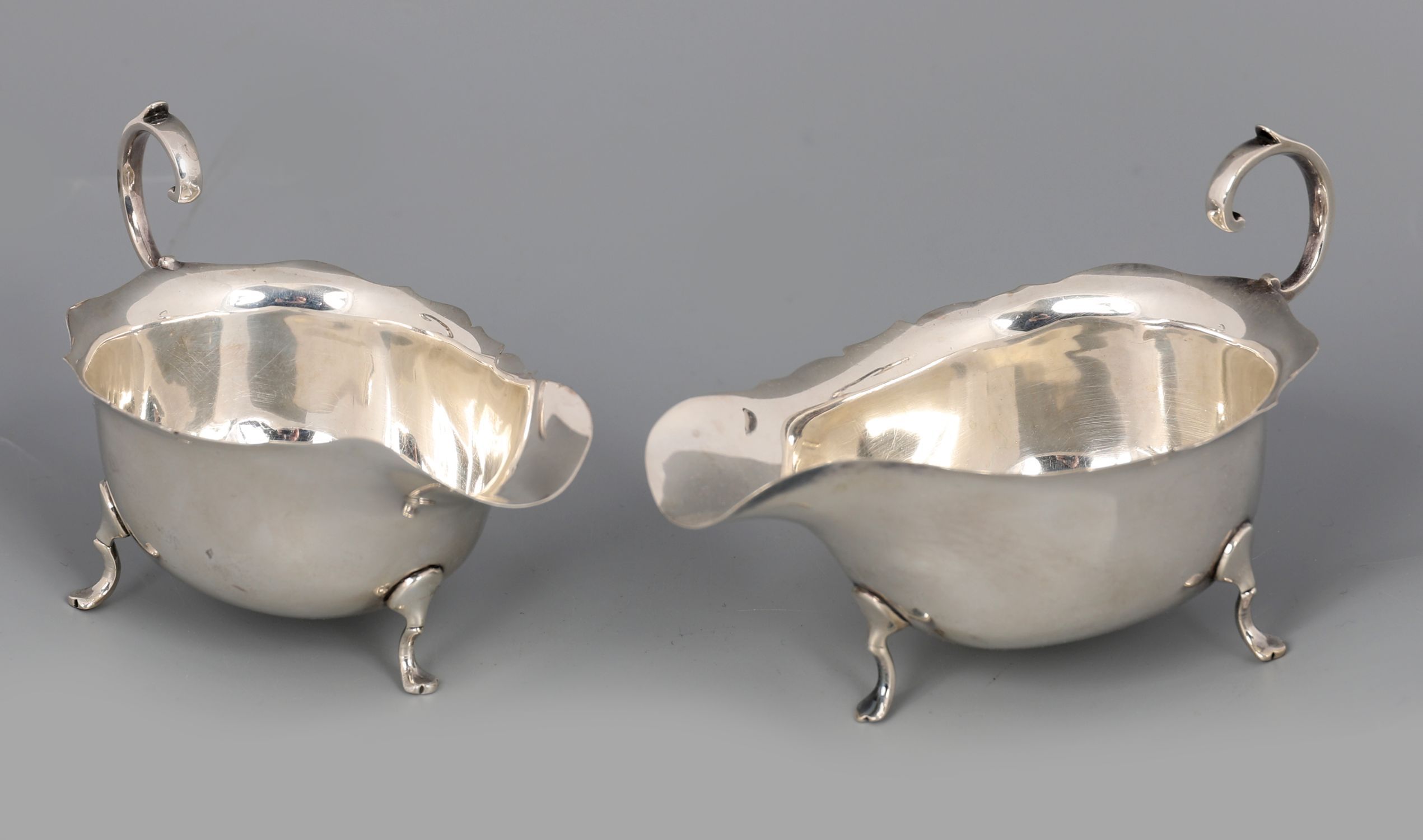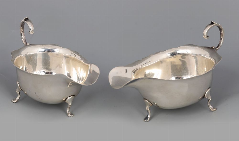 A pair of fine silver sauce boats, each of oval form with shaped rim, raised on three hoof feet with scrolled terminals, and fitted with elegant scroll handles. Of classic Georgian-inspired design, with a bright polished finish and good gauge. Hallmarks to underside. Birmingham 1912.