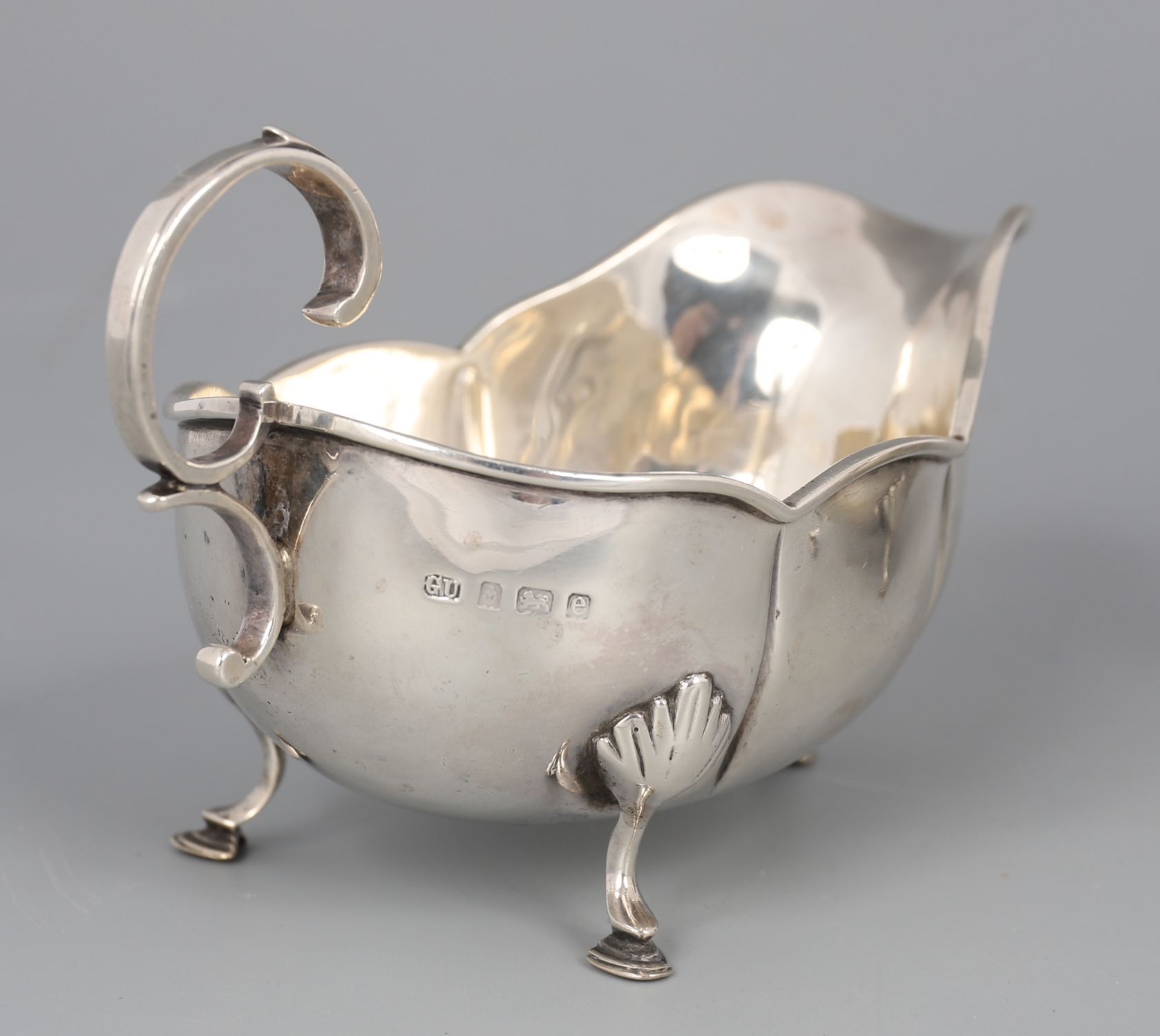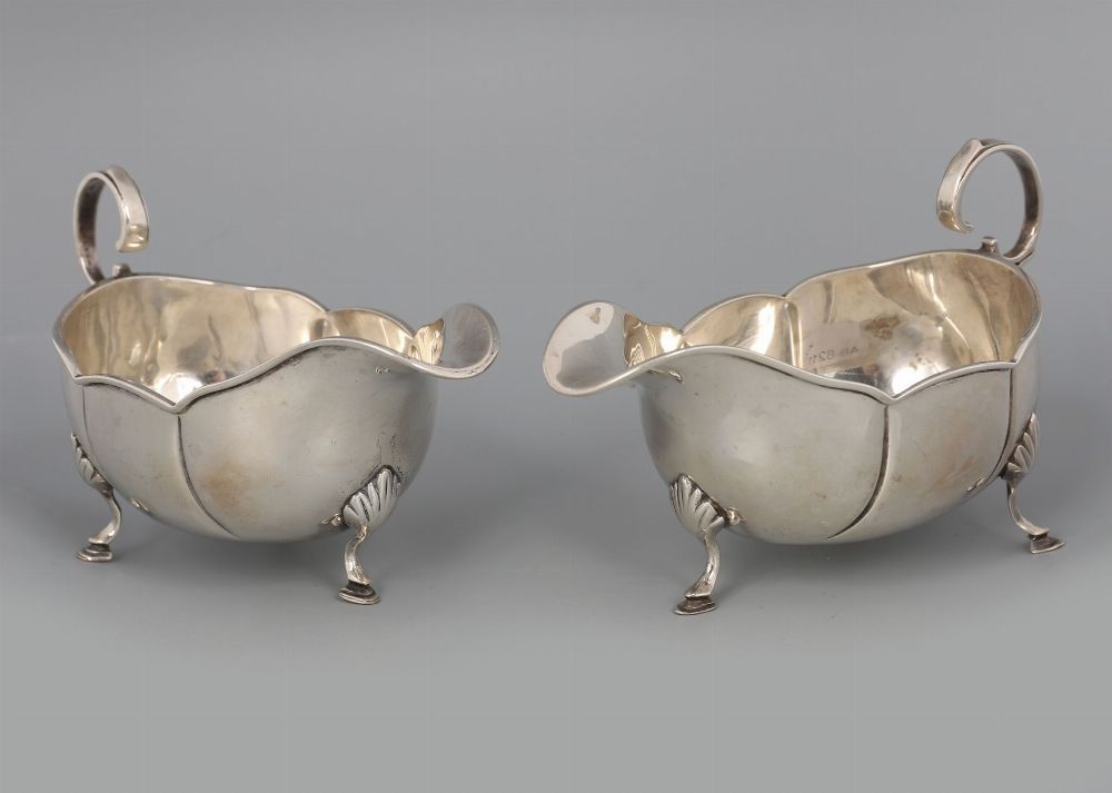 A pair of silver sauce boats of scalloped oval form with wavy rims, raised on three shell-form feet, and fitted with scroll handles. The bodies with subtle panelled decoration, displaying a fine hand-crafted finish. Hallmarks to the underside. Birmingham 1904.