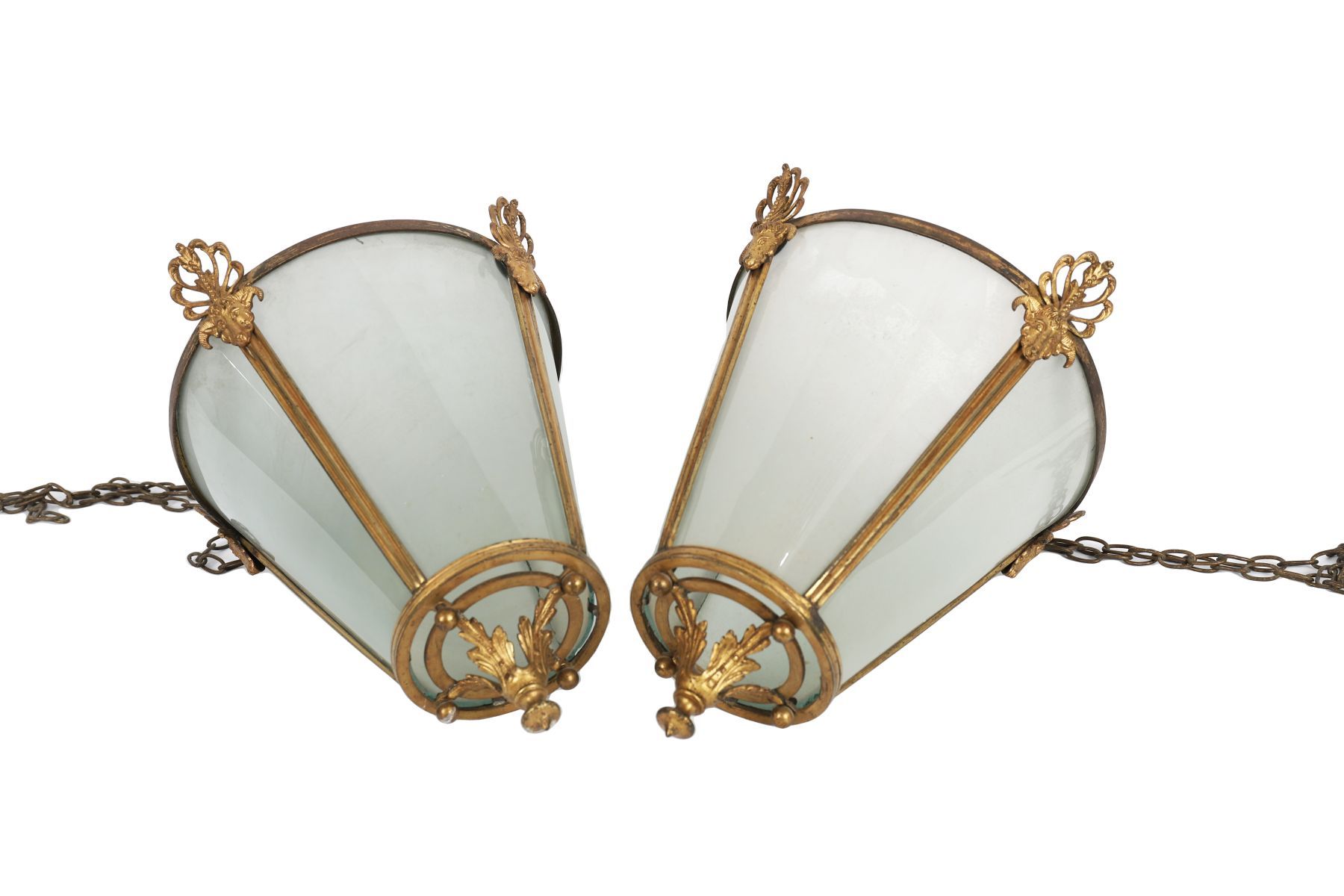 Lot 1084 PAIR OF BRASS AND GLASS HANGING LANTERNS