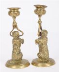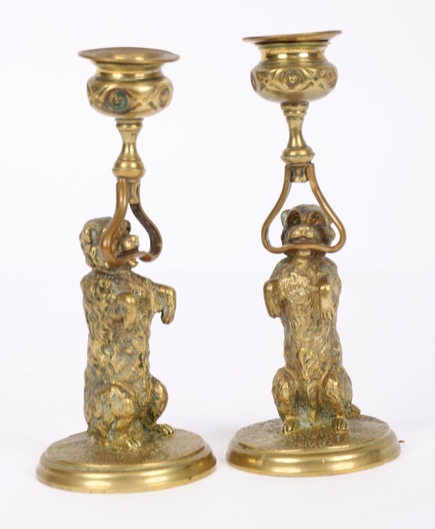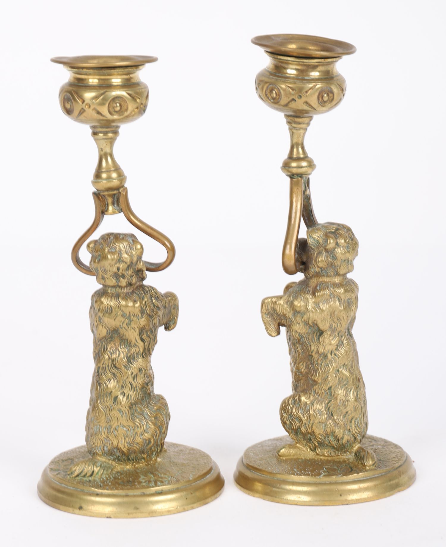 A pair of 19th century brass novelty candlesticks, each modelled as a canine figure holding a sconce aloft. Naturalistically detailed with textured fur and raised on circular bases. Whimsical and decorative figures in the Black Forest manner.