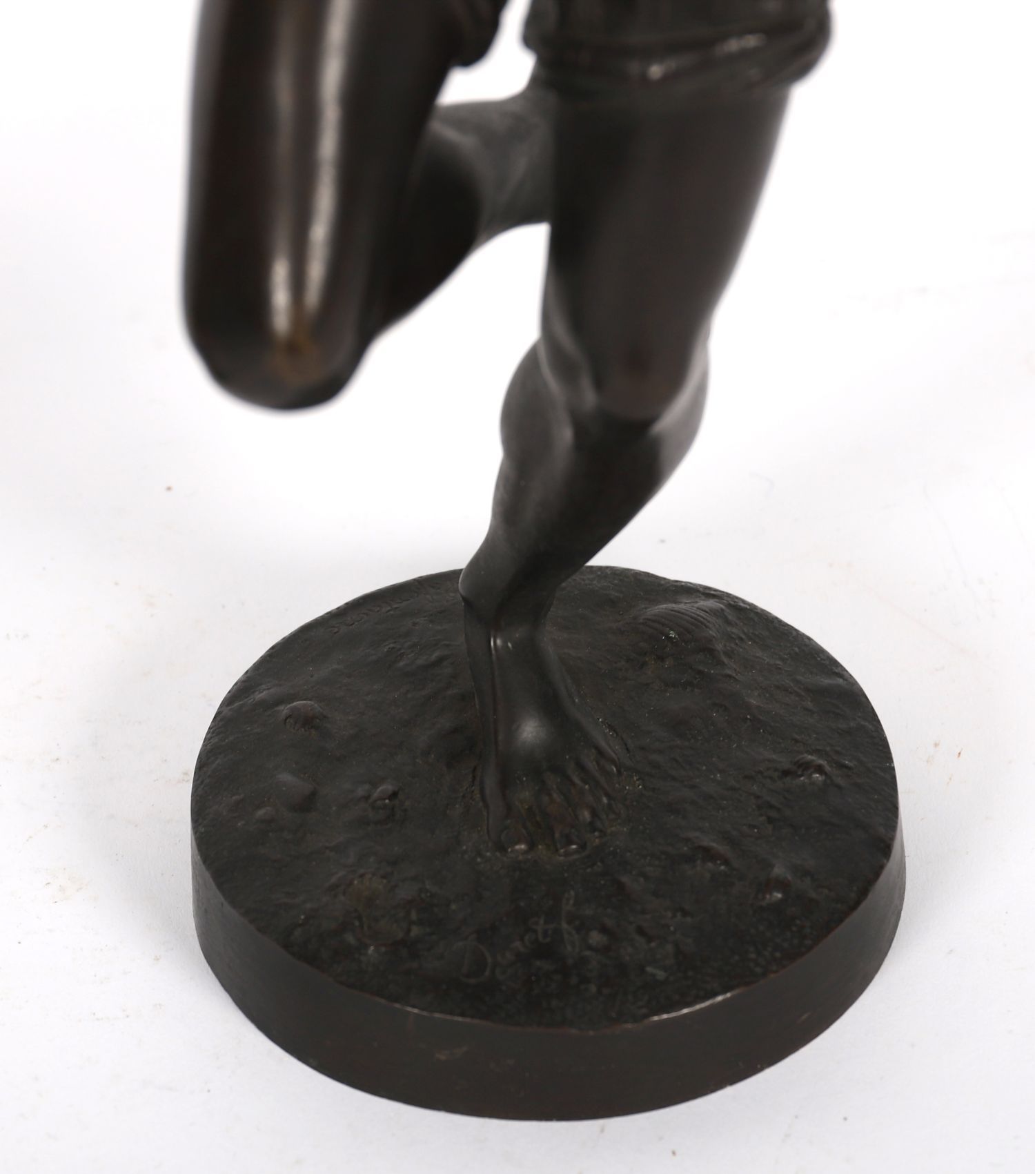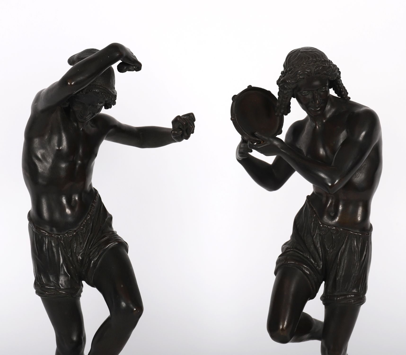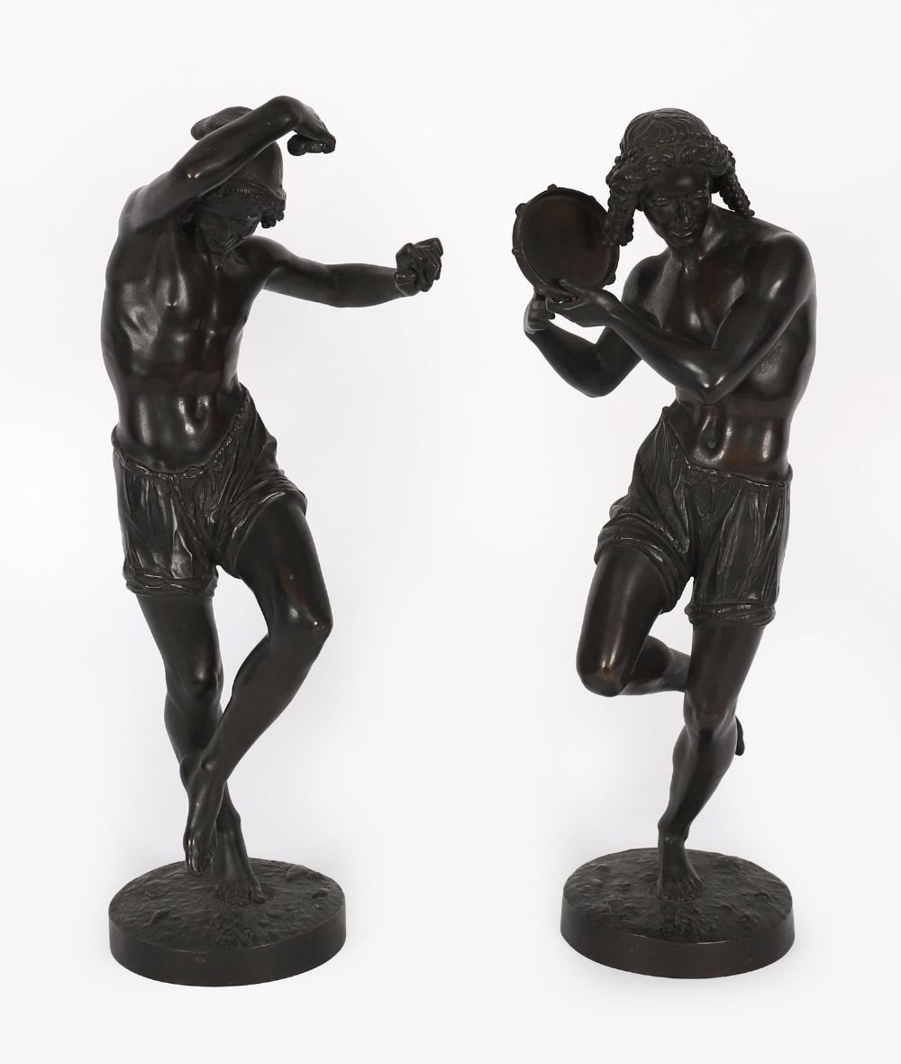 A pair of patinated bronze figures of male dancers, one with tambourine, one in motion, each signed to base— Duret.