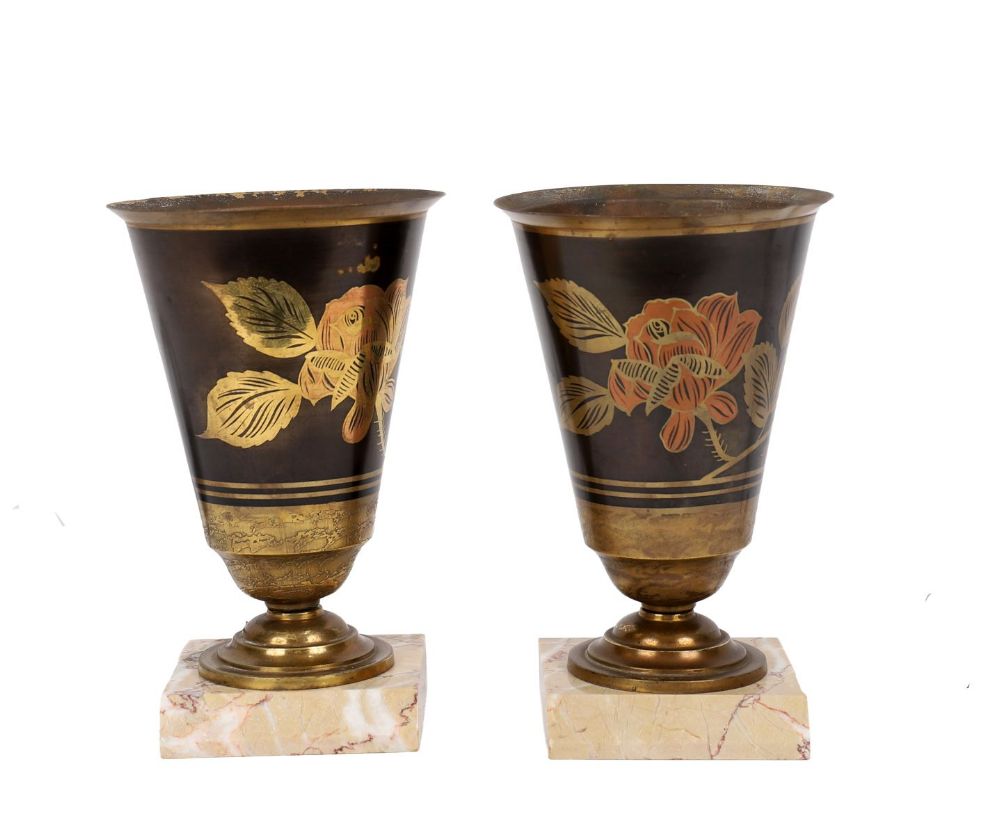 Lot 1010 PAIR OF BRONZE PATINATED VASE-SHAPED UPLIGHTERS ON MARBLE BASES