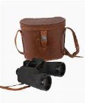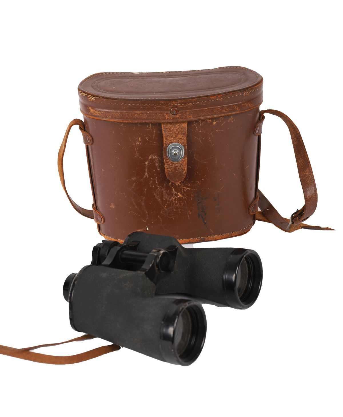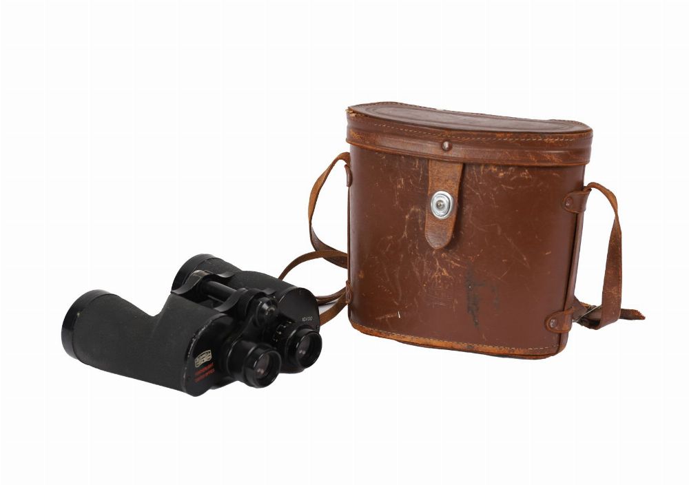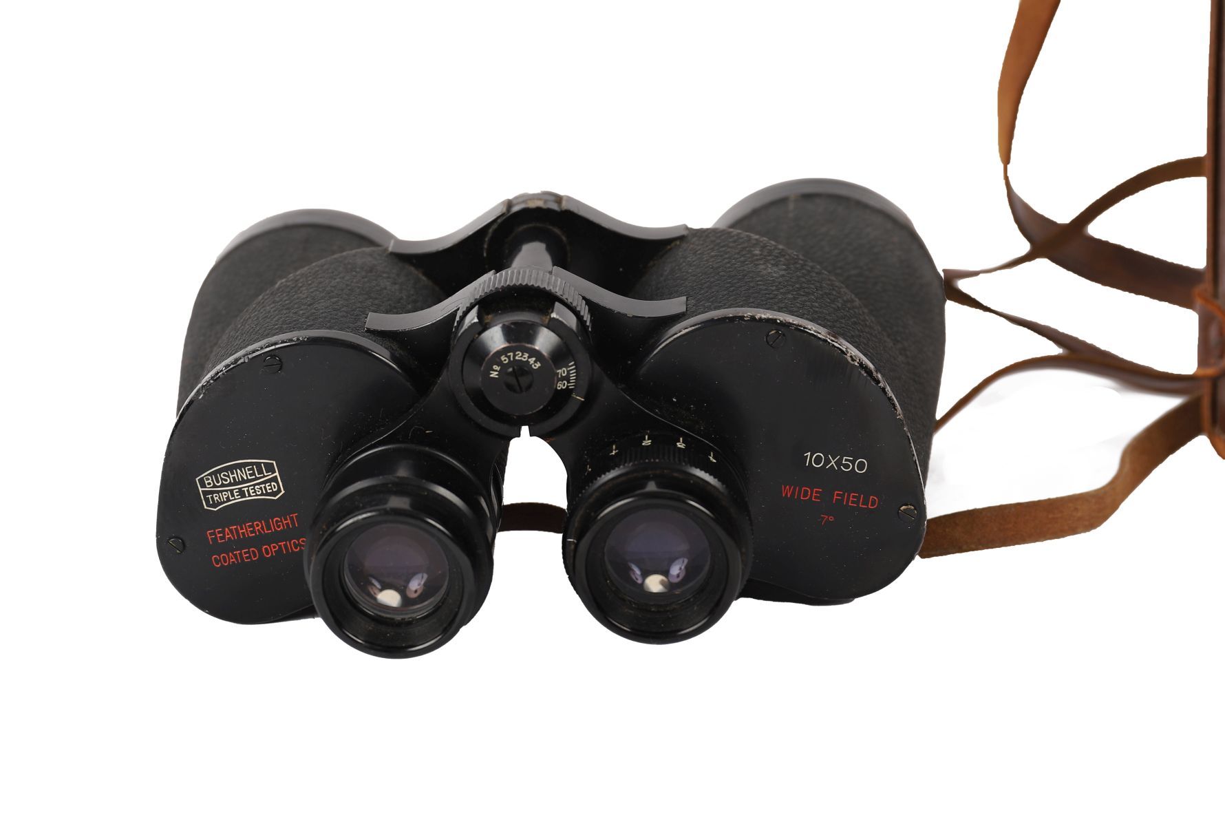 A pair of Bushnell 10x50 Featherlight coated optics binoculars with leather neck strap, together with the original fitted tan leather case.