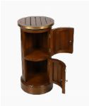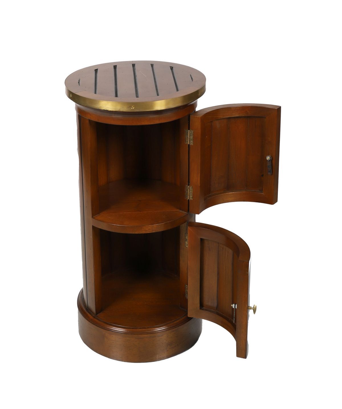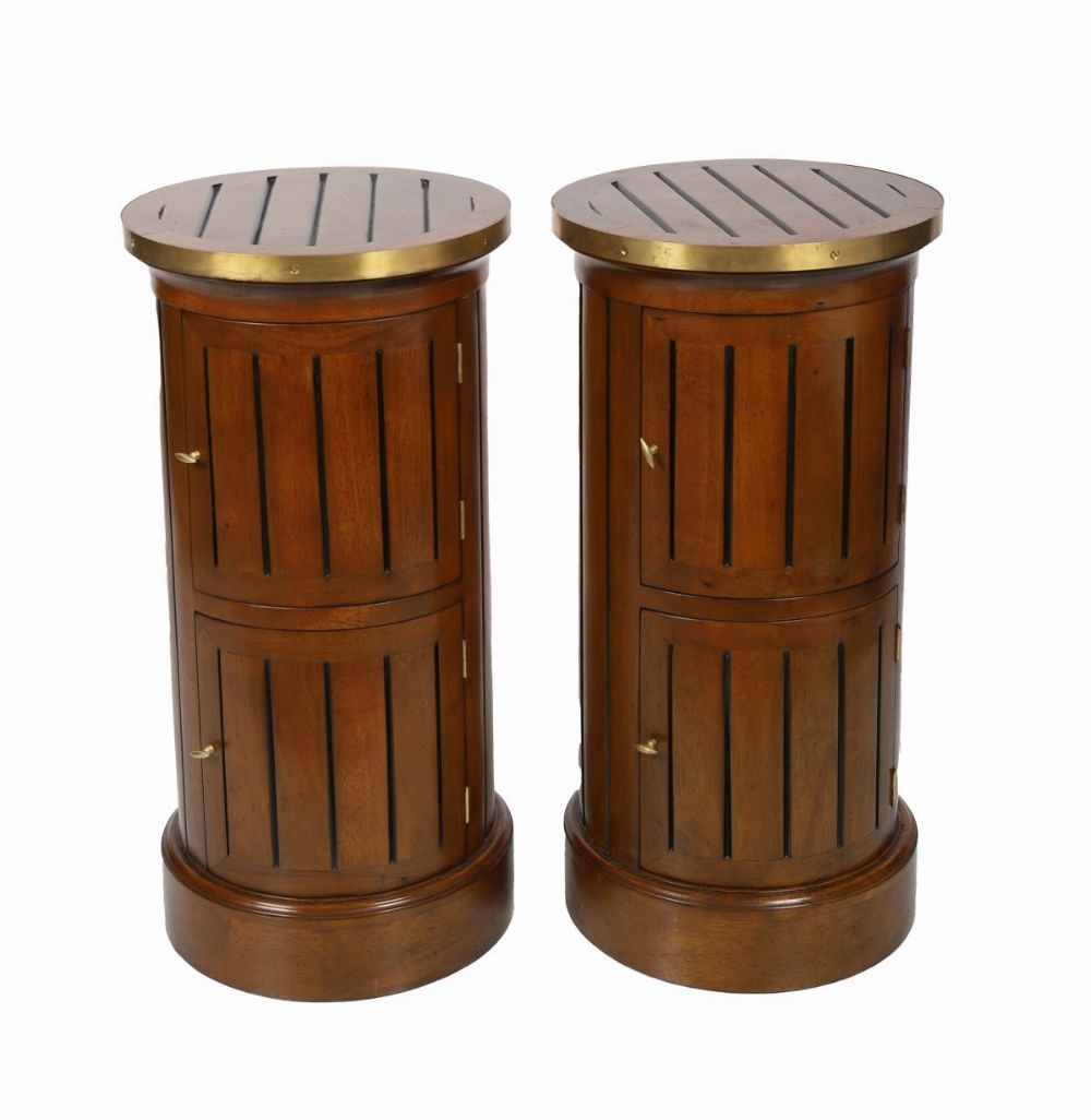 A pair of campaign-style circular brass-bound bedside cabinets, each fitted with twin cupboard doors and brass handles, of barrel form.
