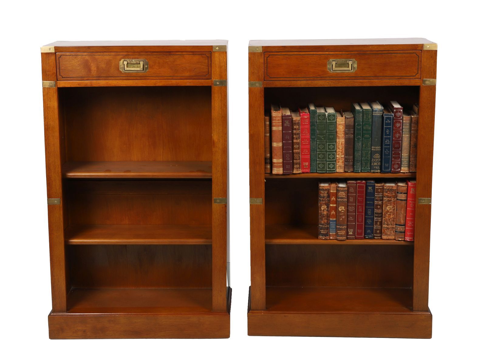 A pair of campaign-style fruitwood bookshelves, each with brass mounts and recessed carrying handles, fitted with a single drawer over open shelving.