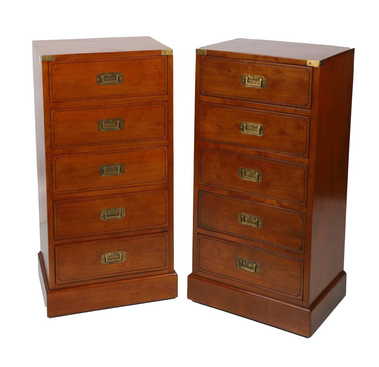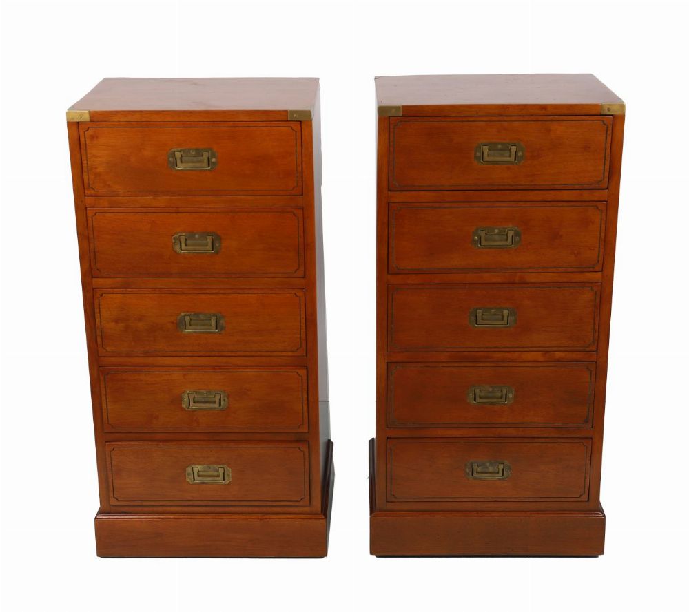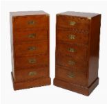 A pair of campaign-style hardwood chests, each fitted with three drawers, brass flush handles, and corner mounts.