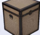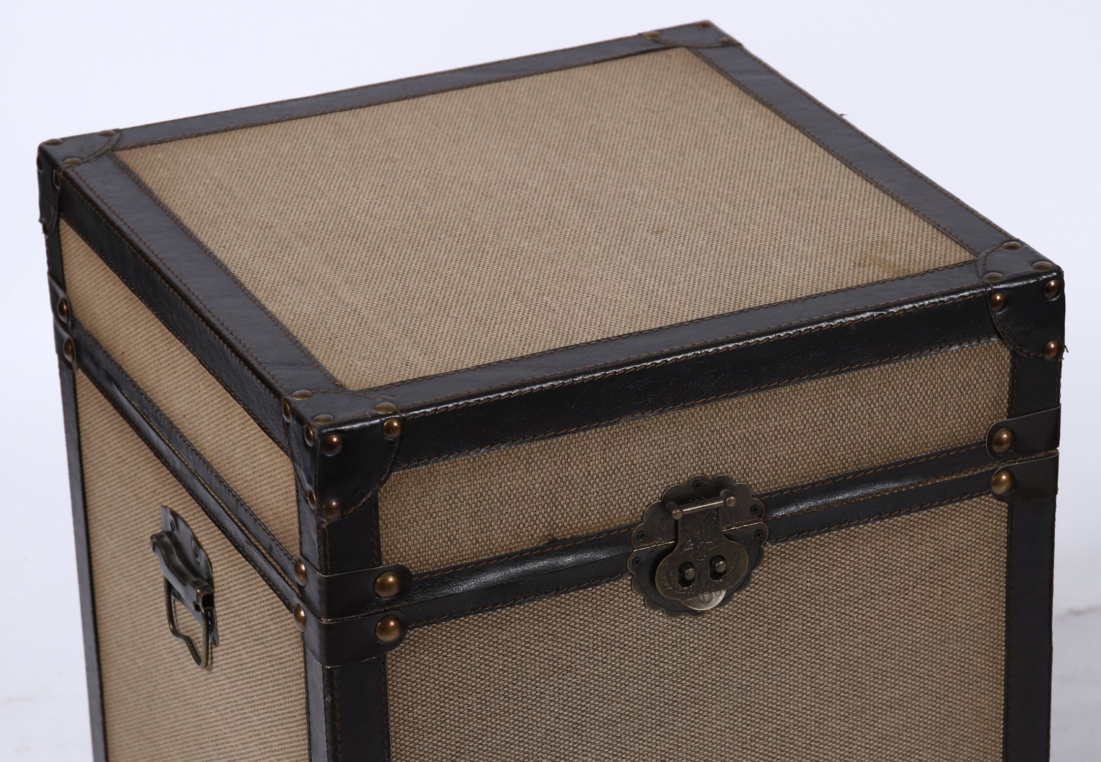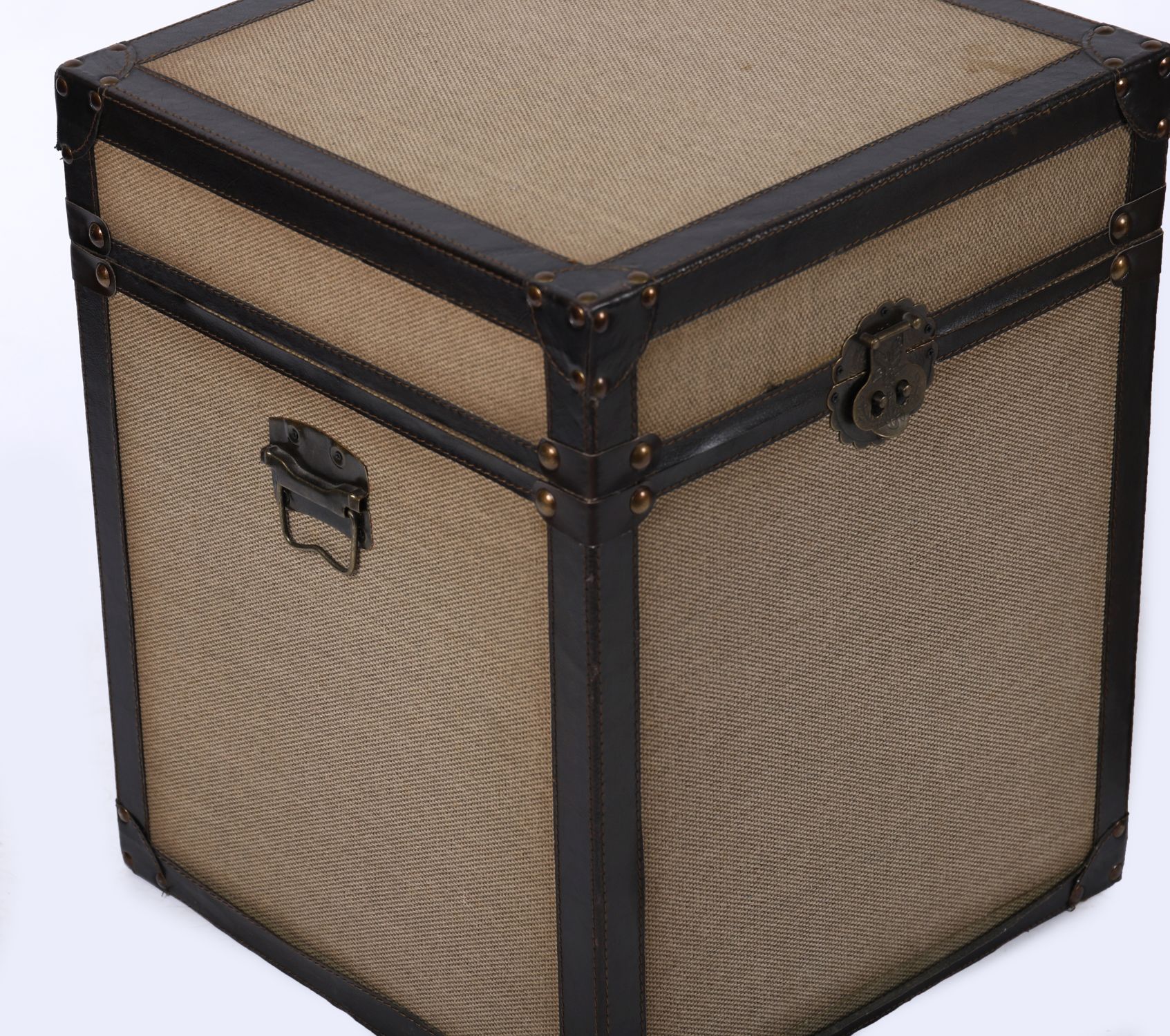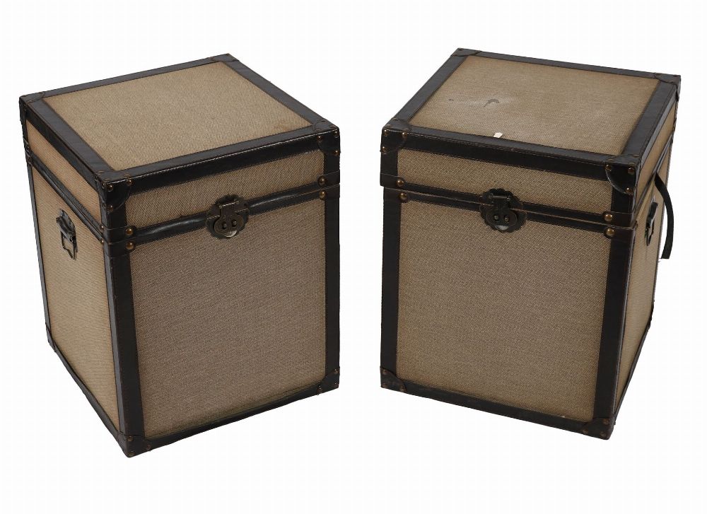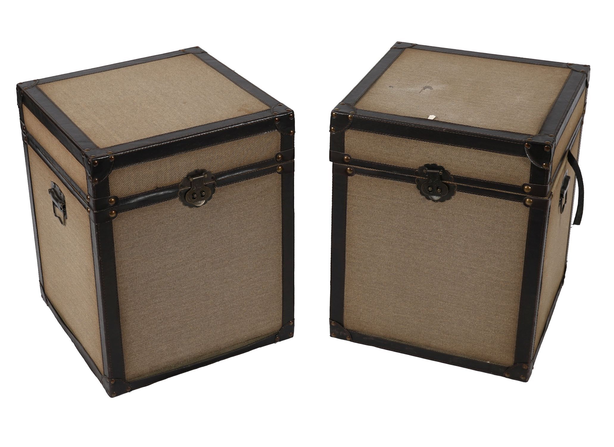 Pair of square-form storage trunks in taupe canvas with stitched dark leather trim, metal corner protectors, and latch closures. Modern design with vintage travel trunk aesthetic.