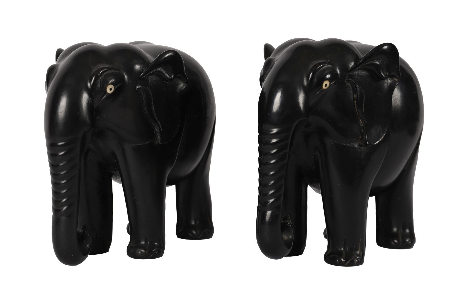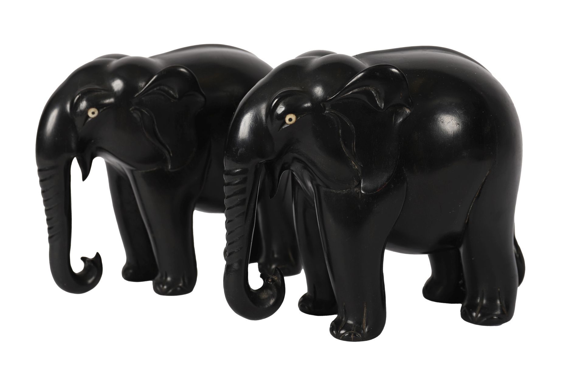 A pair of hand-carved ebony elephants, naturalistically modelled with upturned trunks and expressive carved detail.