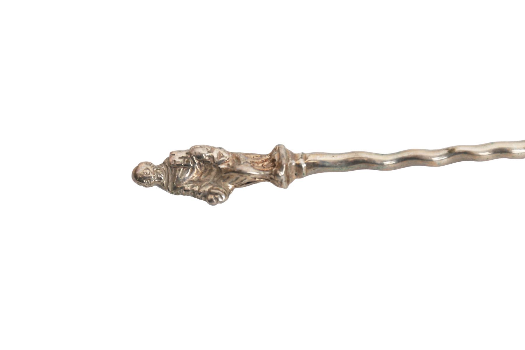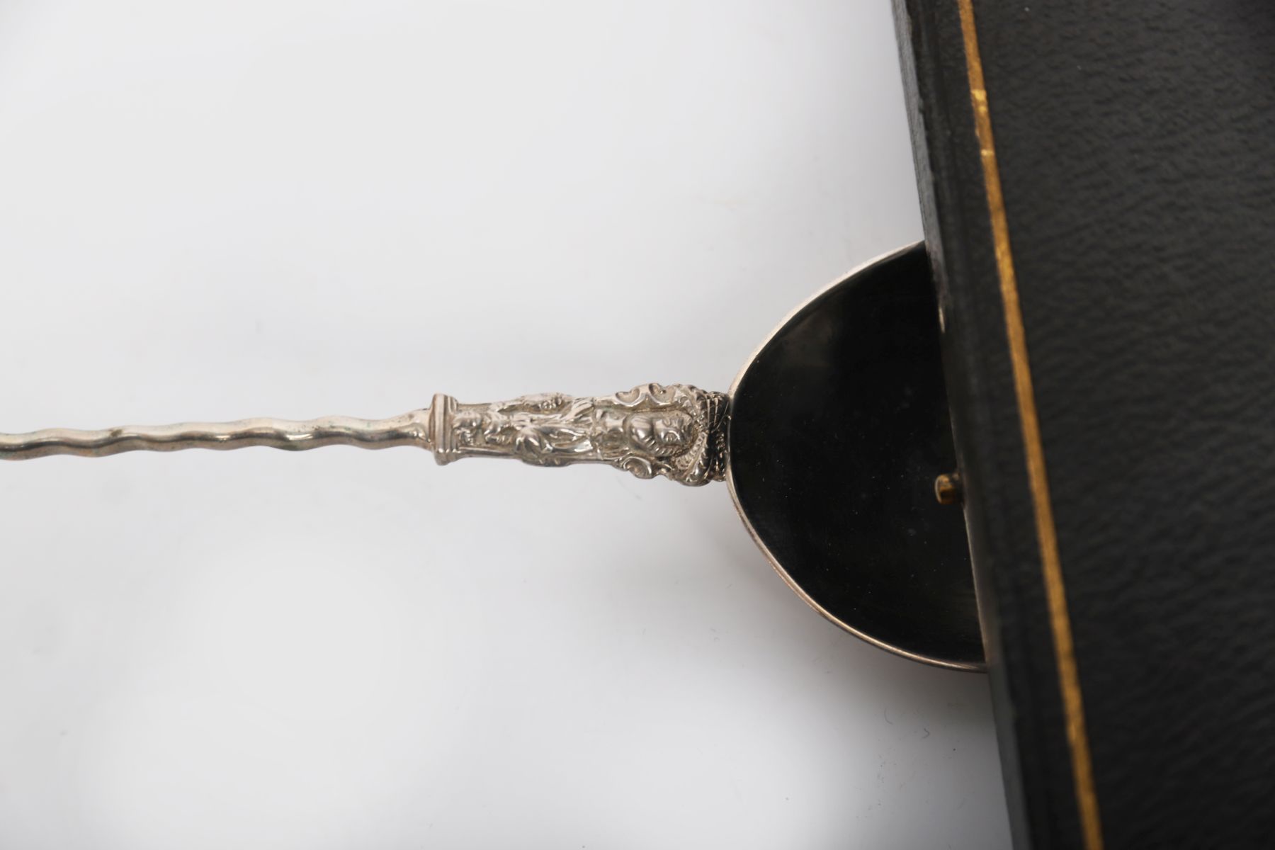 A pair of silver serving spoons with cast and chased figural handles, possibly depicting classical or Renaissance motifs, in original fitted case. London circa 1873