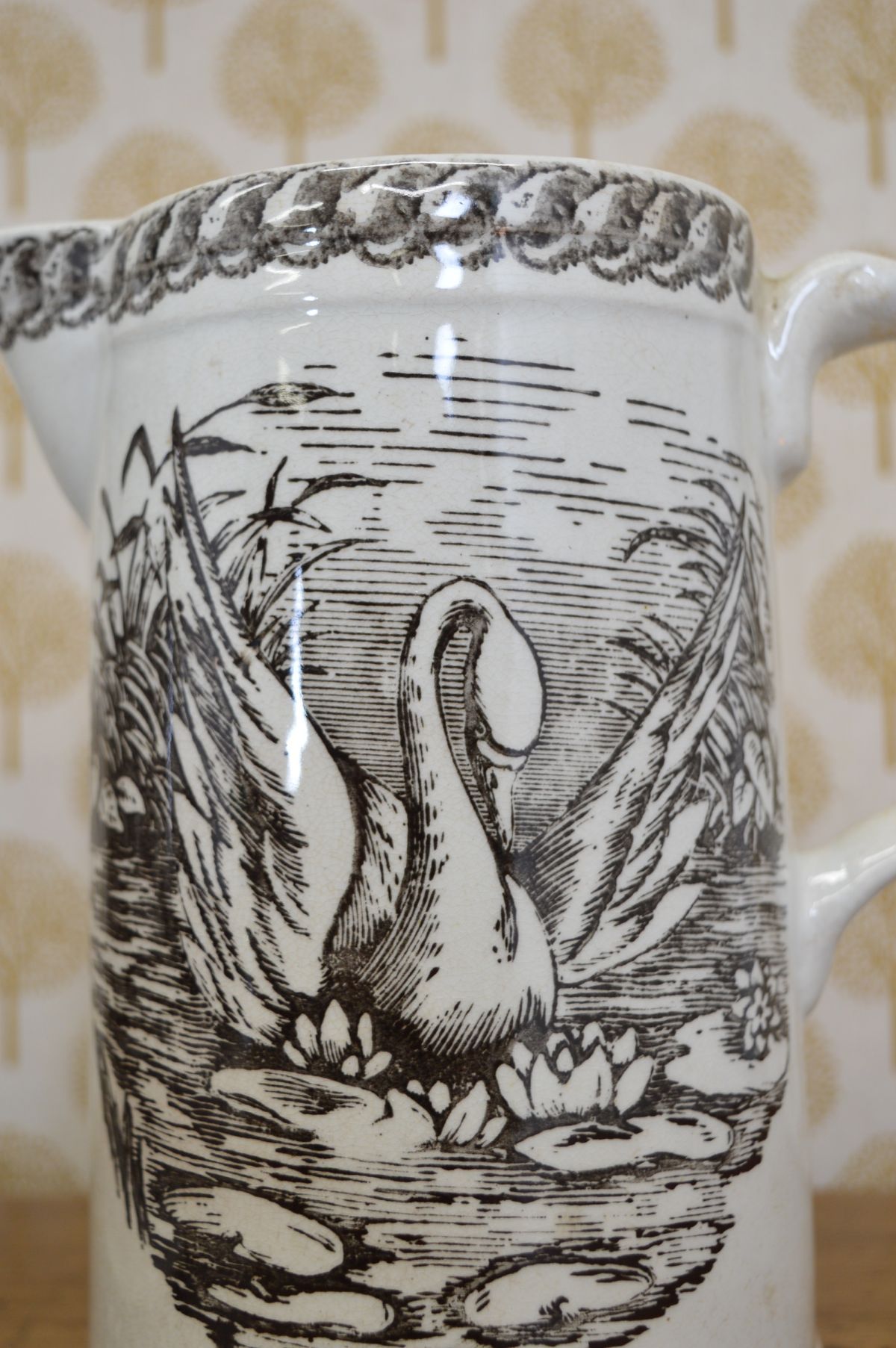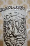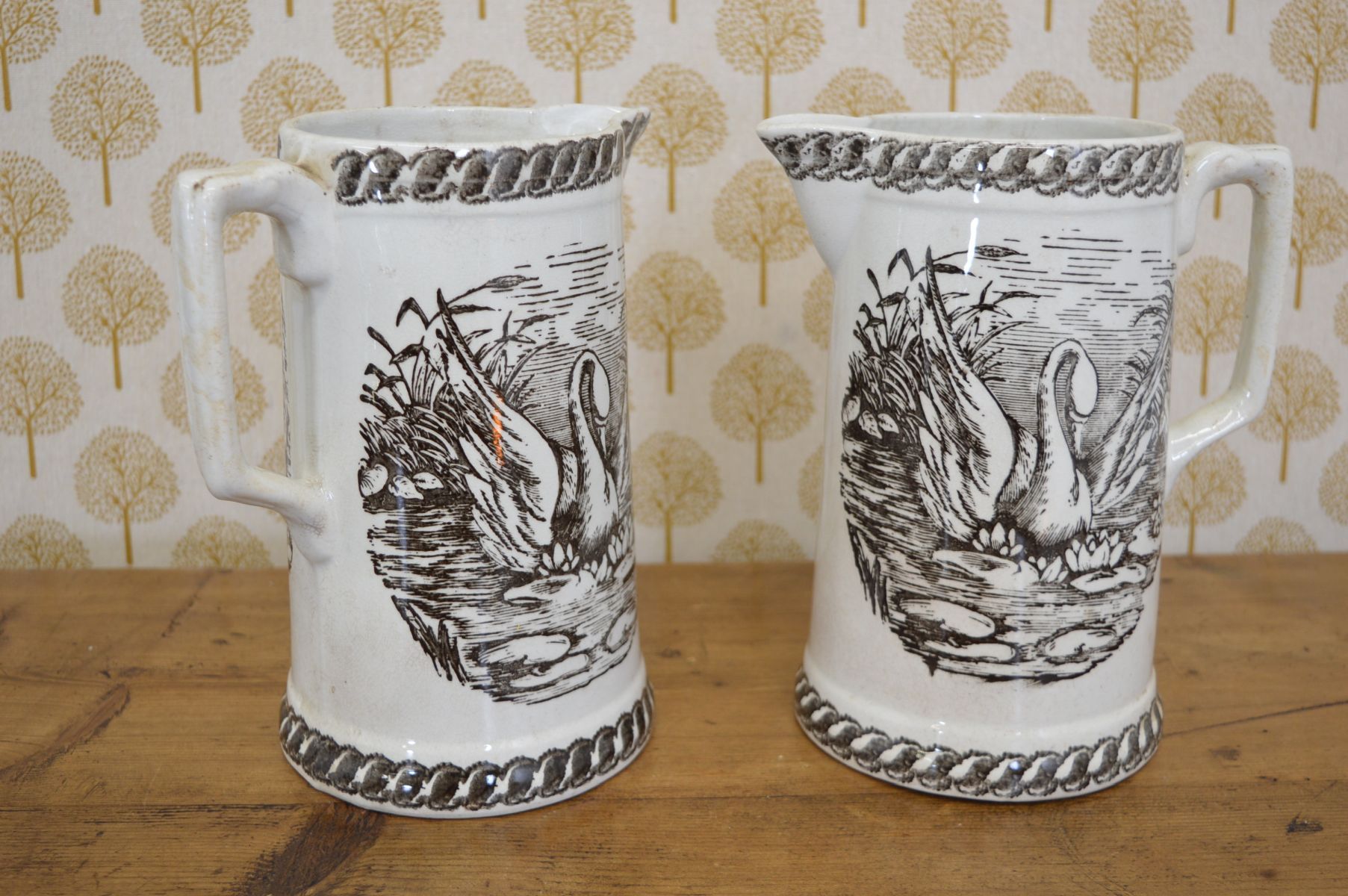 Pair of ceramic milk jugs decorated with swan motifs, each with shaped rim and loop handle. Glazed finish.