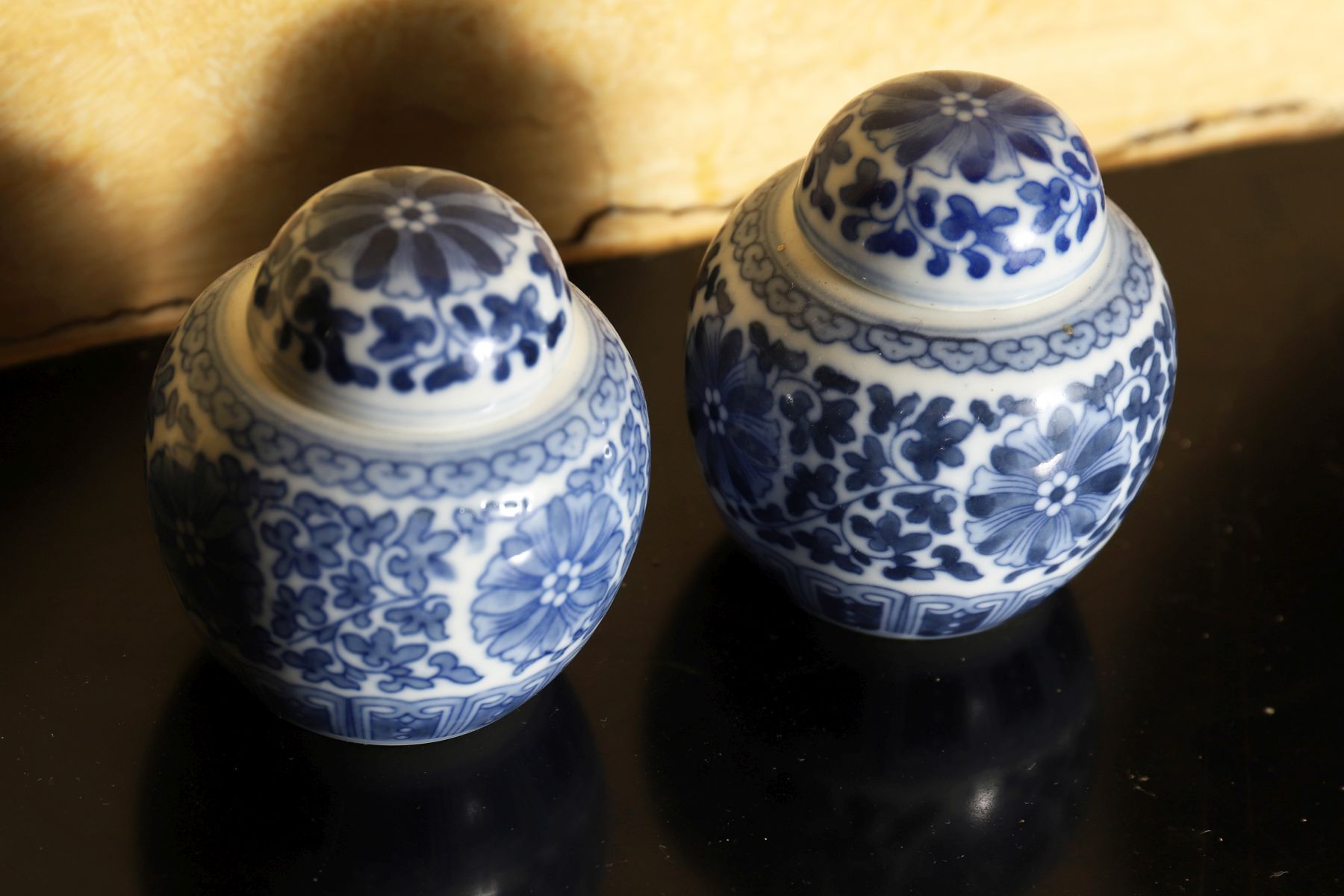 Each of baluster form with domed cover, decorated in underglaze blue with floral motifs.