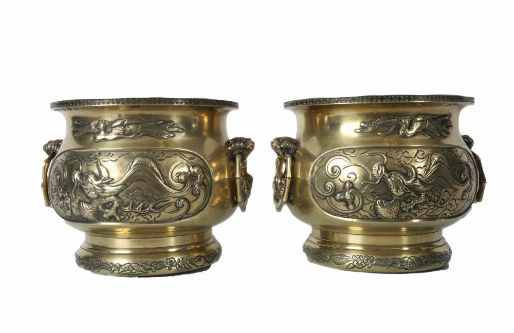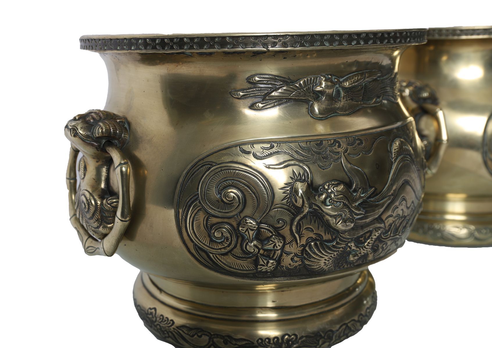 A pair of finely cast Chinese bronze jardinieres, each with repoussé dragon and phoenix decoration in high relief, and ornate borders.