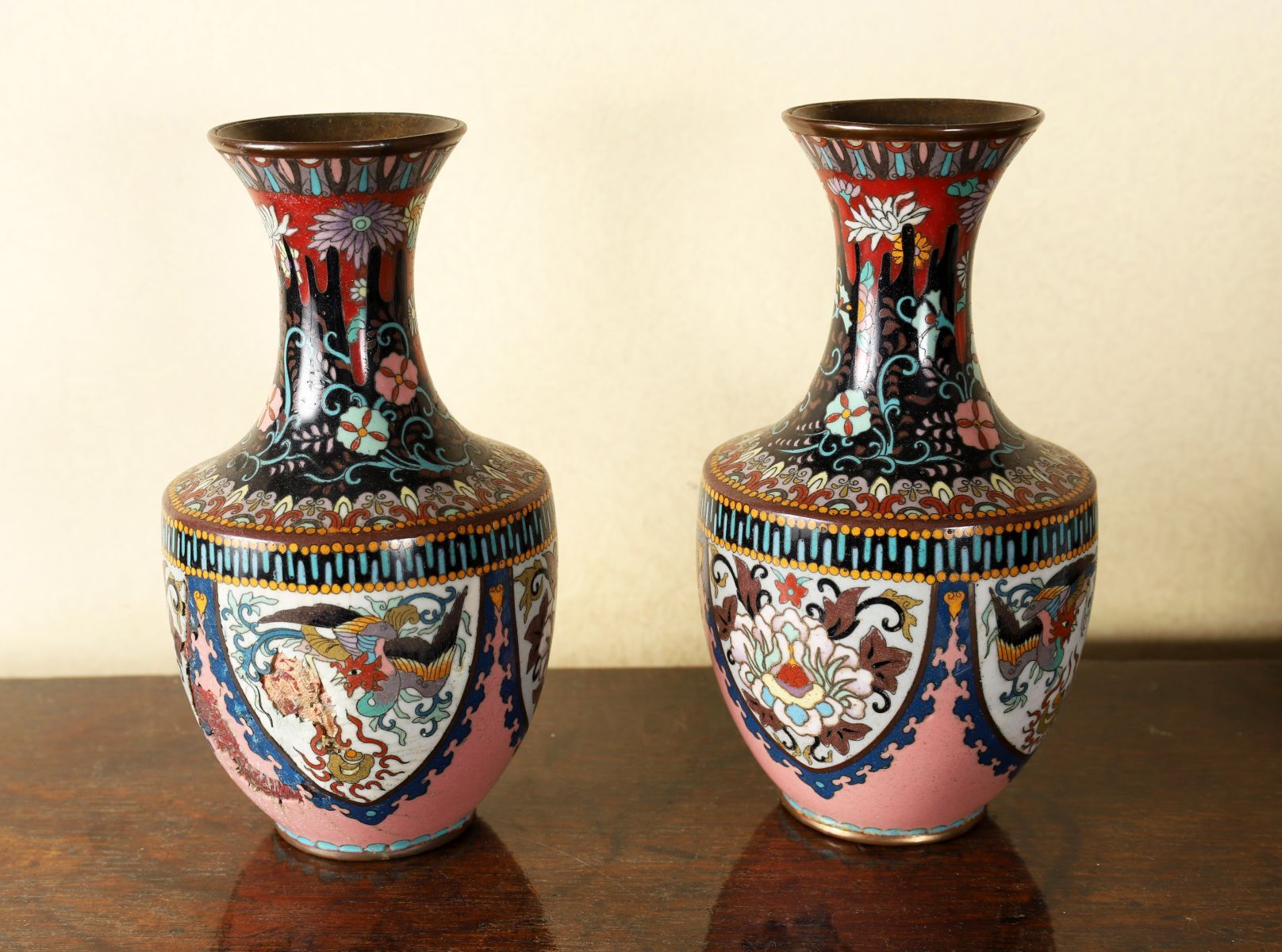 Pair of Chinese cloisonné enamelled vases, each of baluster form, decorated with stylised floral motifs and scrolling foliate designs reserved against coloured grounds. The neck and body further enriched with geometric banding. The interior and base glazed. Colours remain vibrant, with surface wear and small areas of fritting consistent with age.