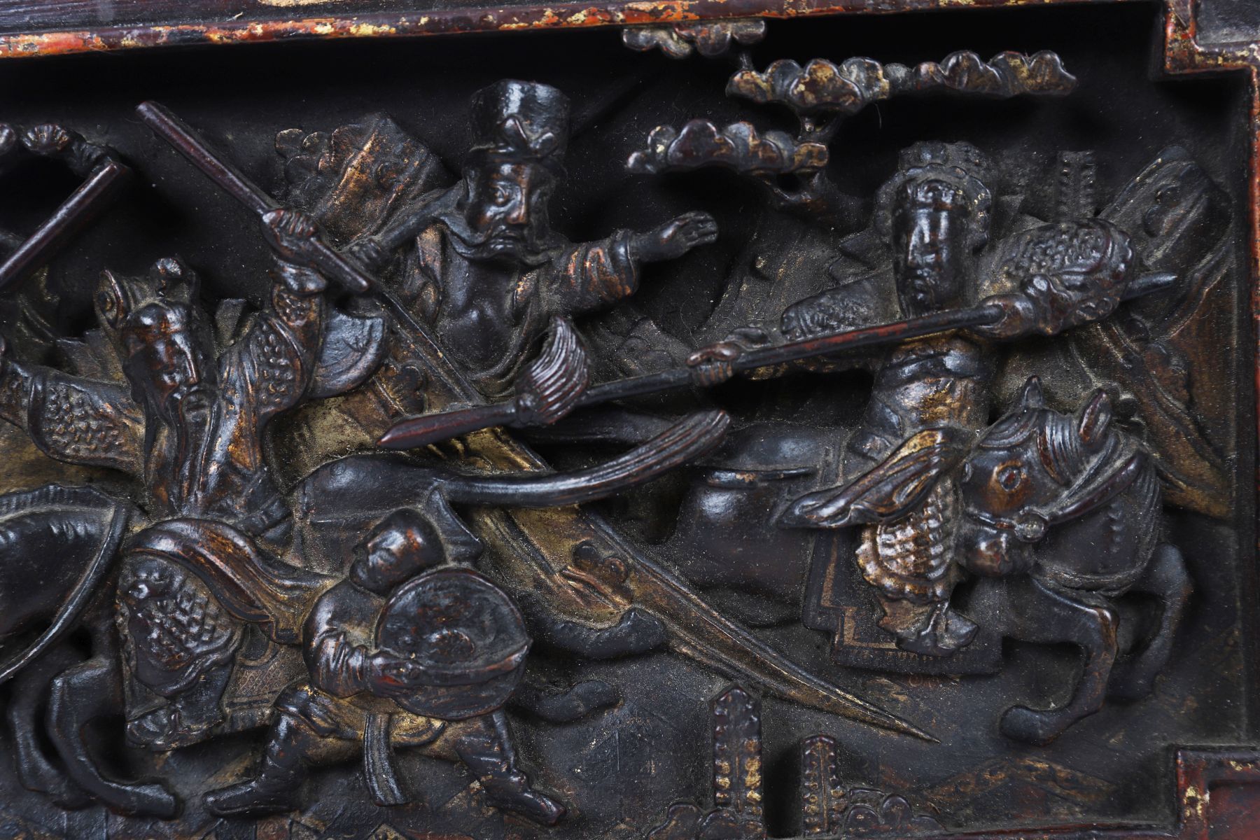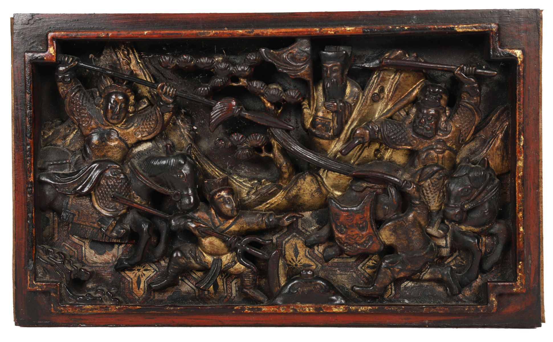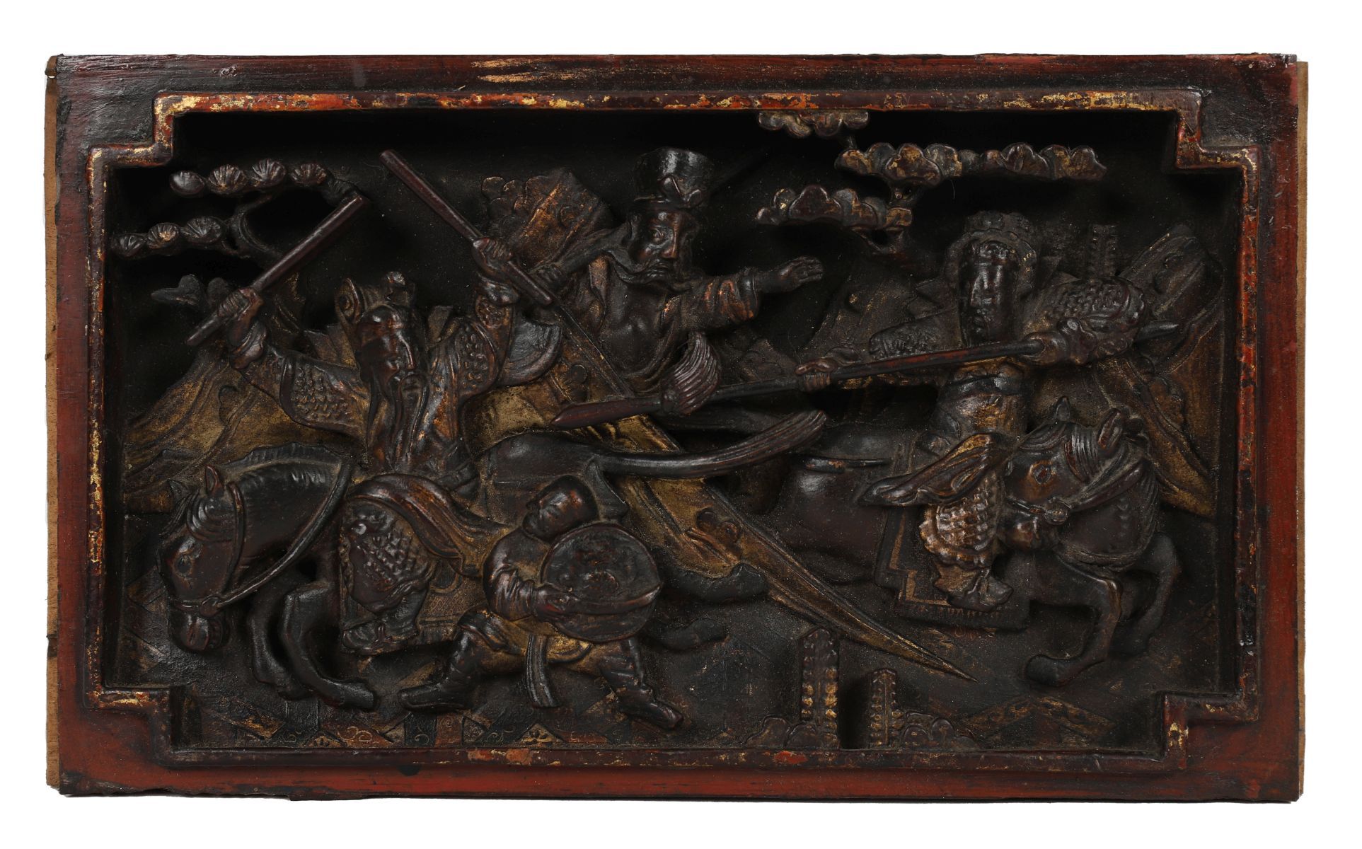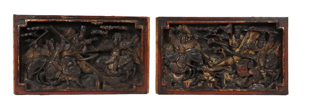 A pair of Chinese gilt lacquered plaques, 18th/19th century, carved in relief with scenes from Romance of the Western Chamber, depicting mounted warriors and attendants within rectangular frames.