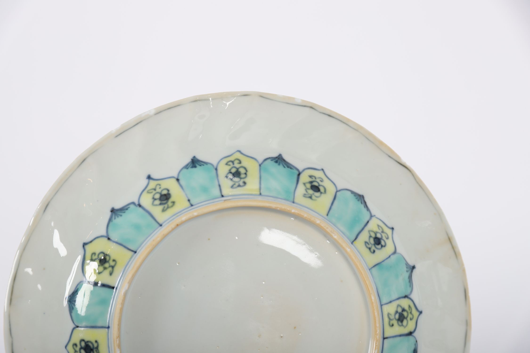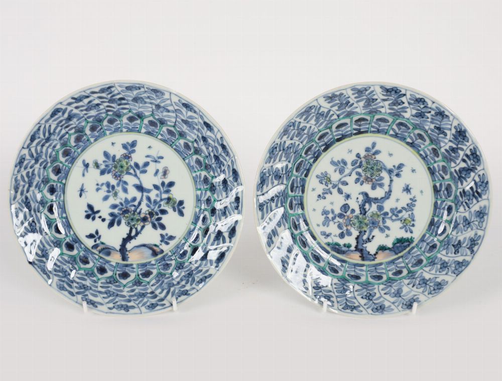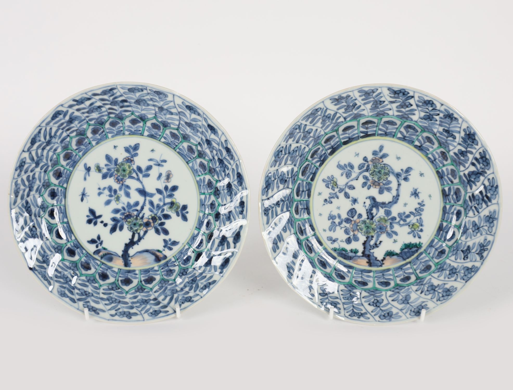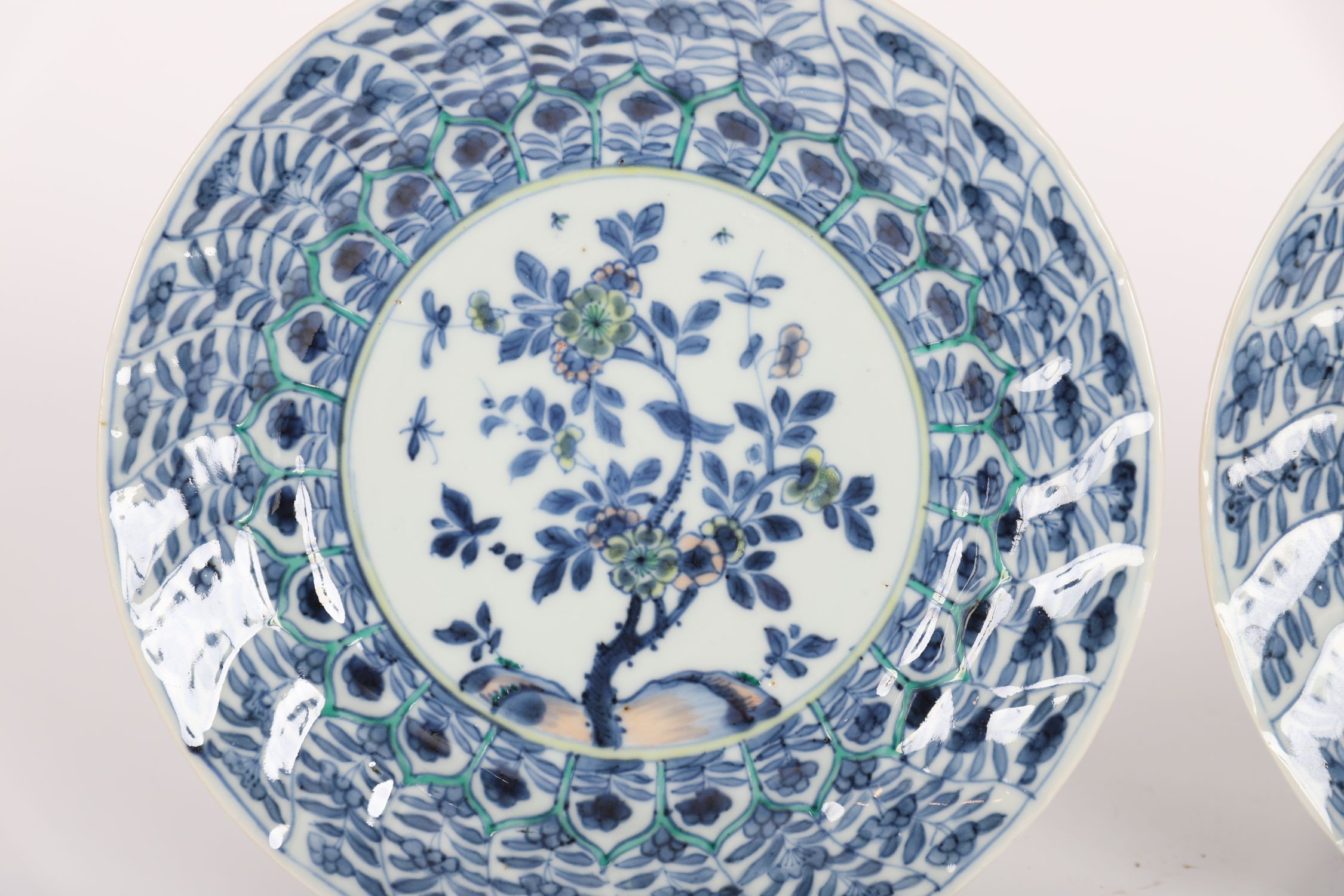 A pair of Chinese porcelain dishes, each centred with a floral spray within a broad border of alternating stylised lotus petals and foliate panels. Painted in a palette of underglaze blue with overglaze green and black enamels.
