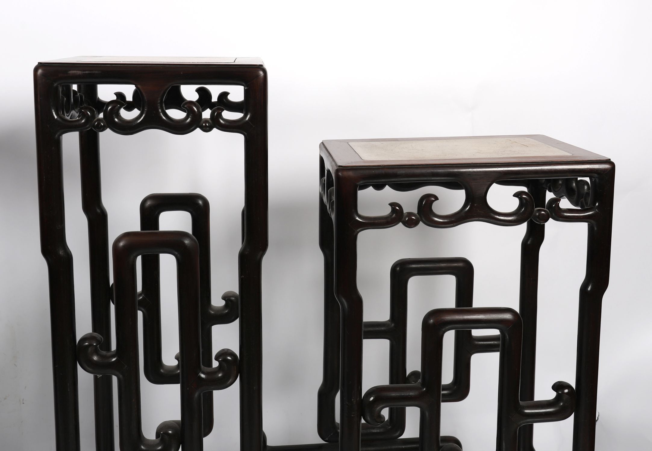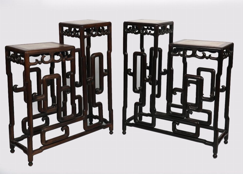 fashioned in exotic hardwood and constructed with fine mortise-and-tenon joinery. The square tops rest above complex pierced openwork aprons formed from interlocking geometric motifs, in the scholar's taste. Each with rich dark patination.
