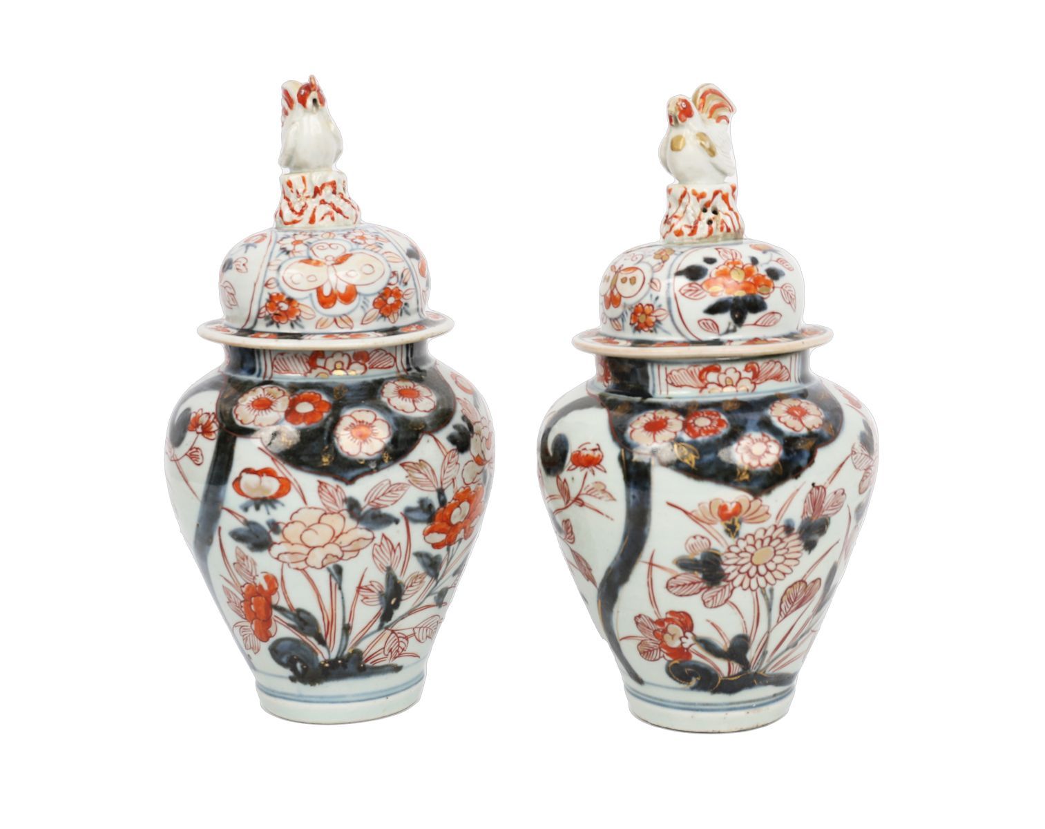 A pair of Chinese porcelain lidded vases, each decorated in underglaze blue and iron red with gilt highlights in the Imari palette, the domed covers surmounted by cockerel finials.