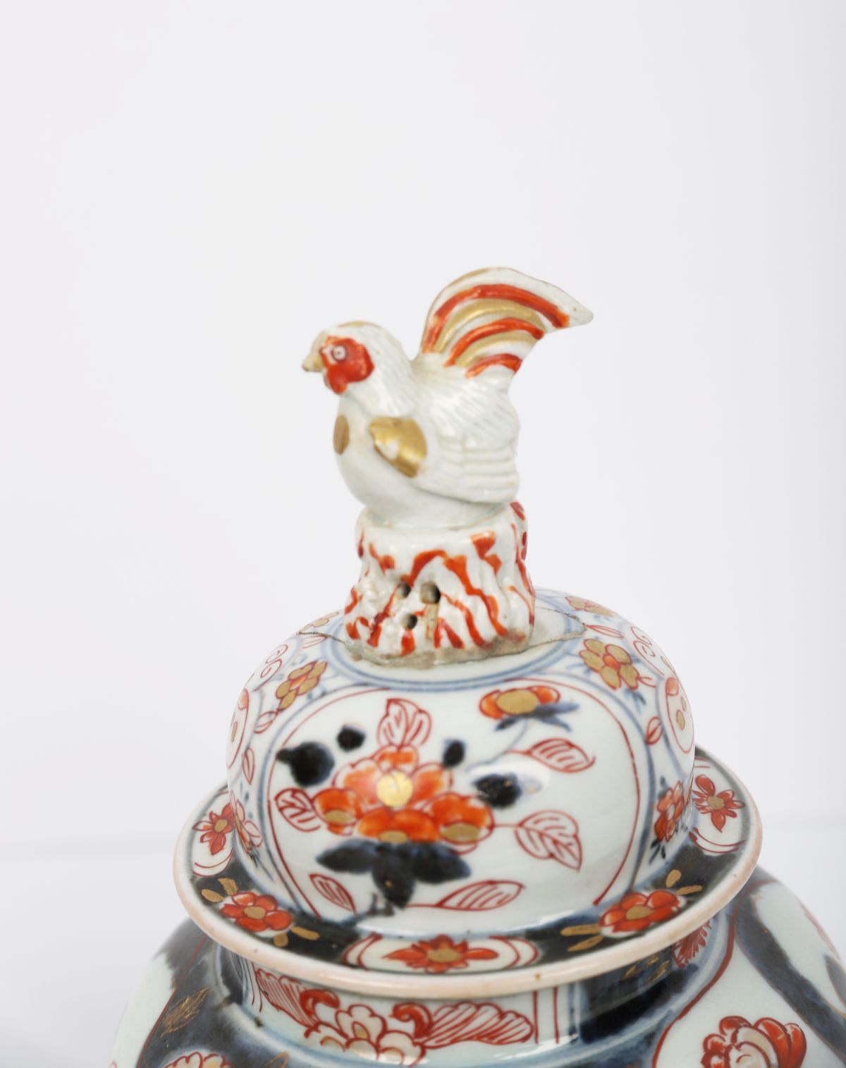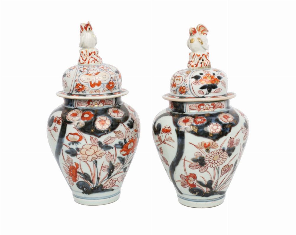 Lot 786 PAIR OF CHINESE QING IMARI VASES WITH COCKEREL FINIALS
