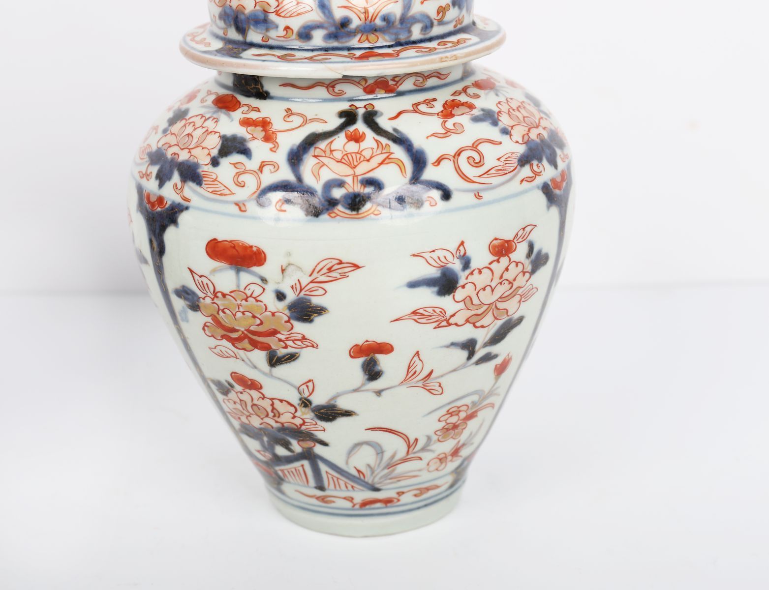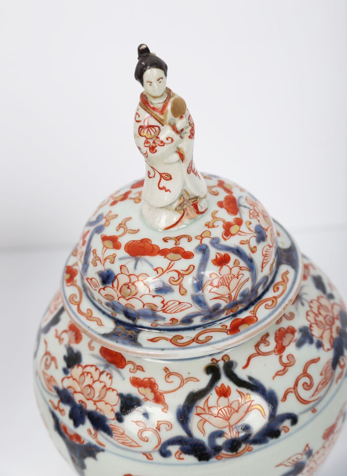 Lot 760 PAIR OF CHINESE QING IMARI VASES WITH FIGURAL FINIALS