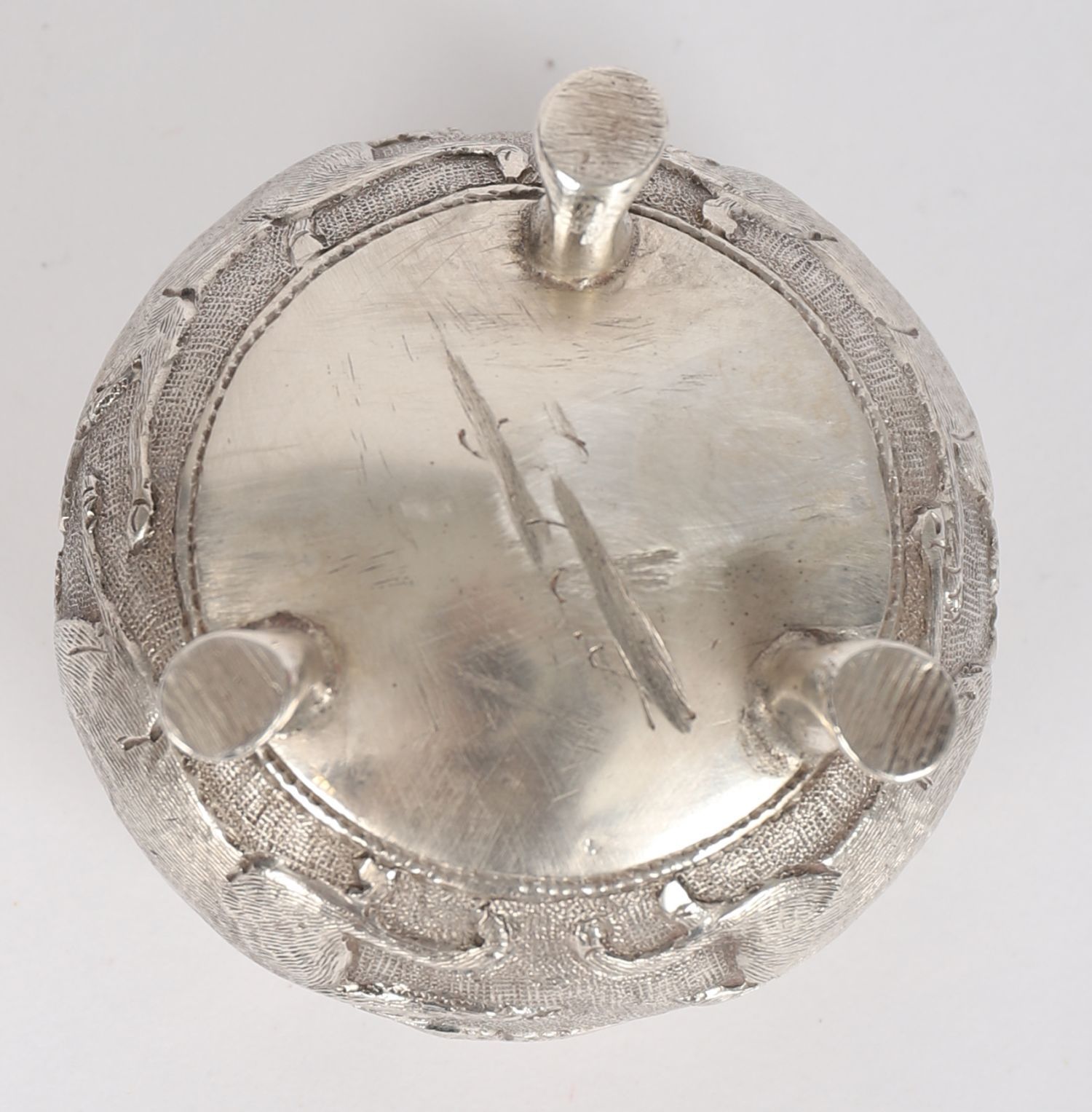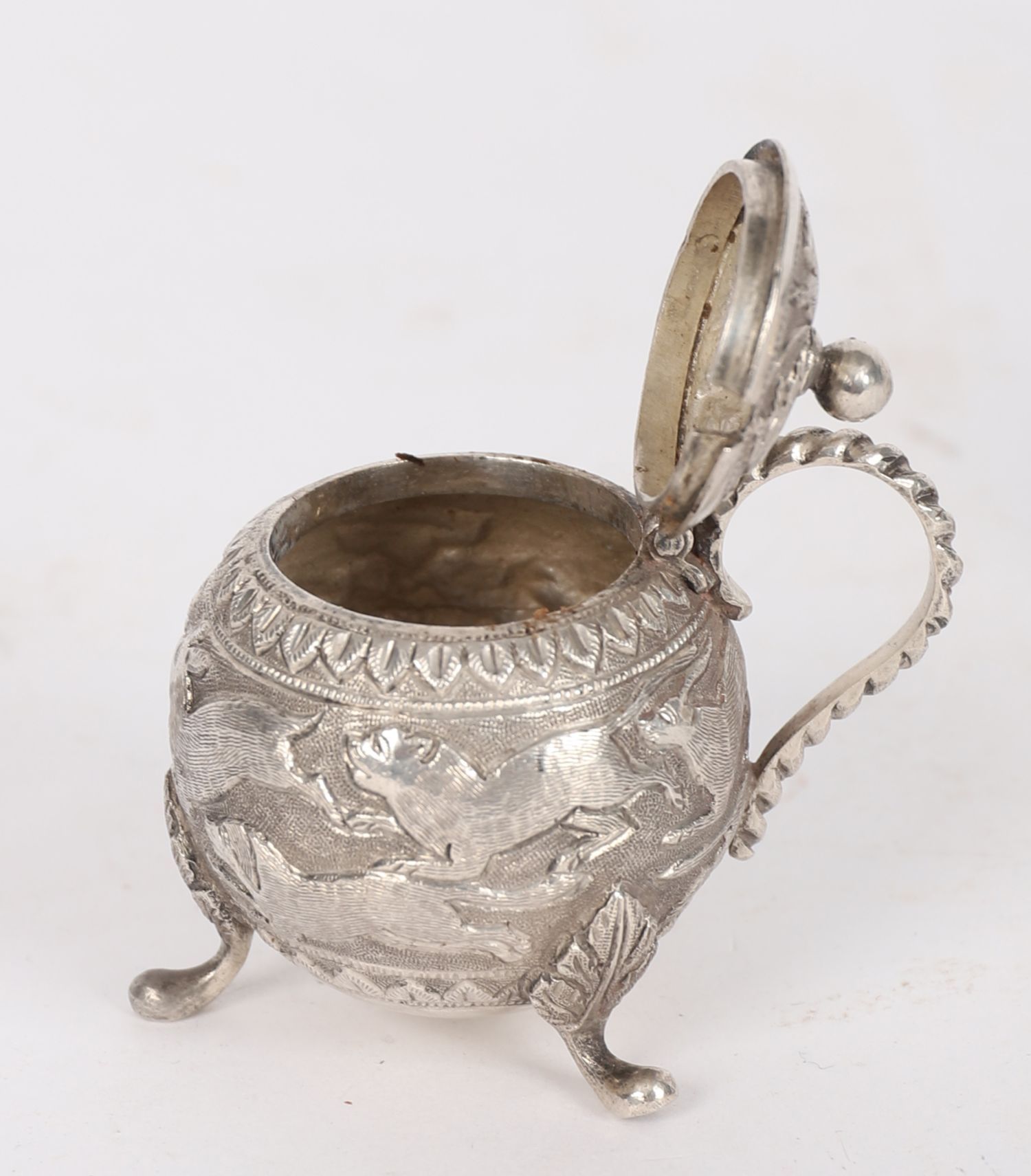 each raised on tripod feet and decorated with relief scenes of figures and foliage, complete with detachable lids.