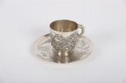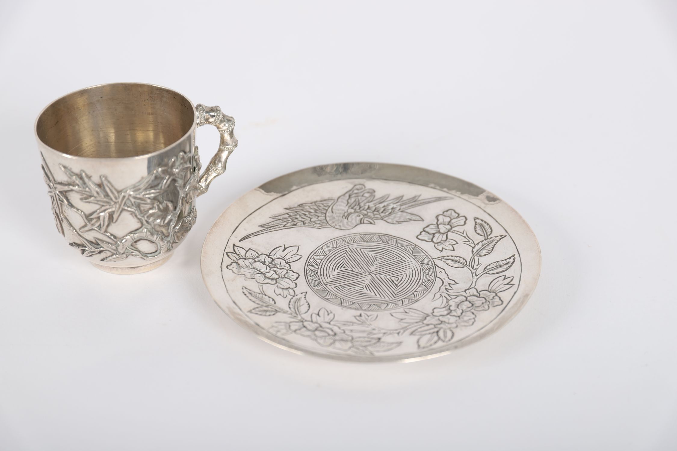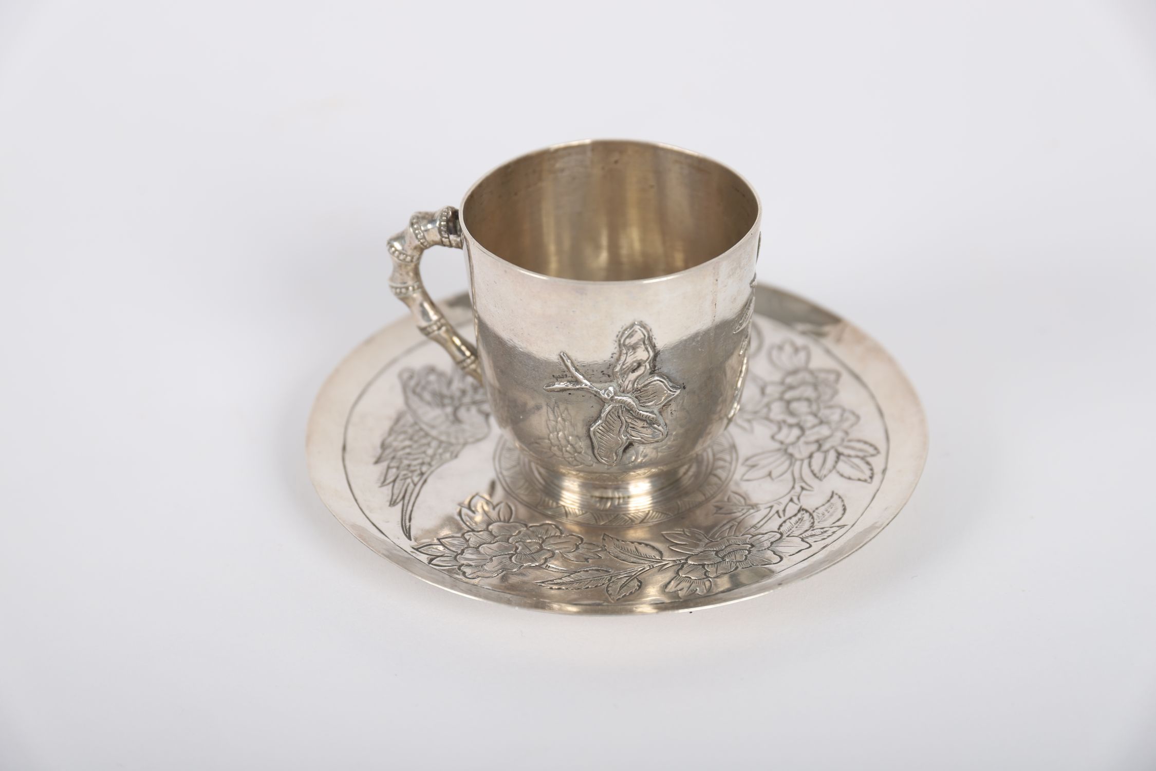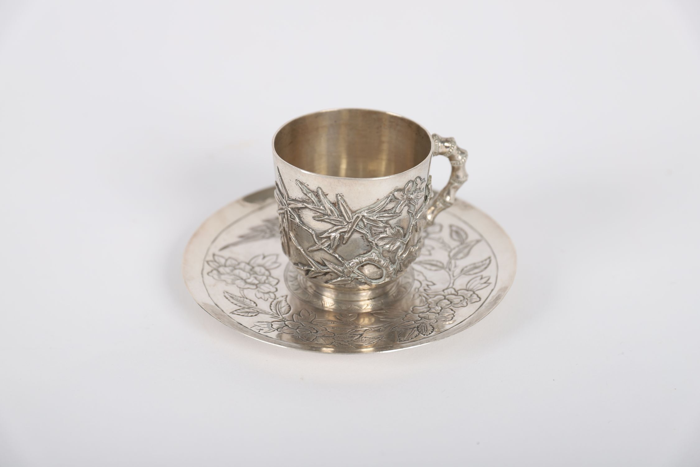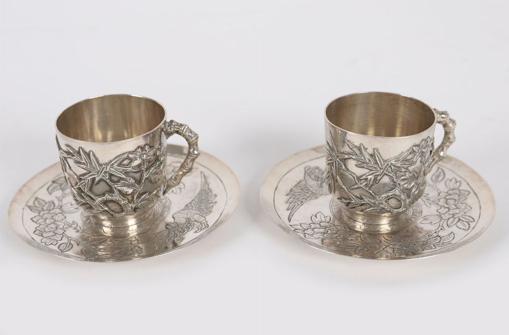 A pair of Chinese export silver demitasse cups and matching saucers, each finely embossed with peony blossoms, bamboo, and foliate decoration. Each cup with a bamboo-form handle.