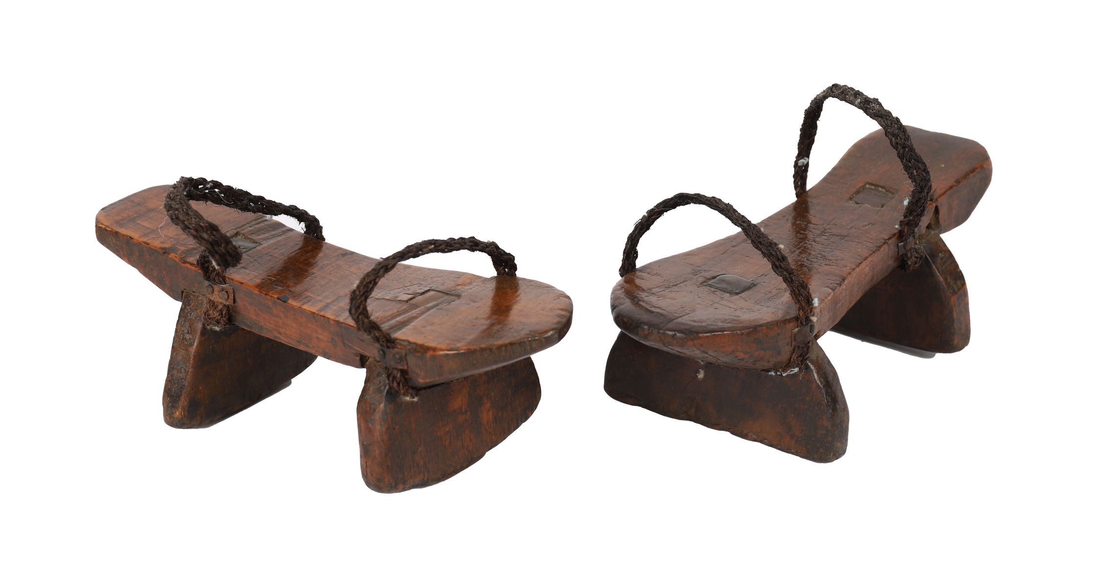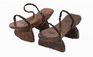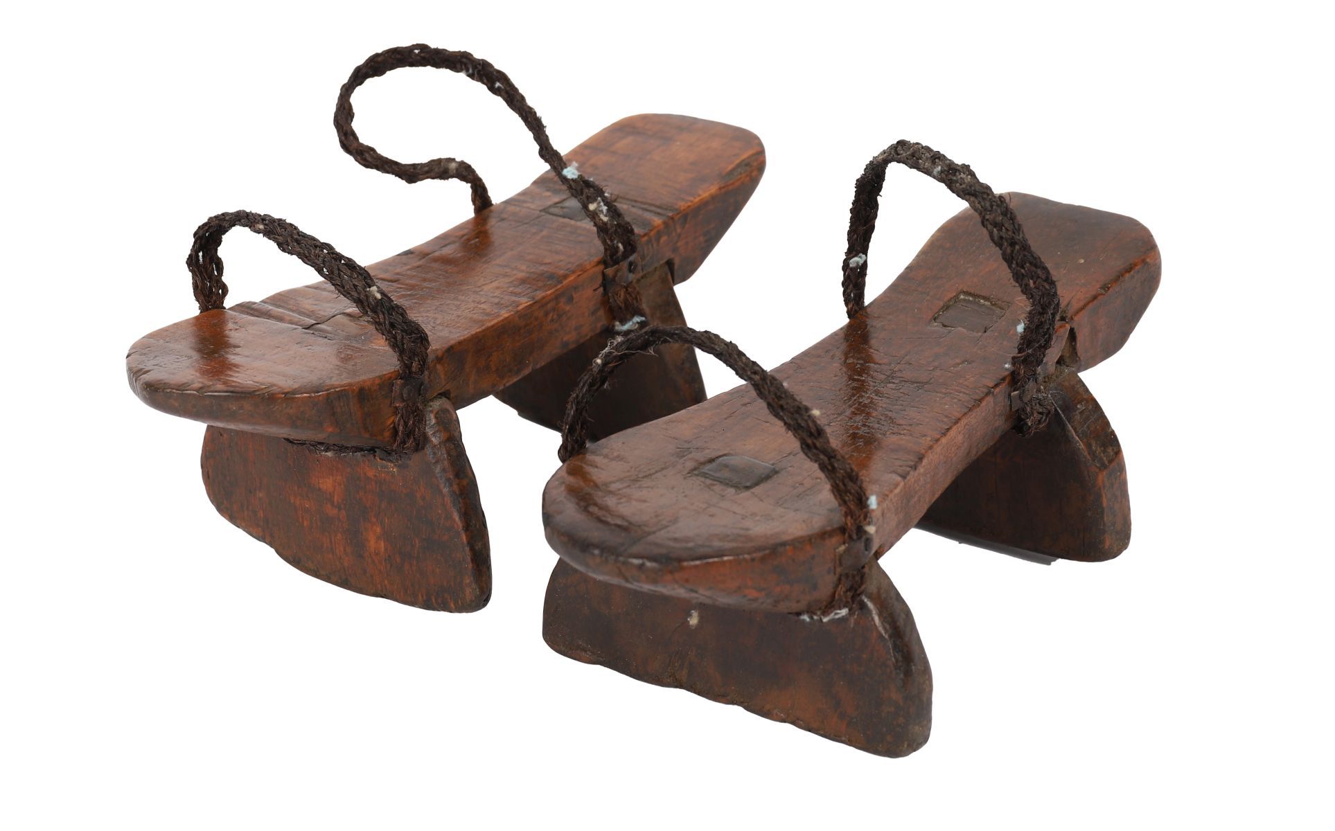A pair of traditional Chinese wooden sandals (geta type), each raised on twin supports and fitted with rope thongs.