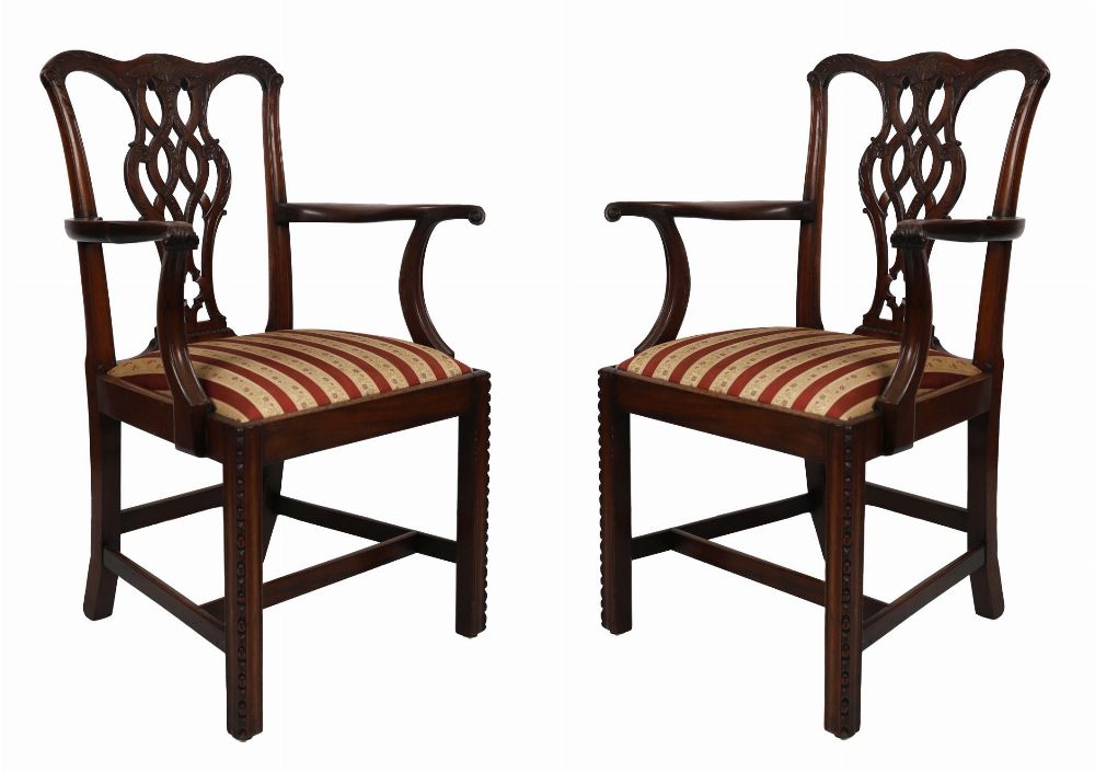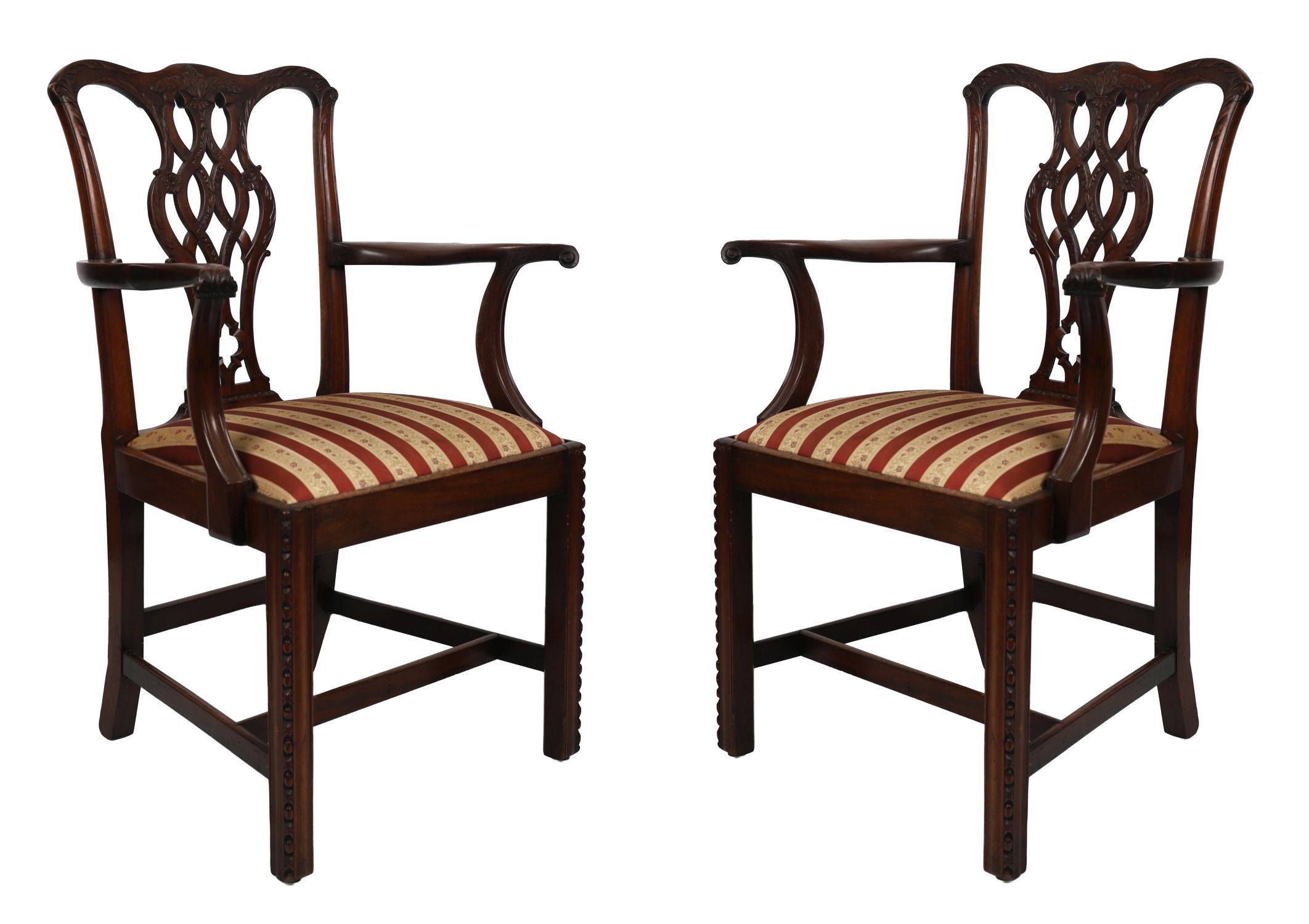 A pair of finely carved Chippendale style mahogany elbow chairs, each with an acanthus-leaf carved serpentine crest rail above a pierced, ribbon-carved, vase-shaped splat. The shaped arms curve elegantly to meet square chamfered supports. Upholstered drop-in seats with striped damask fabric, raised on square moulded legs united by stretchers. Crisp carving and generous proportion throughout.