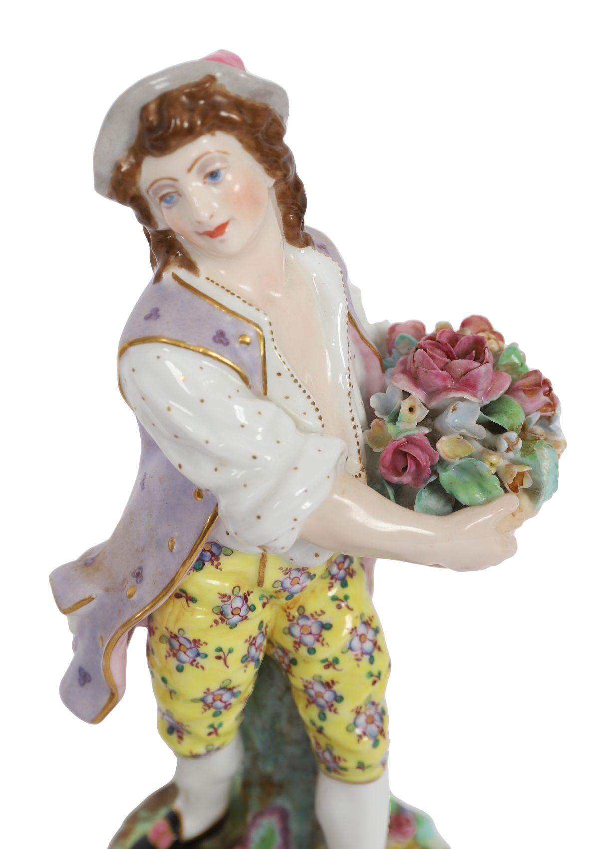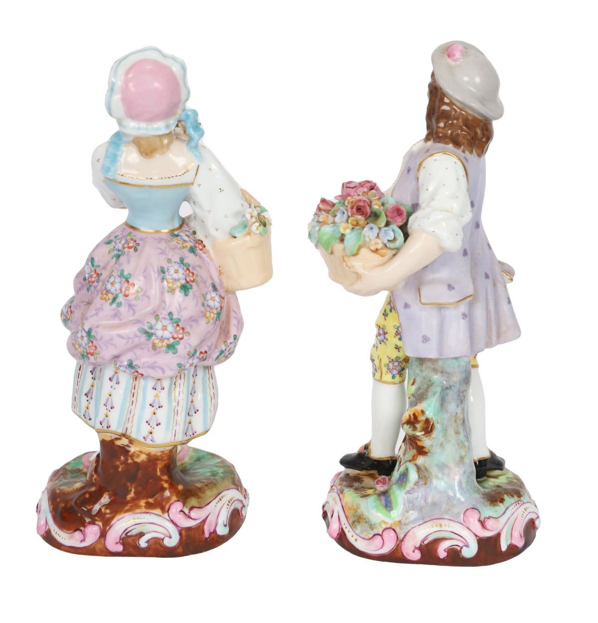 A pair of Continental porcelain figures of a young man and woman, each holding baskets of flowers, raised on shaped bases.