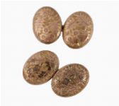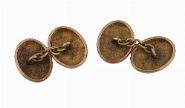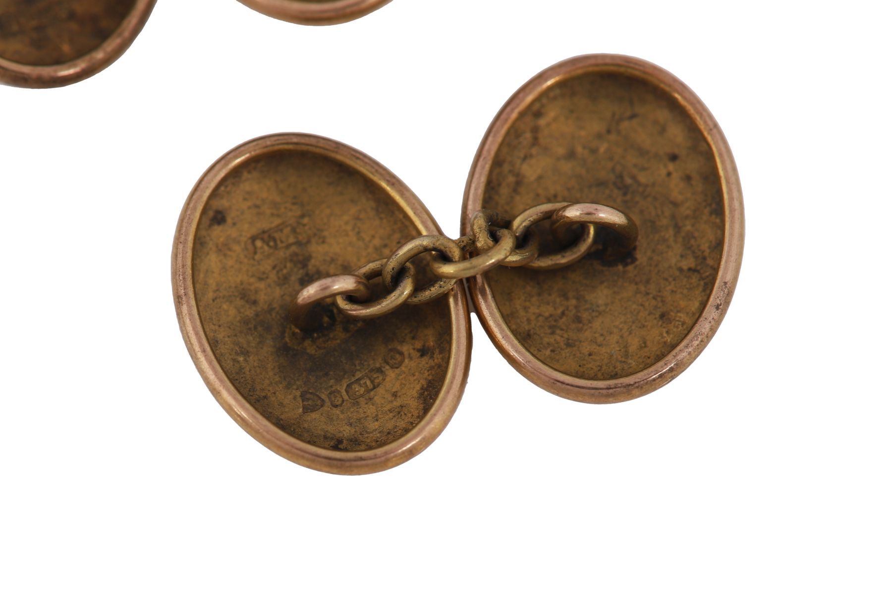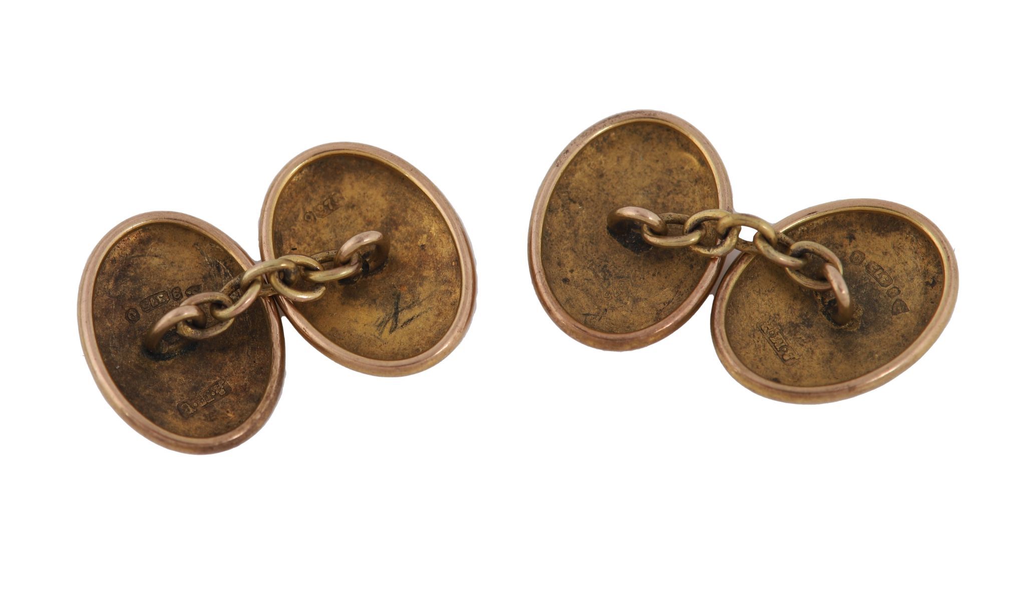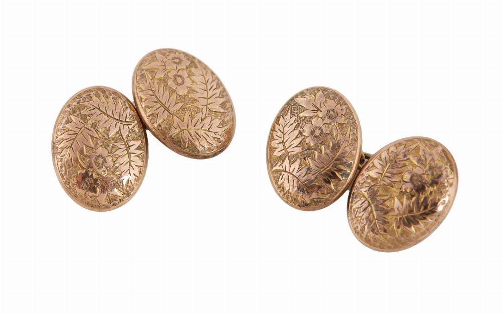 A pair of oval yellow metal cufflinks, the fronts with engraved foliate decoration in bright-cut style. Chain link fittings.