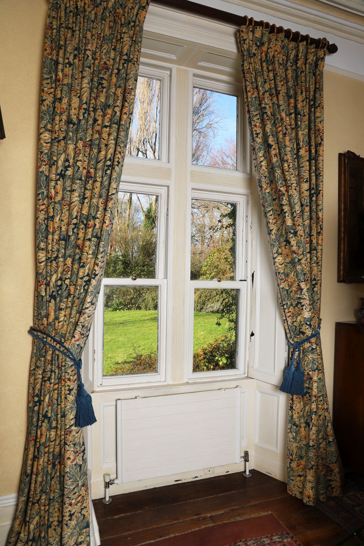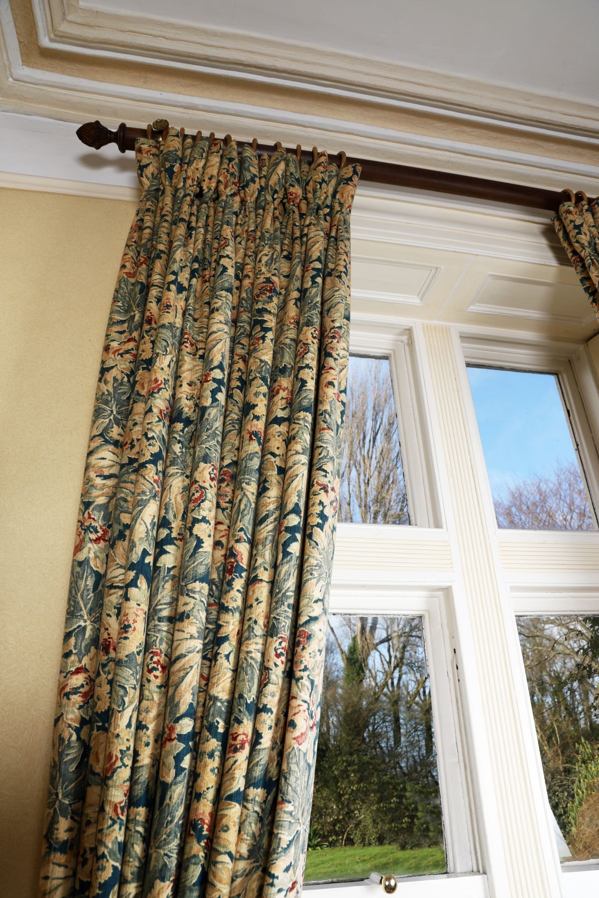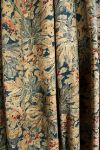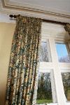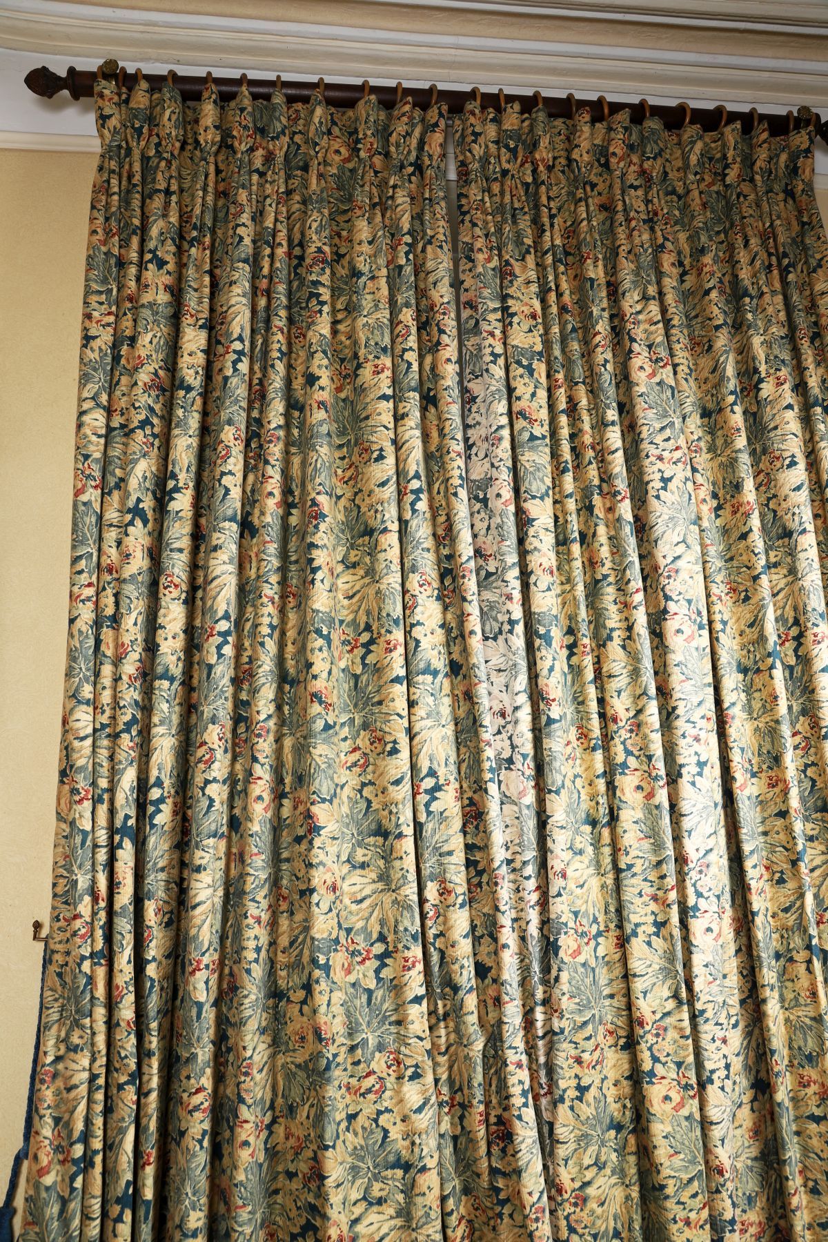Pair of patterned curtains, lined and interlined, with floral decoration in complementary tones, together with matching tiebacks. 20th century.