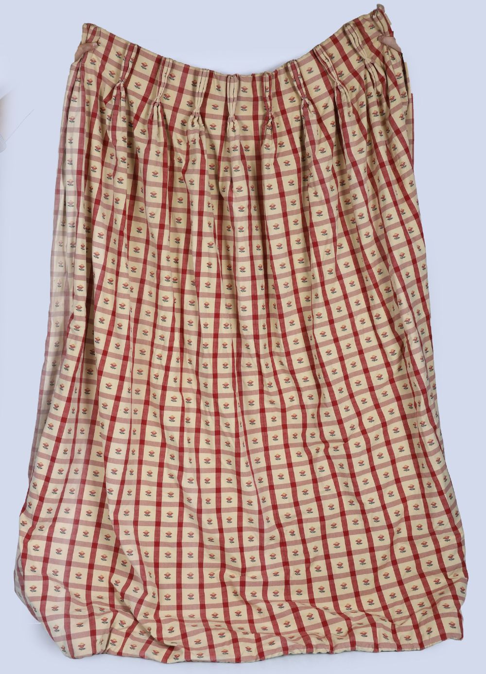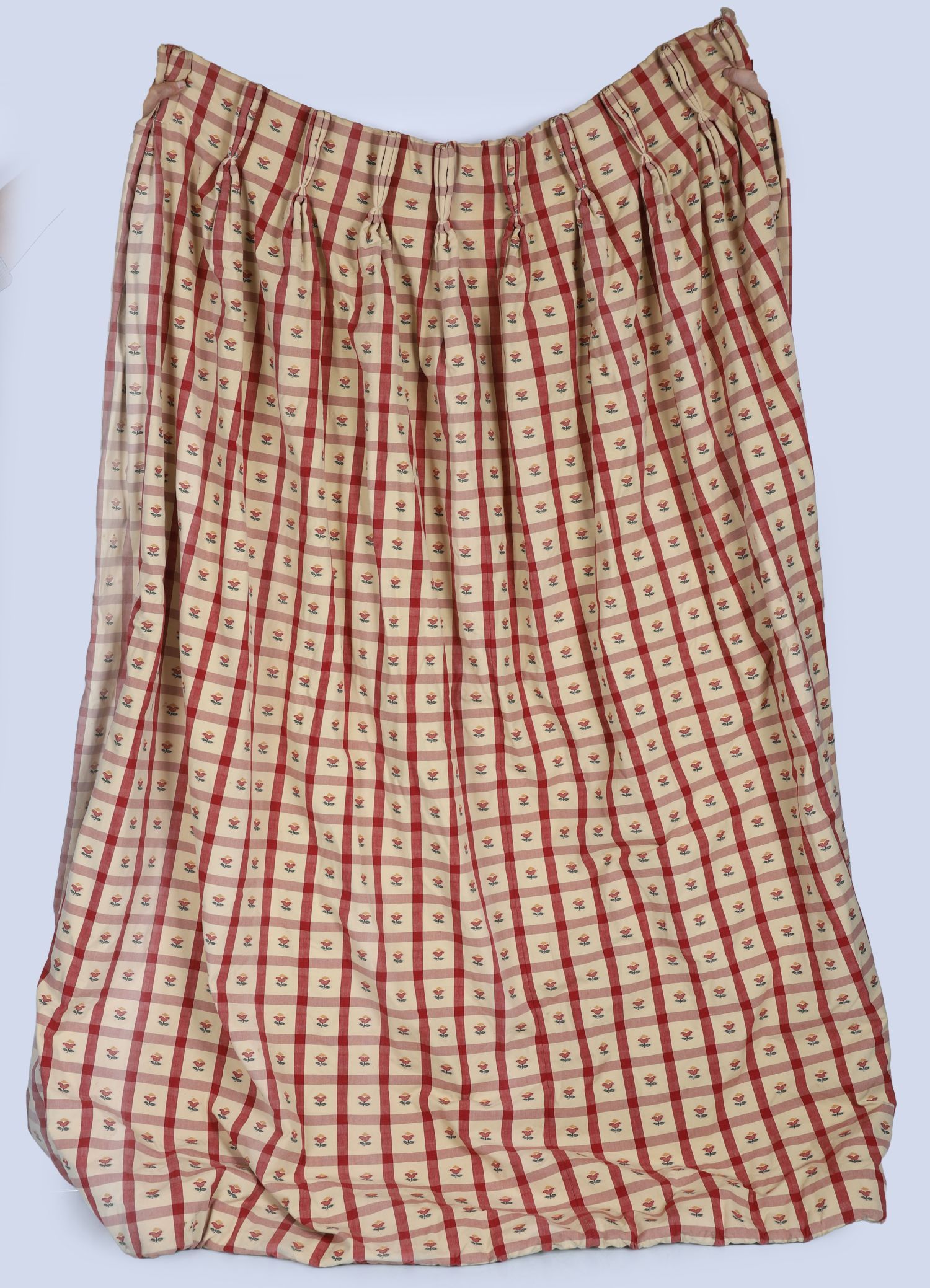 Ochre and red check ground with small floral motifs, lined and interlined.
